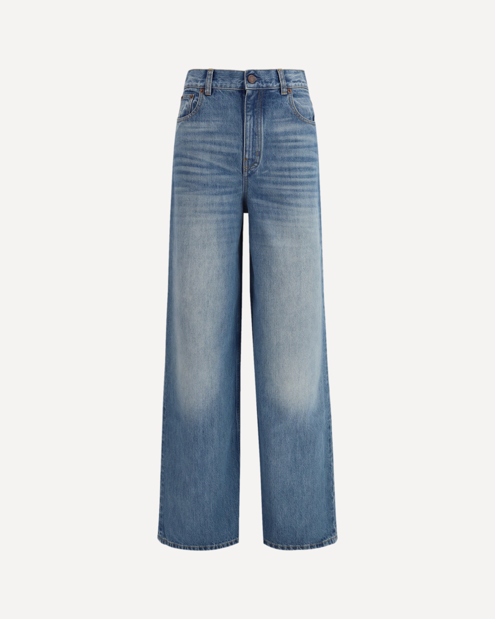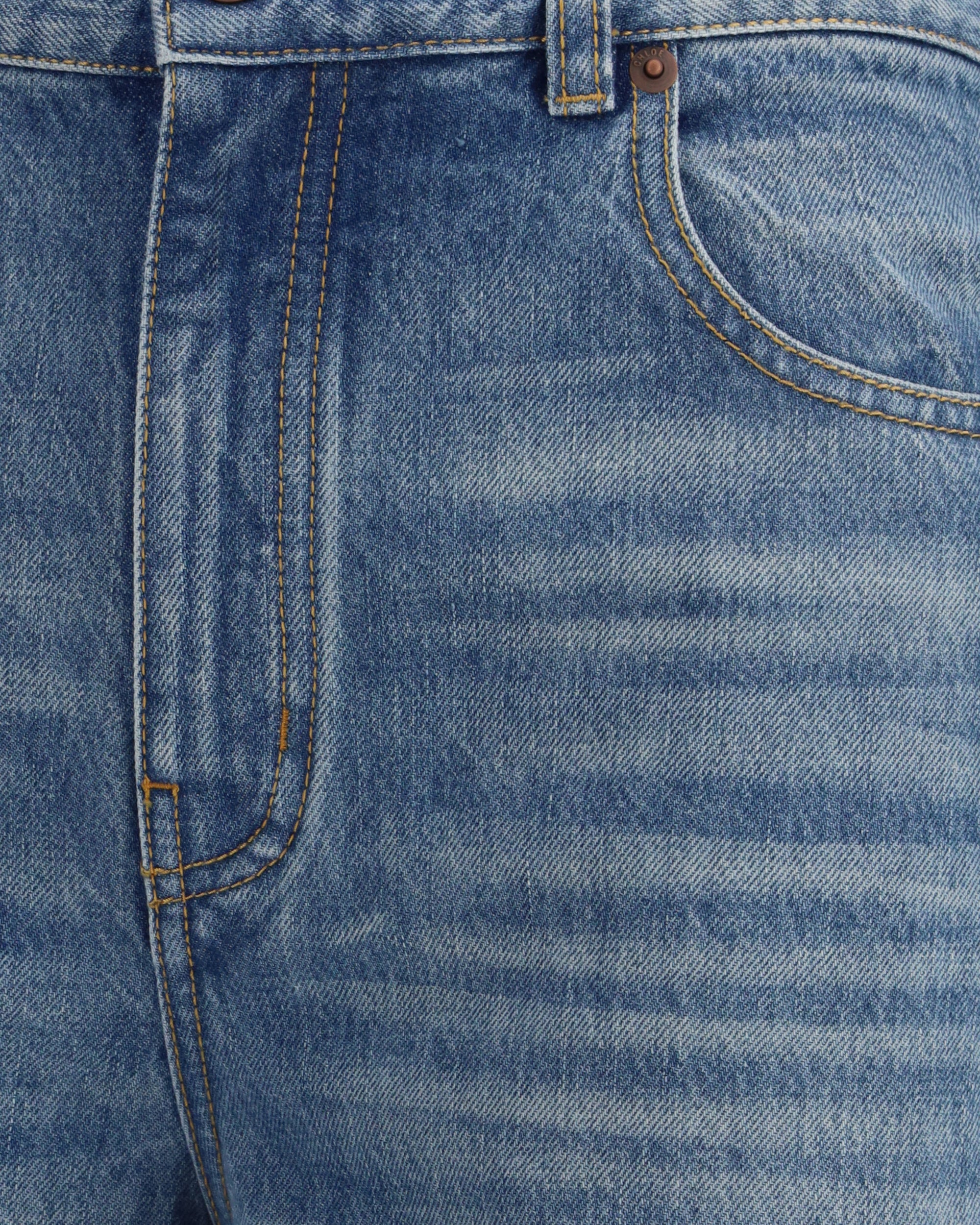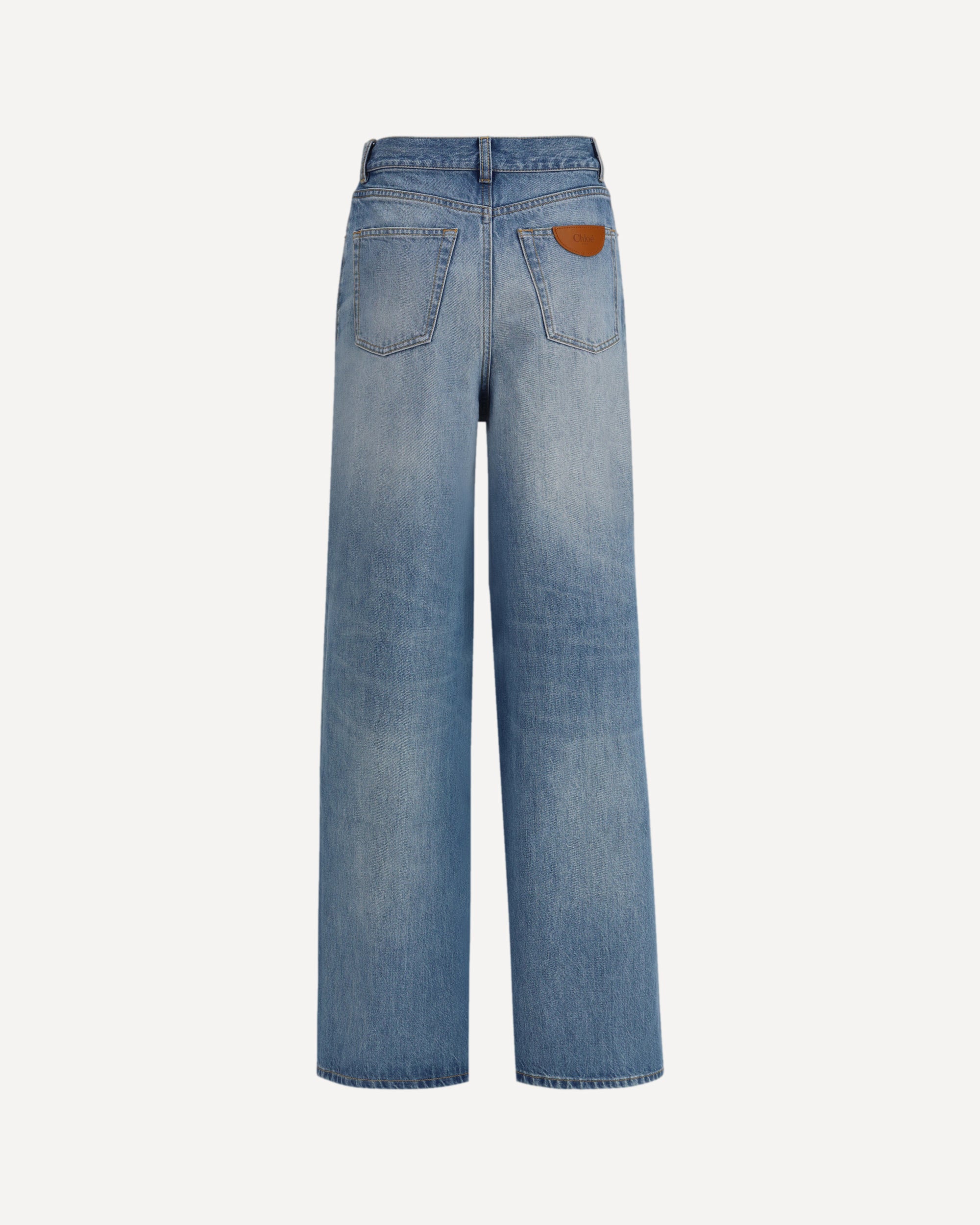 The High-Rise Wide-Leg Jeans by Chloé feature a structured, wide-leg silhouette designed to highlight the high waist and the clean fall of the leg. Crafted from organic cotton denim, they offer a firm hand and a naturally comfortable fit. The design includes a classic five-pocket construction with belt loops and a button-and-zip fastening. At the back, the leather logo label adds a refined signature detail. A versatile denim style conceived for modern, everyday elegance.