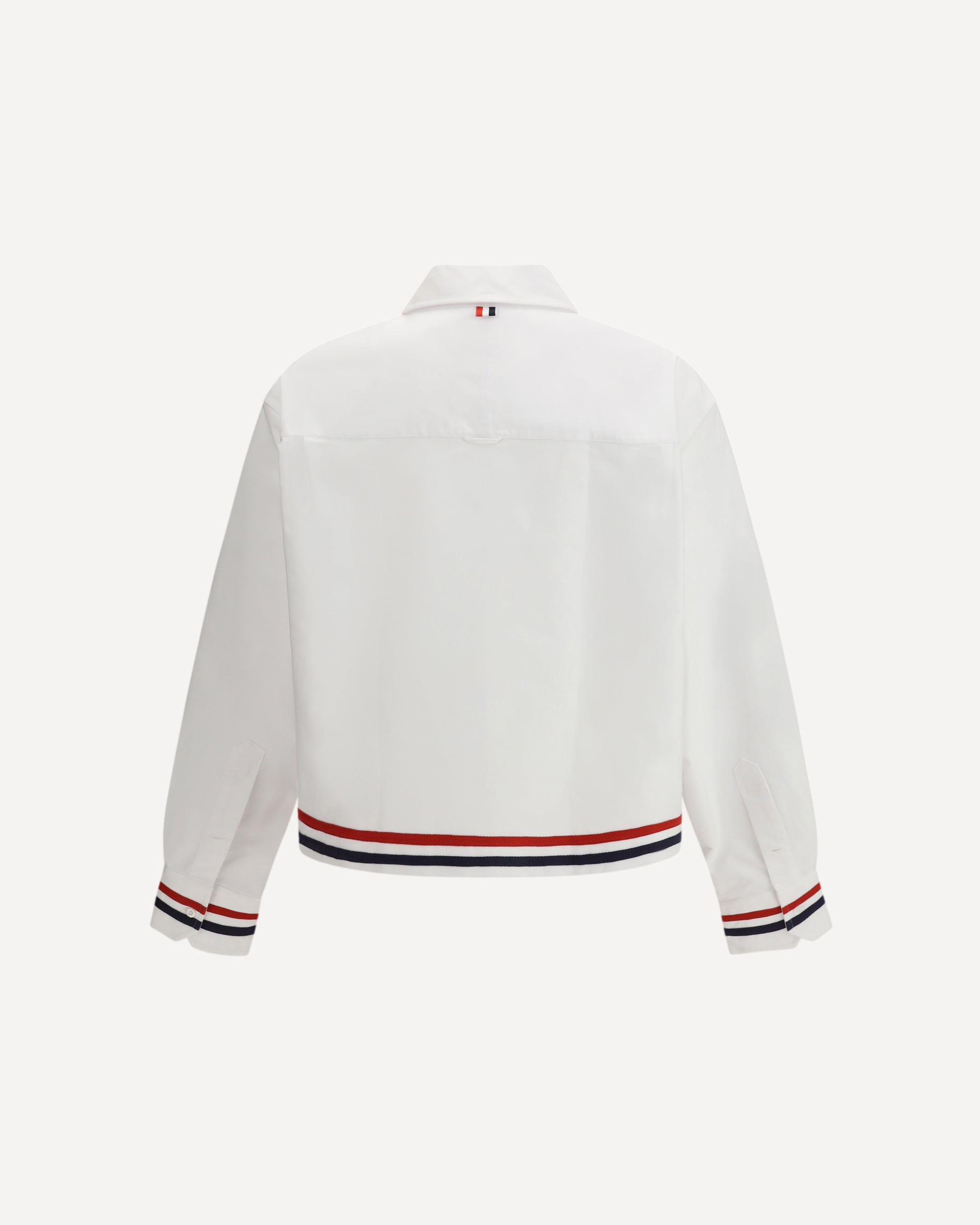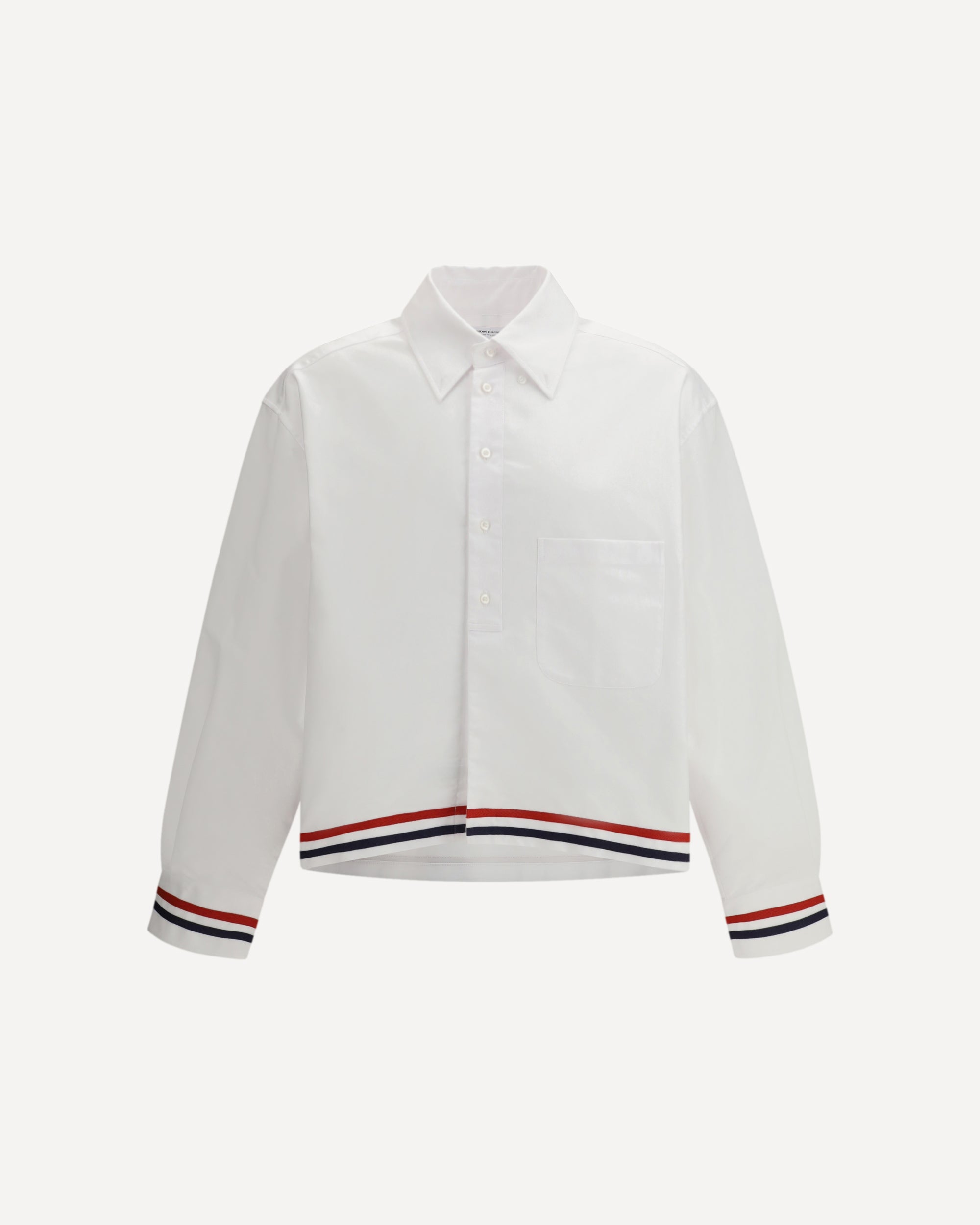 The cotton Shirt by Thom Browne is a unique and modern piece, with a rugby fit that gives it a comfortable yet structured cut. The classic collar and mid-torso button closure add a touch of traditional elegance, while the asymmetrical hem gives the design a contemporary accent. The iconic colored stripes on the cuffs and along the hem complete the look with a distinctive detail that echoes the brand's recognizable aesthetic, making this shirt a perfect balance between classic and innovative.