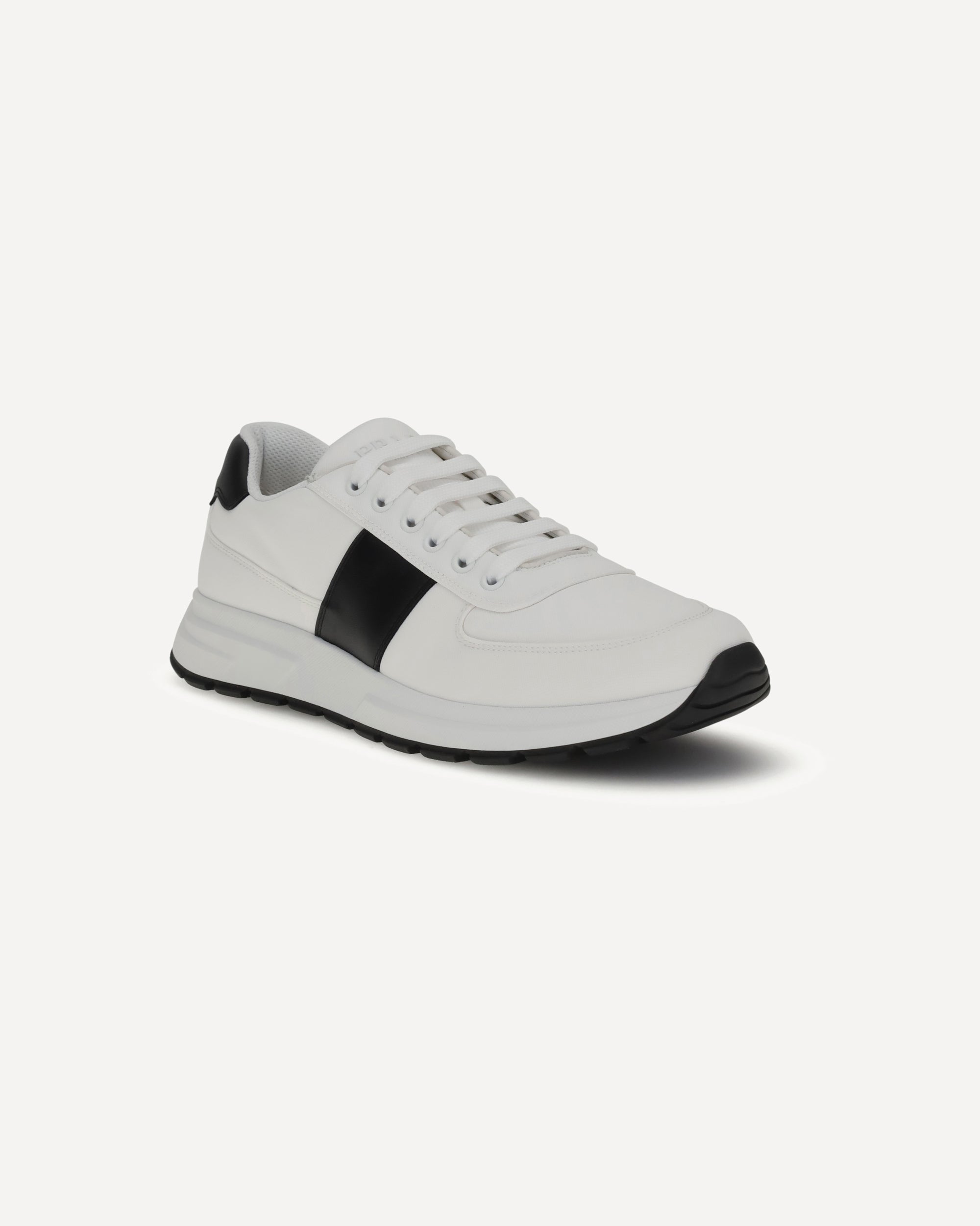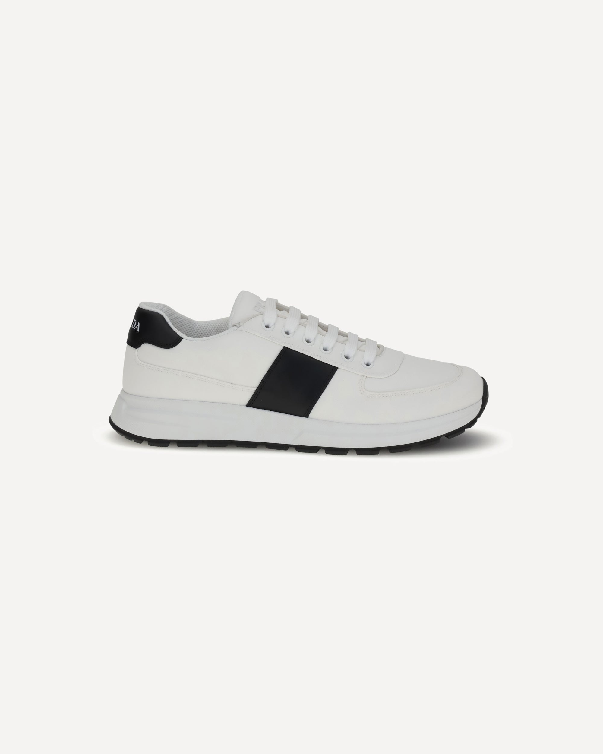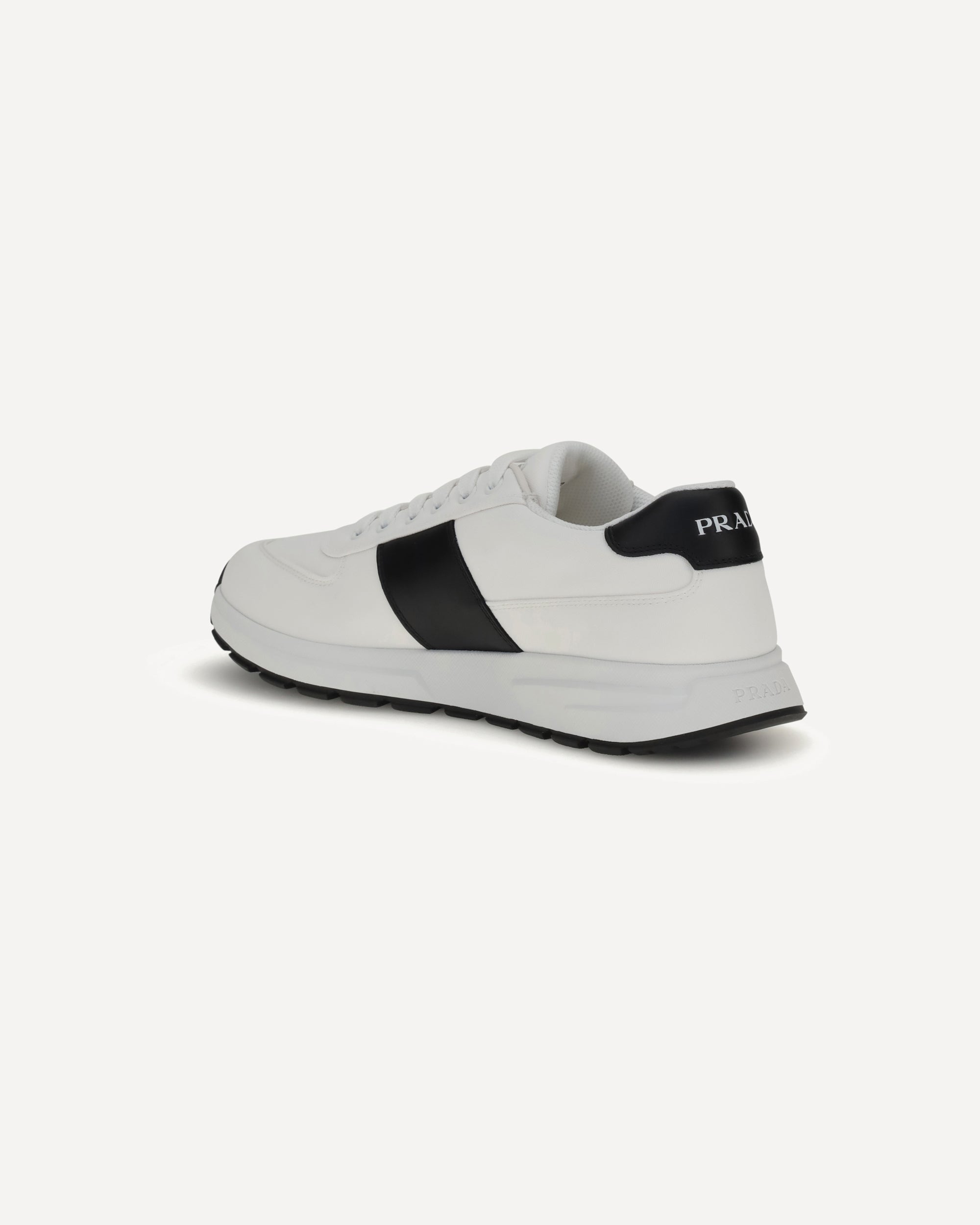 Prada's leather Sneakers feature a two-tone design that combines elegance and contemporary style. Featuring a lace-up closure and reinforced toe for added durability, they are complemented by the logo on the back, the brand's iconic and recognizable detail.
