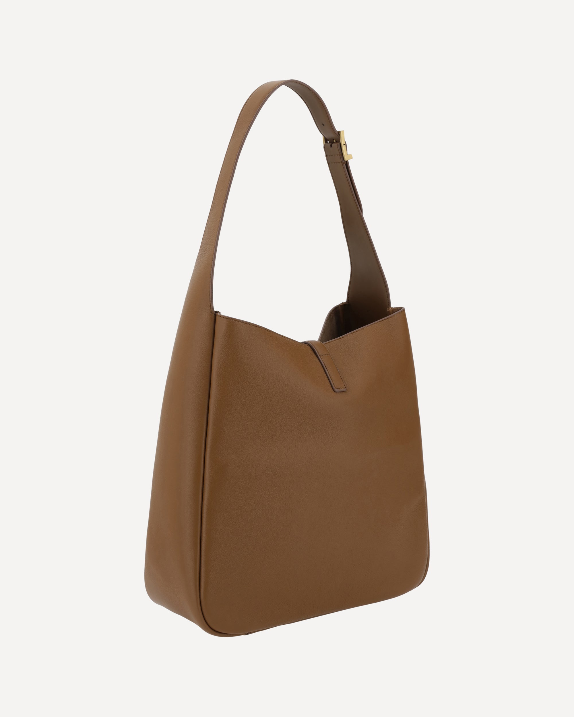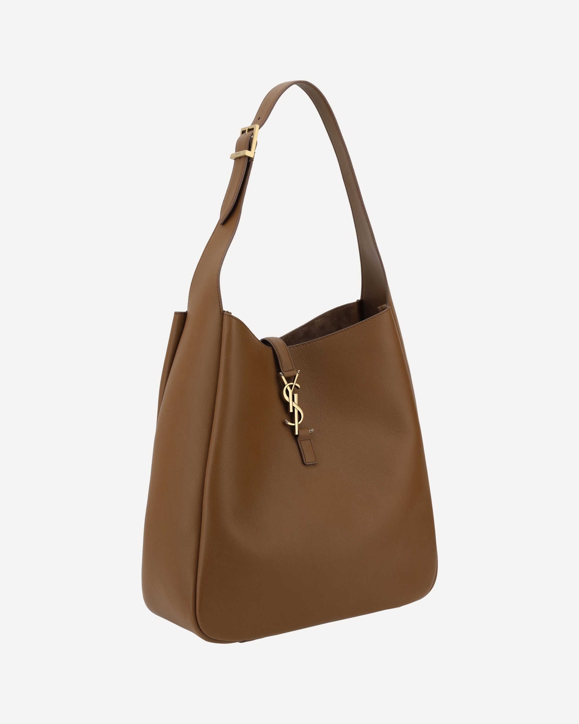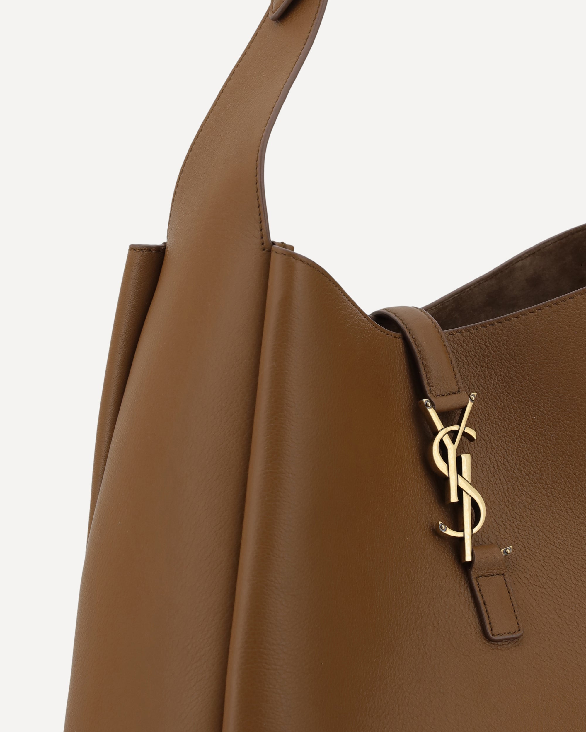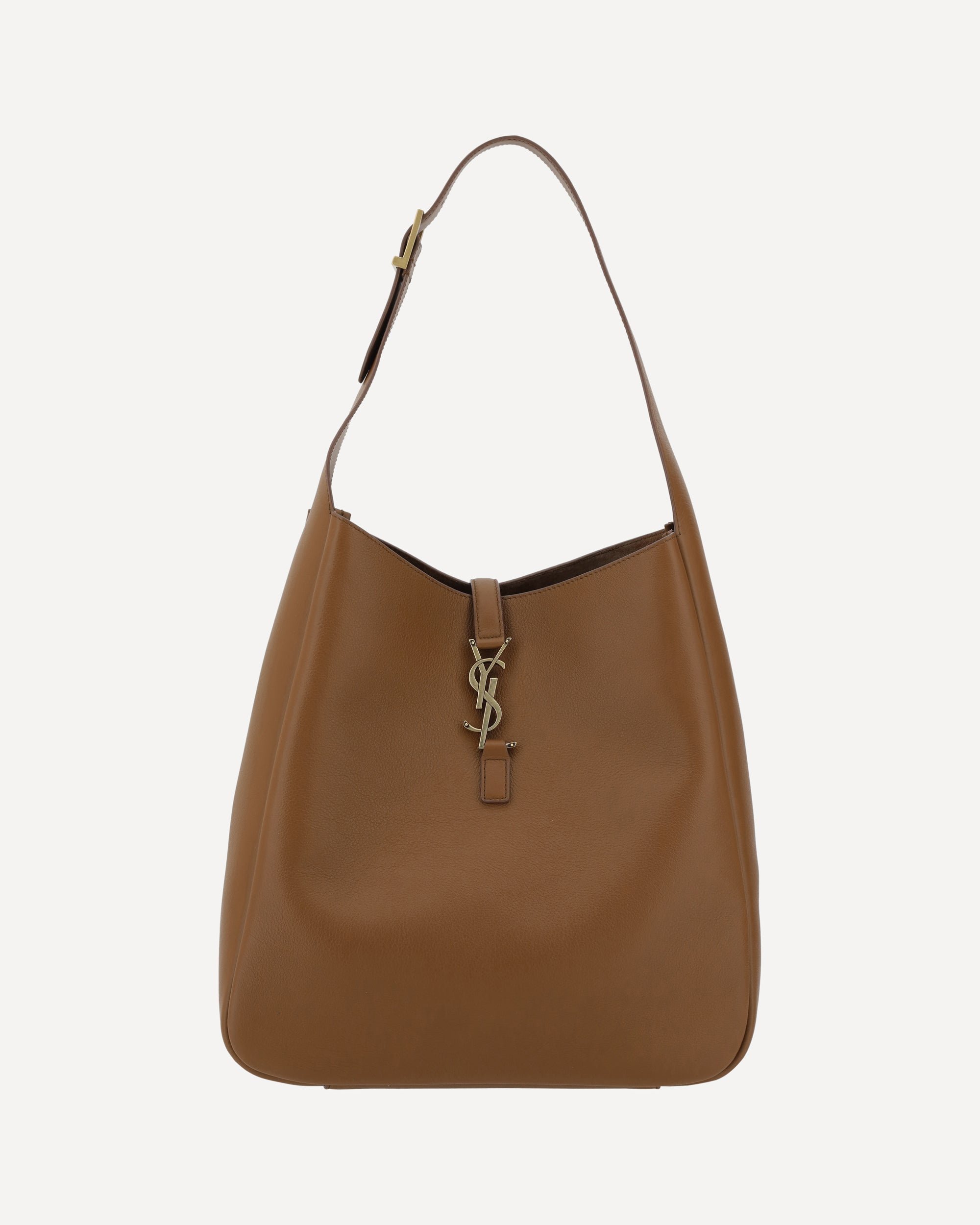 Saint Laurent's leather Le 5 À 7 Shoulder Bag features a sleek grained leather design, giving it a refined and durable texture. It features a single flat top handle that is adjustable for optimal comfort. The closure is secured by a hook-and-eye flap, decorated with the iconic YSL logo on the front, which adds a distinctive touch to the design. Inside, the bag offers a single compartment with a suede lining that houses a slit pocket and a zipper pocket for better organization of personal belongings. A perfect blend of functionality and timeless luxury.