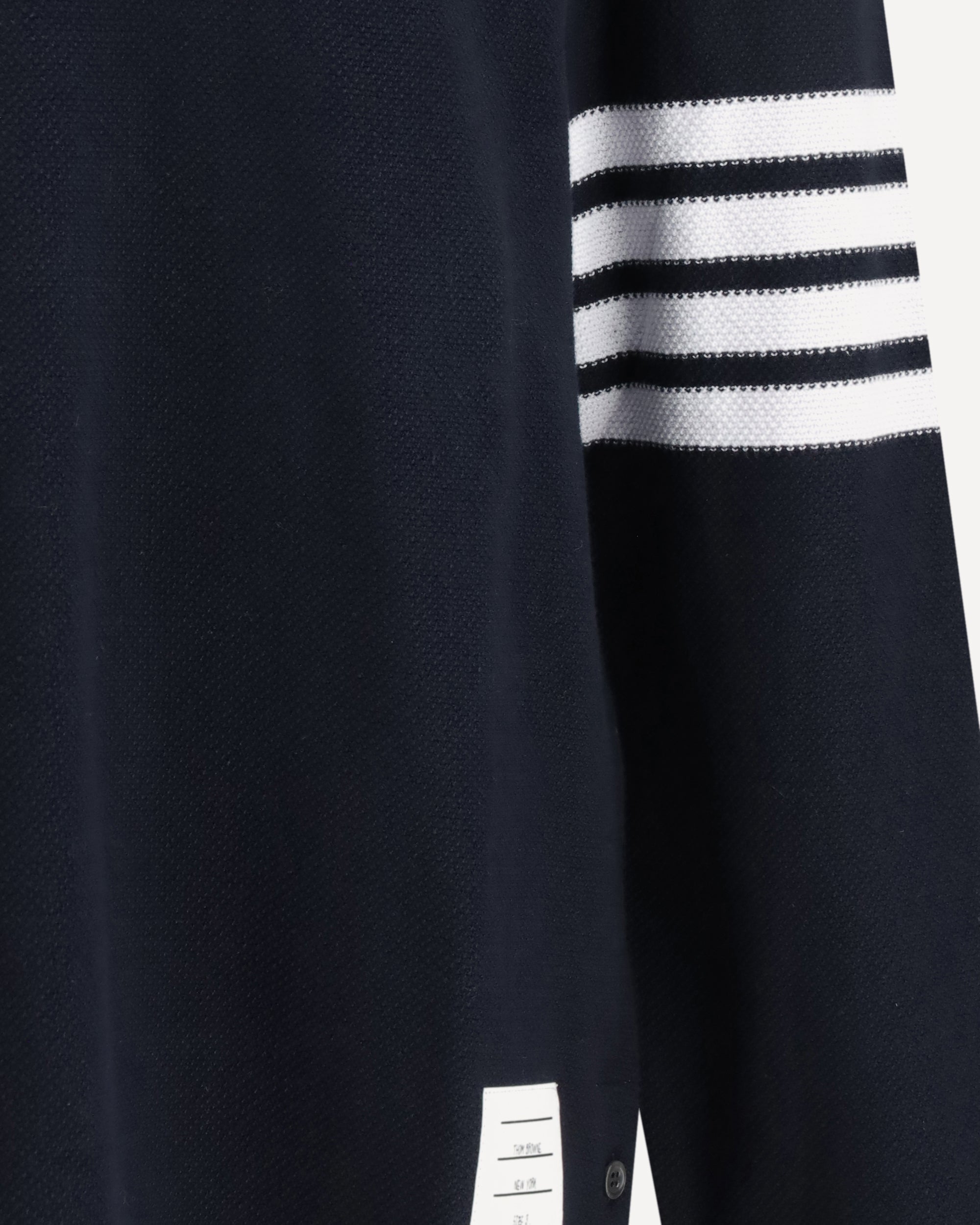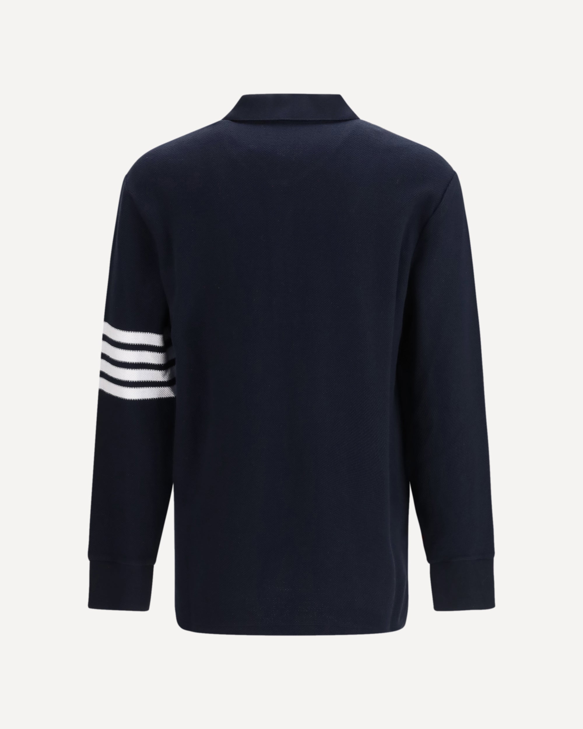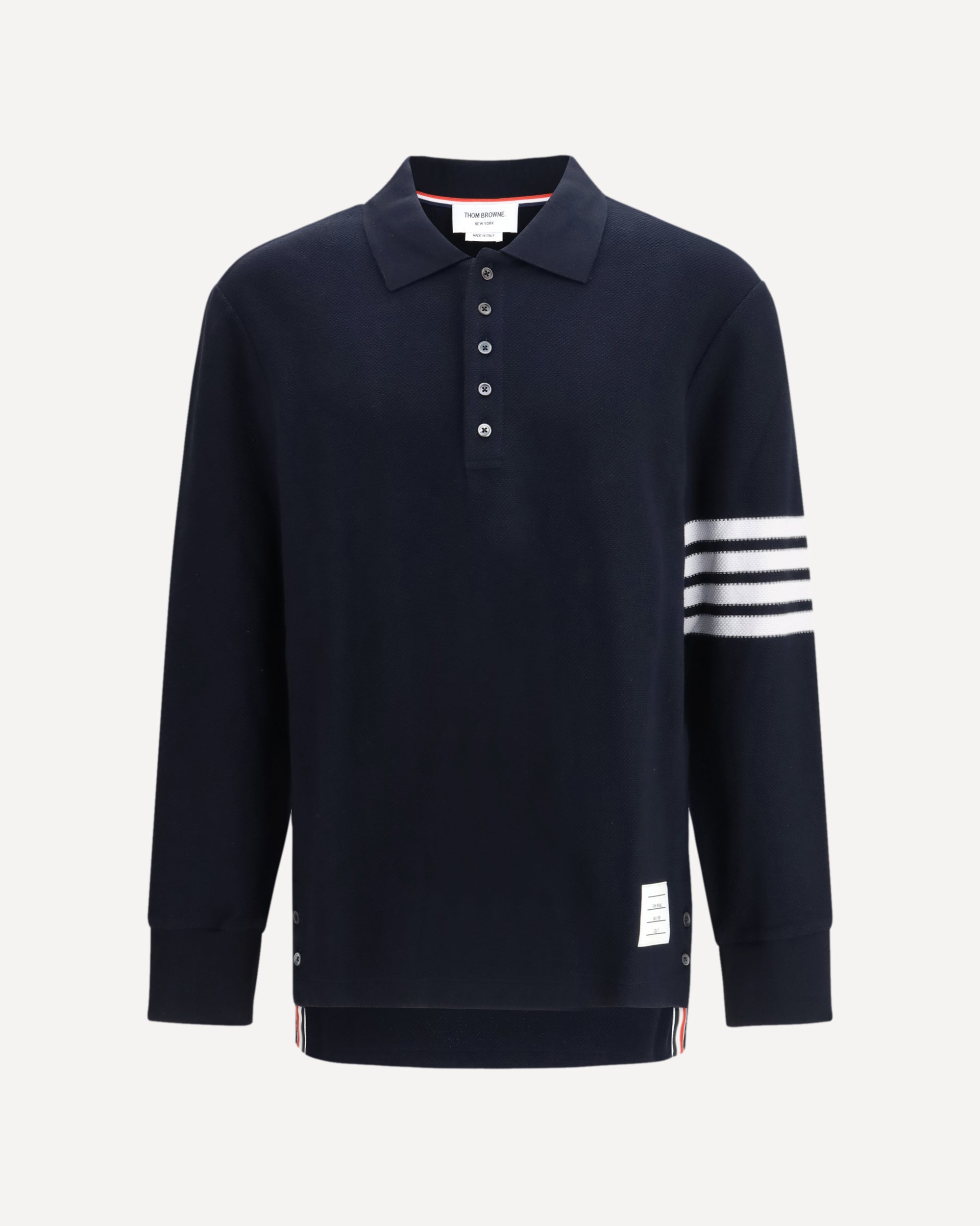 The Textured Piqué 4-Bar long-sleeve Polo by Thom Browne is crafted from textured cotton piqué, offering a structured hand feel and an elevated surface. The design is defined by the iconic 4-bar detailing on the sleeve, adding a distinctive graphic contrast. A partial front button closure, along with ribbed collar and cuffs, highlights the brand’s refined and disciplined aesthetic. Buttoned side vents with RWB grosgrain trim, a stepped hem, the name tag appliqué, and the signature striped grosgrain loop tab at the back complete this piece, reflecting Thom Browne’s tailored approach to everyday essentials.
