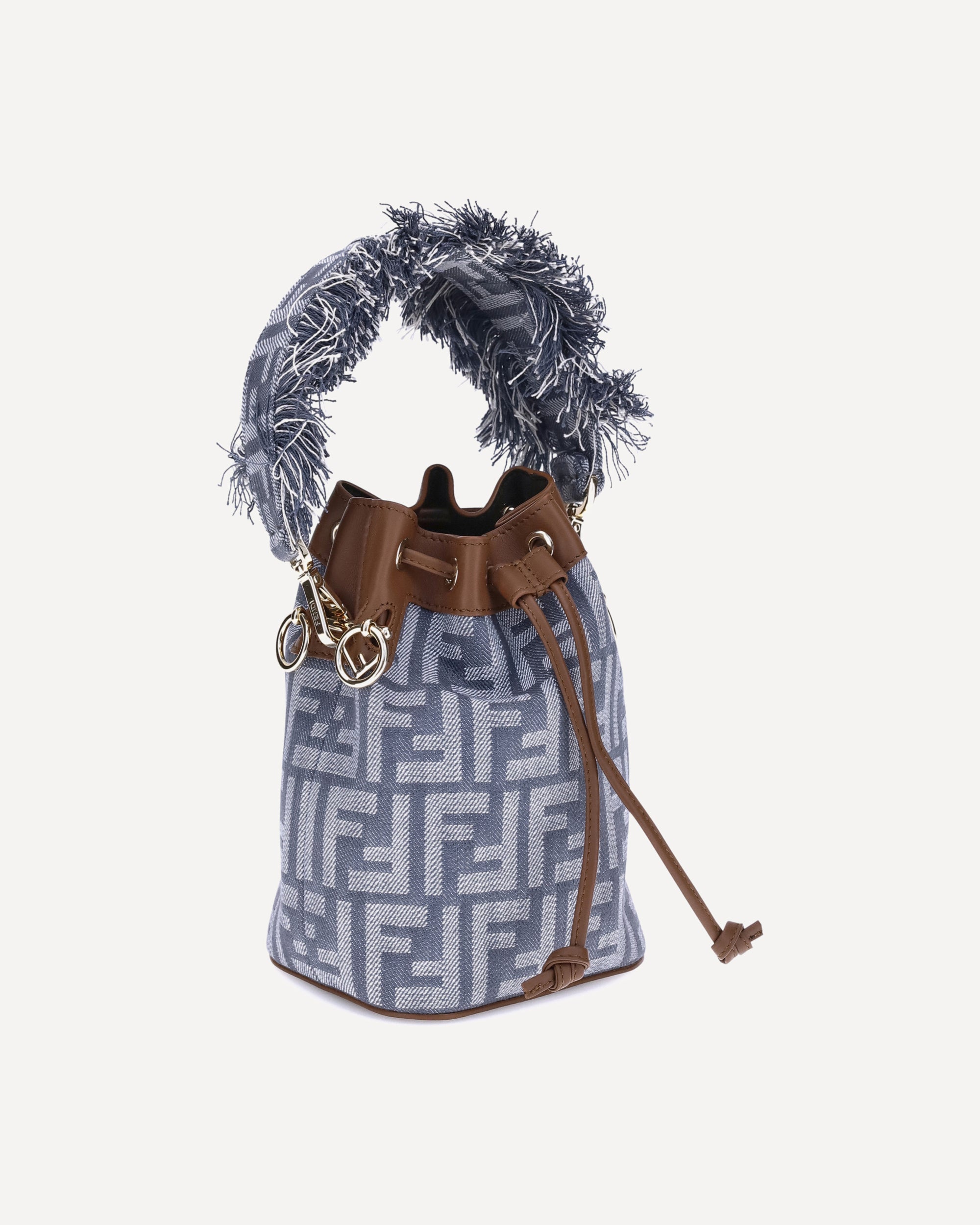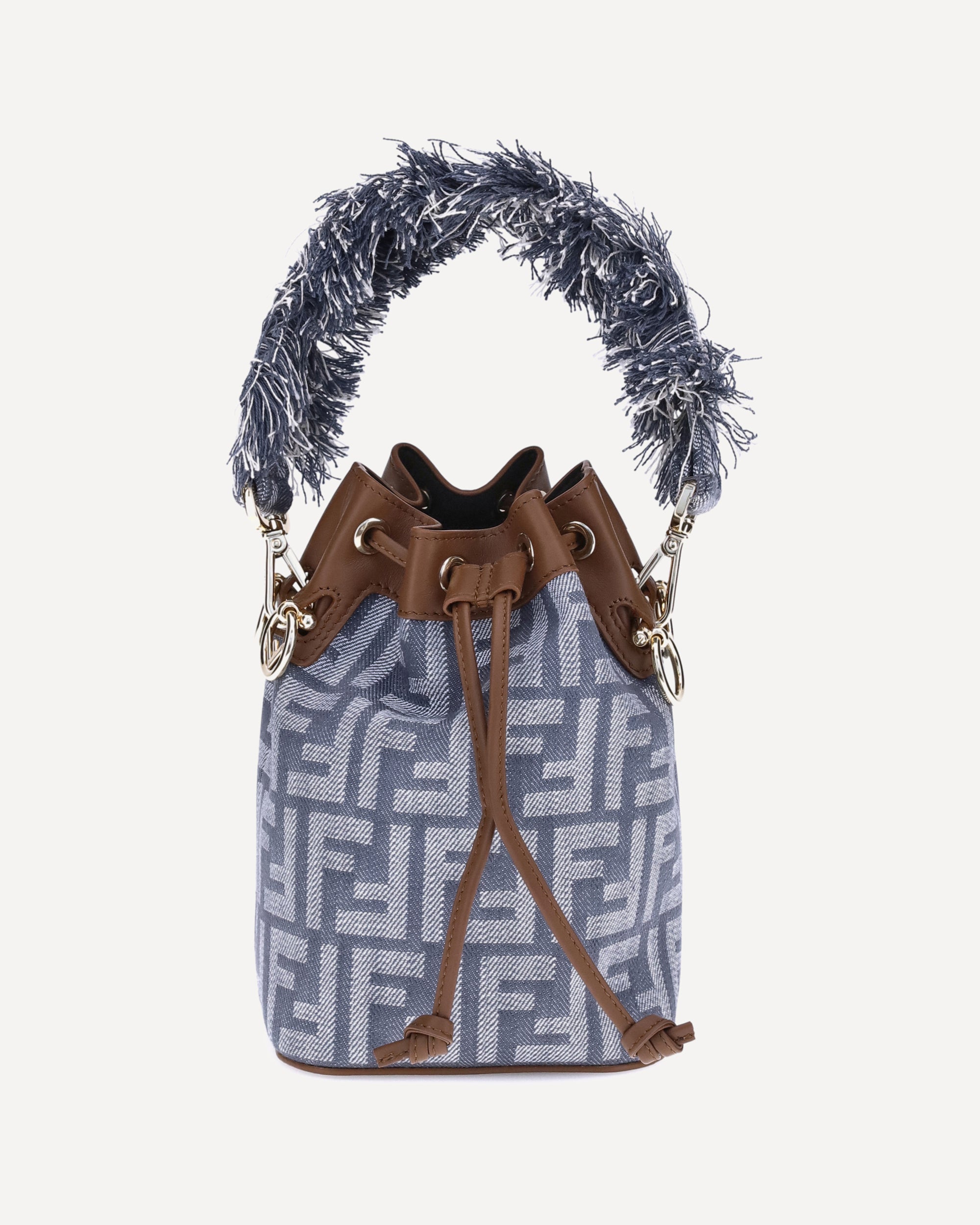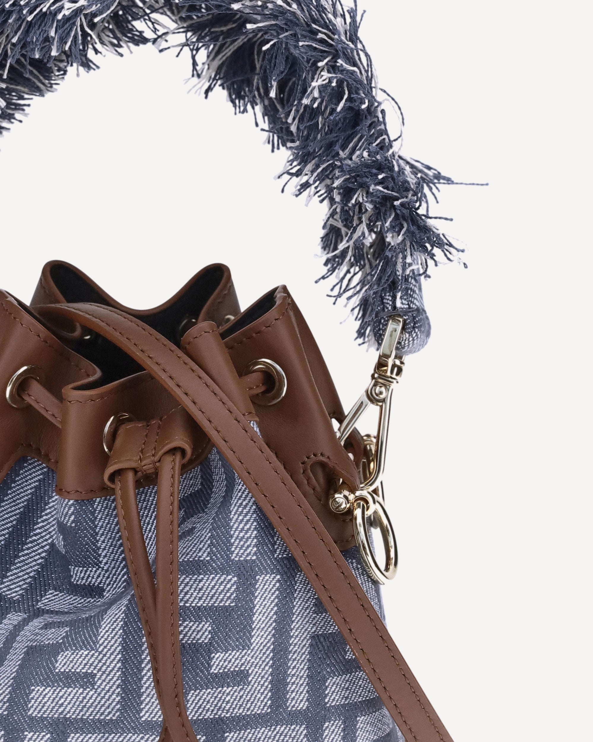 The Mon Tresor Bucket Bag by Fendi is made of denim-effect FF jacquard in shades of blue, with brown calfskin details that enhance its elegance. The interior is lined and enriched with gold-finish metal accessories. The handle, decorated with small fringes, and the adjustable and removable leather shoulder strap allow it to be worn by hand, on the shoulder or cross-body, for a versatile and refined style.