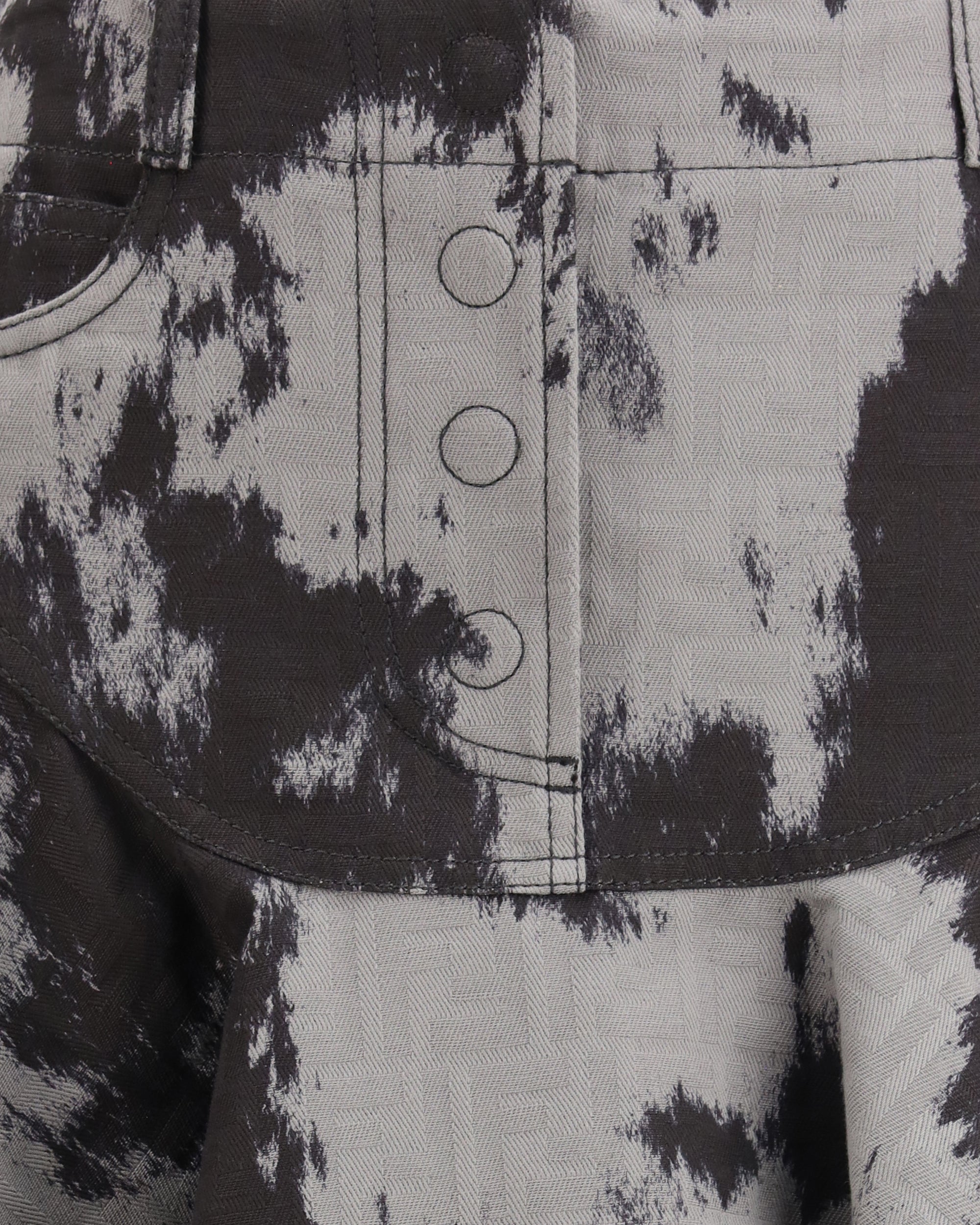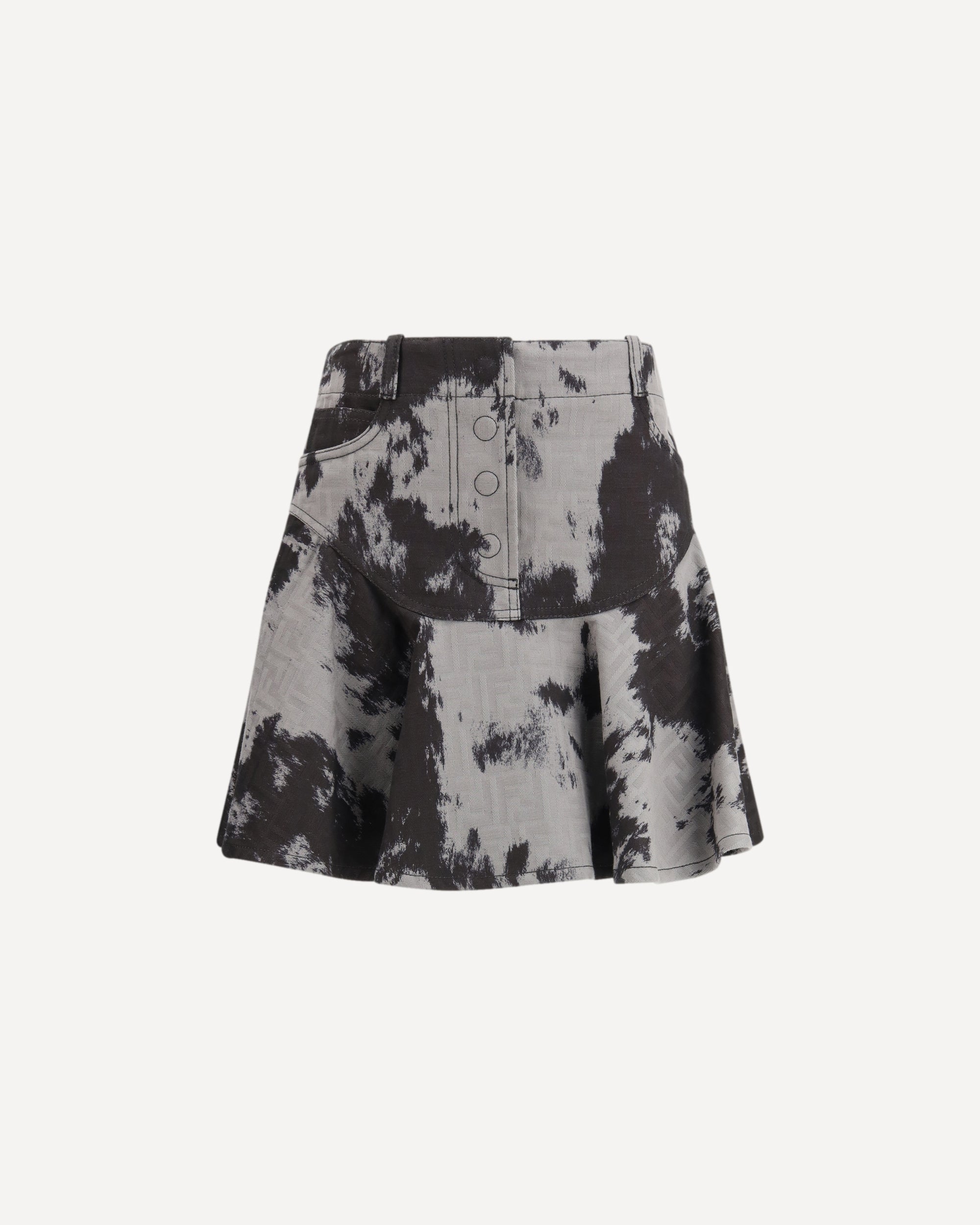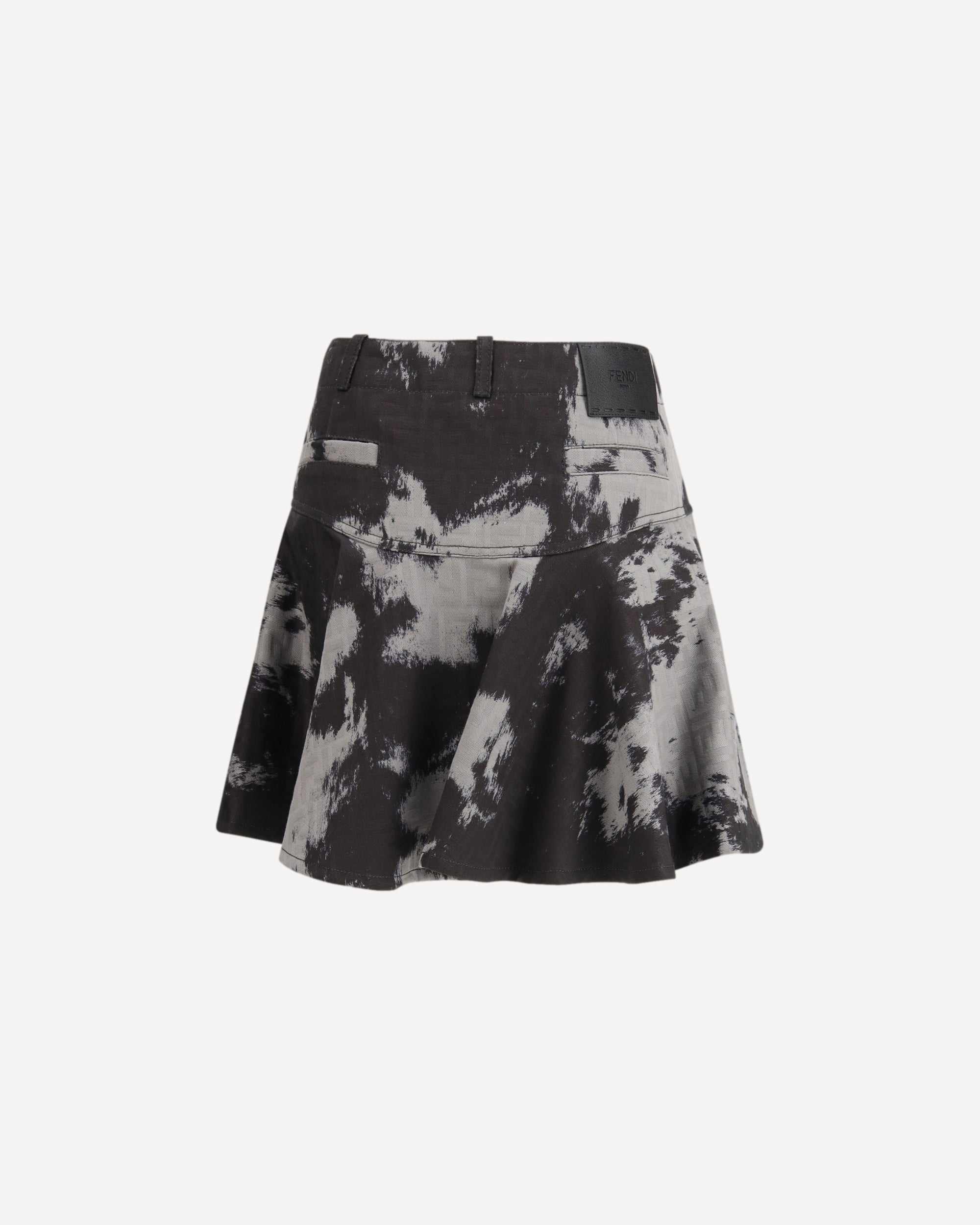 The Denim Miniskirt by Fendi features a high-waisted flared line that enhances the silhouette with balanced, natural elegance. Made from jacquard denim, it combines a structured construction with a soft texture that reinterprets the Maison’s artisanal heritage in a contemporary key. The archive-inspired pattern and refined details, such as the front button closure and leather label on the back, lend the piece a distinctive and sophisticated character.