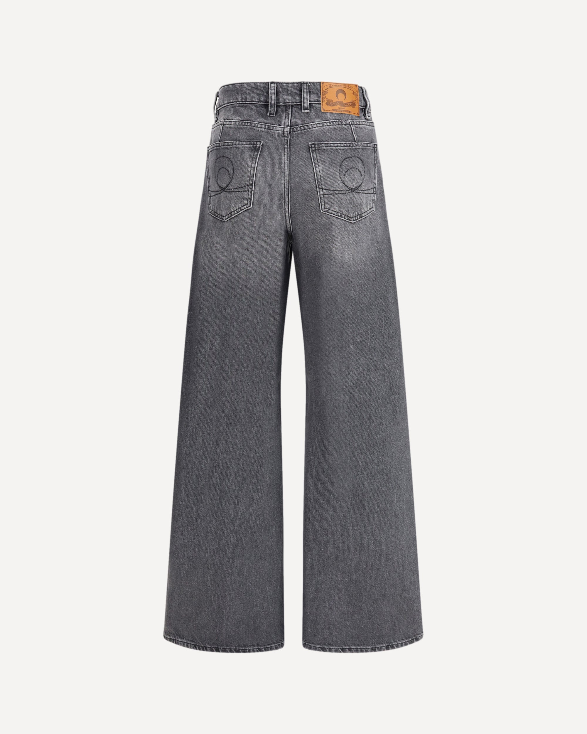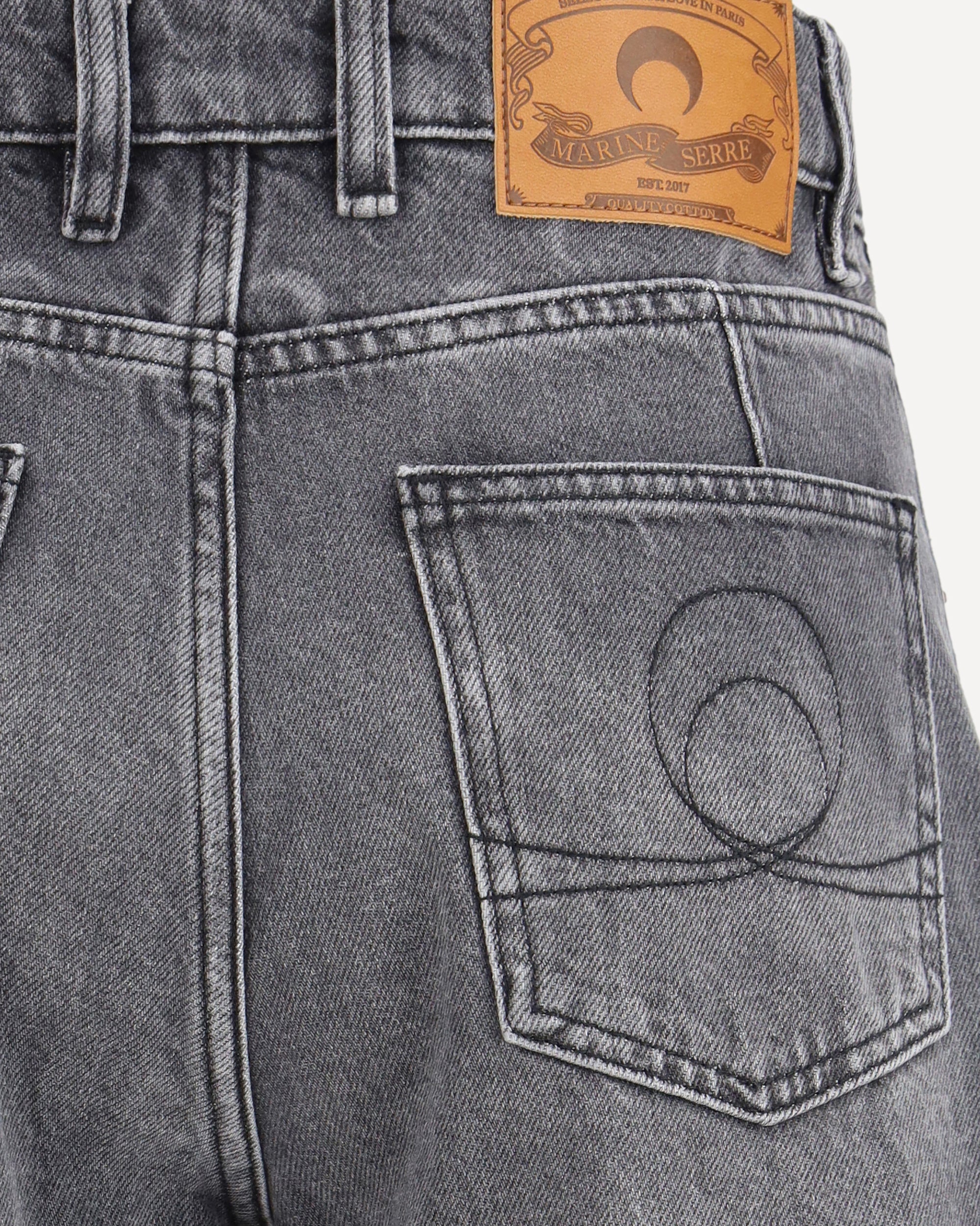 The Moon Laser Grey Wash Denim High-Waist Flare Jeans by Marine Serre feature a high-rise waist and regular-length flared leg, blending contemporary style with retro inspiration. Crafted from premium denim, they include a zipper and button closure, five-pocket construction, and belt loops. The signature laser-printed Moon motif adorns the back, while cotton twill front pockets and a leather logo patch add refined finishing touches emblematic of Marine Serre’s unique aesthetic.