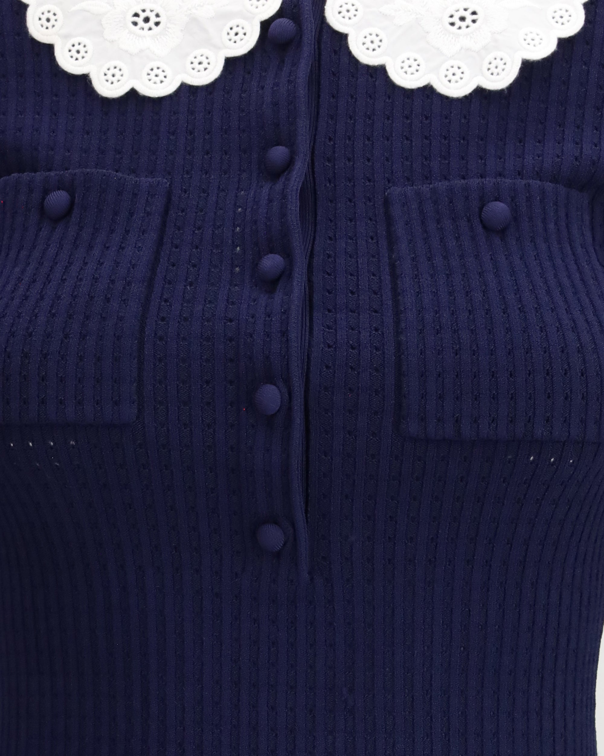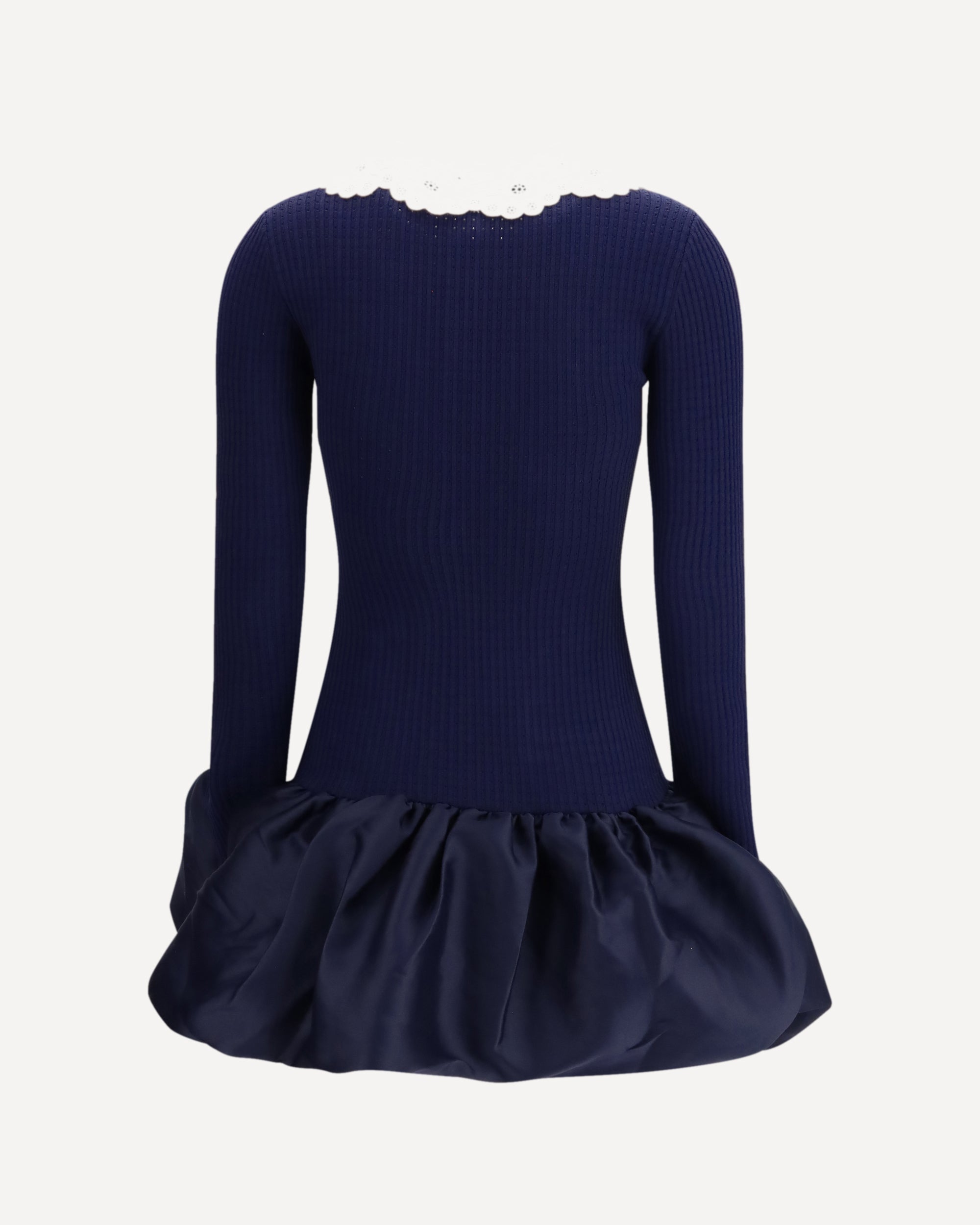 The knit and taffeta mini Dress by Self Portrait combines the soft comfort of pointelle knit with the subtle sheen of taffeta for a refined yet playful look. Designed to fit true to size, the stretch fabric ensures ease and comfort throughout wear. A sculptural bubble skirt adds volume and visual interest, while the contrasting broderie anglaise collar brings a delicate, decorative touch. Finished with a button-down front closure, this mini dress is perfect styled with heels for cocktail events and evening occasions.