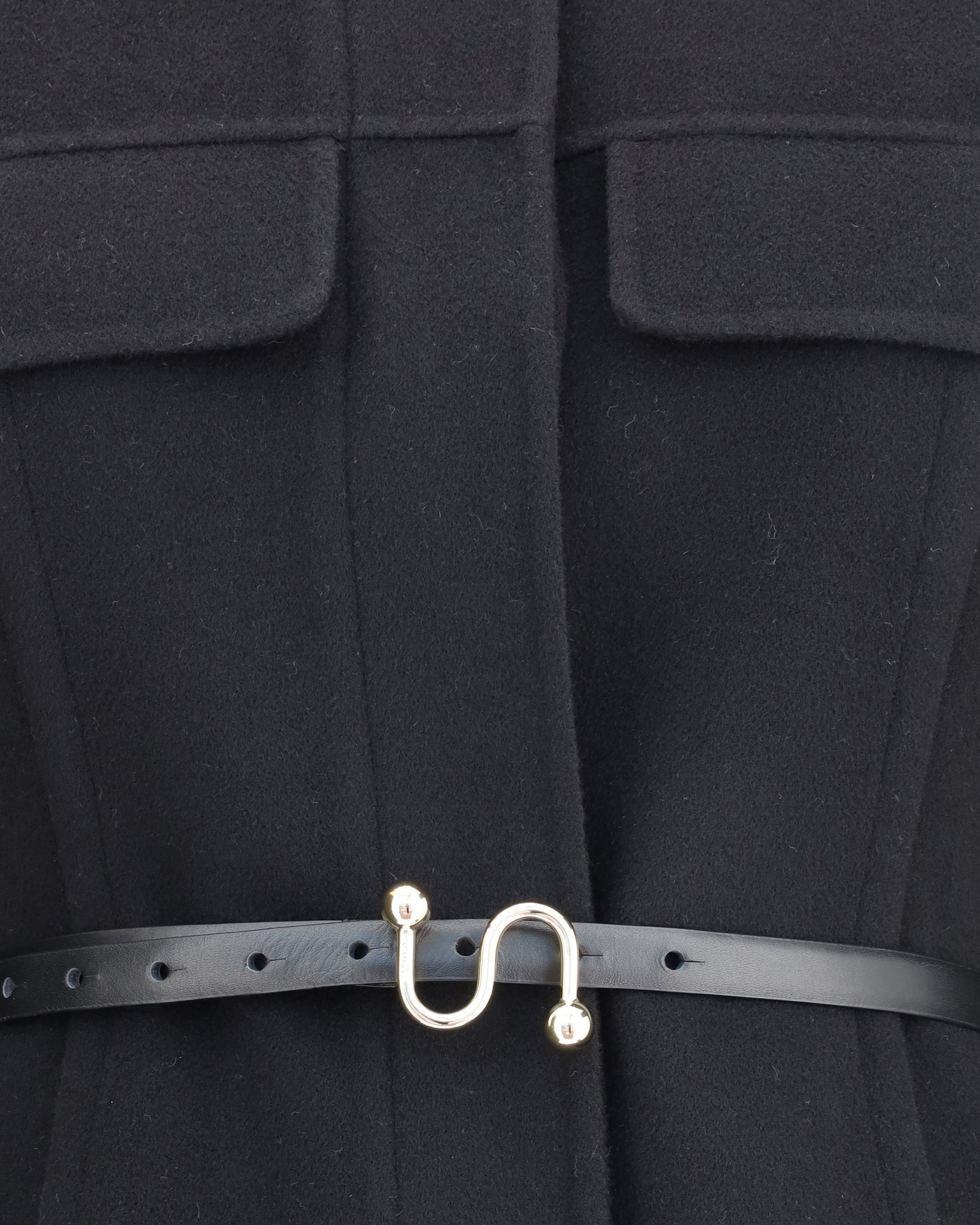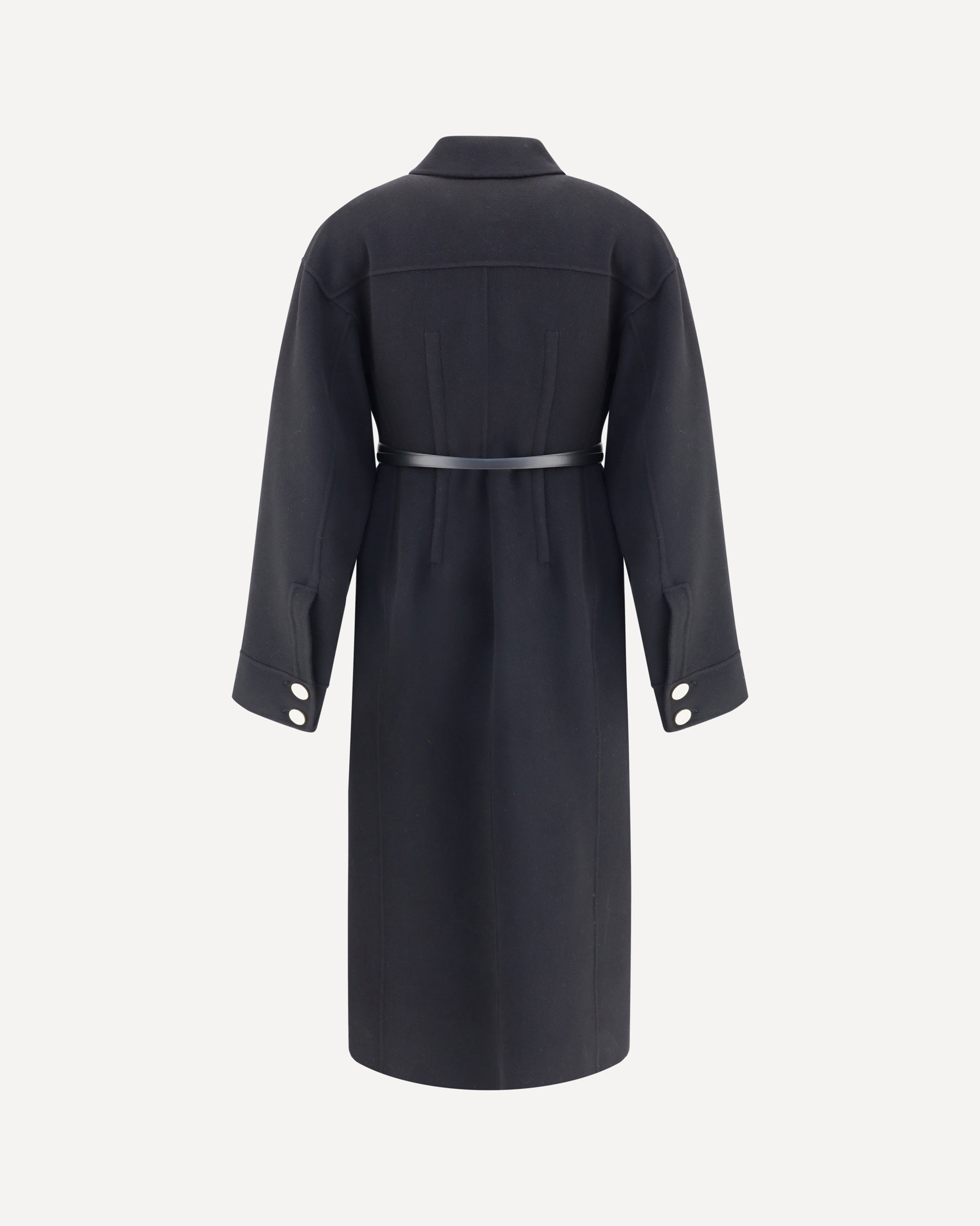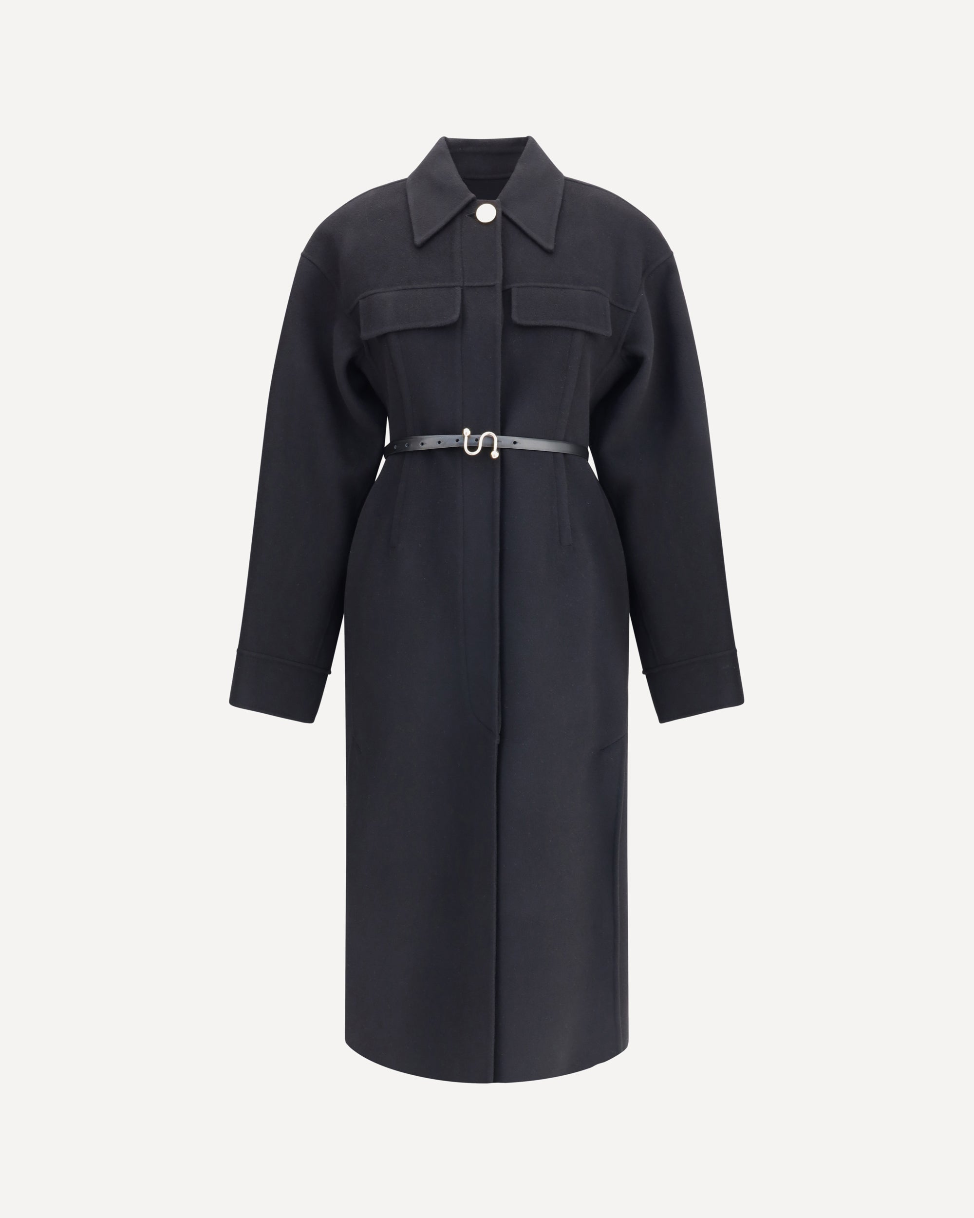 Max Mara Sportmax's Olio long Coat is an elegant, tailored piece made from fine pure wool double drap. Featuring a regular fit and a fitted waist, it has overlapping side slits that give movement to the silhouette. The design is completed with a shirt collar, concealed placket with an exposed metal first button and double-buttoned shirt cuffs. A leather belt with an "S" buckle emphasizes the waist, adding a distinctive touch to this refined and feminine coat.
