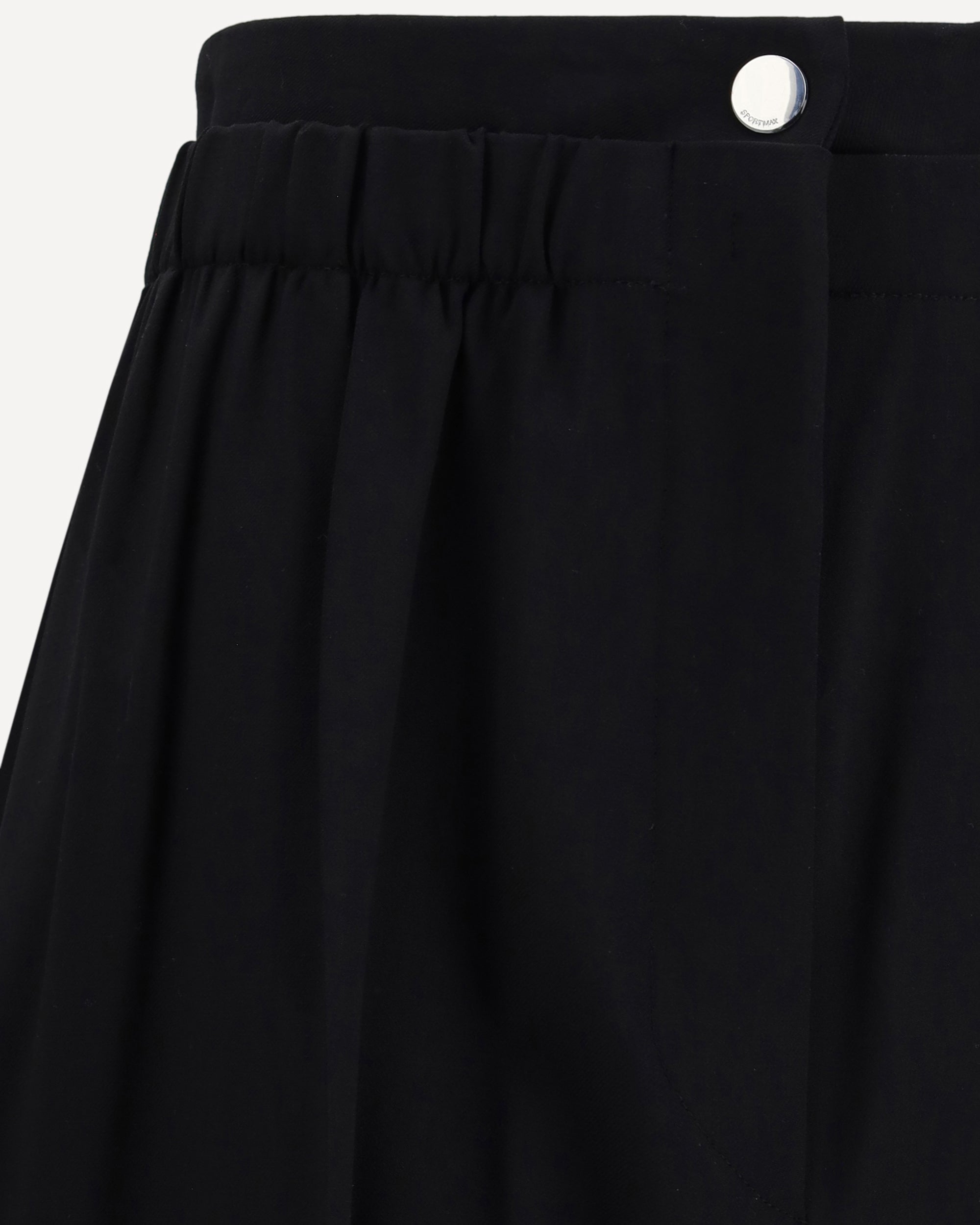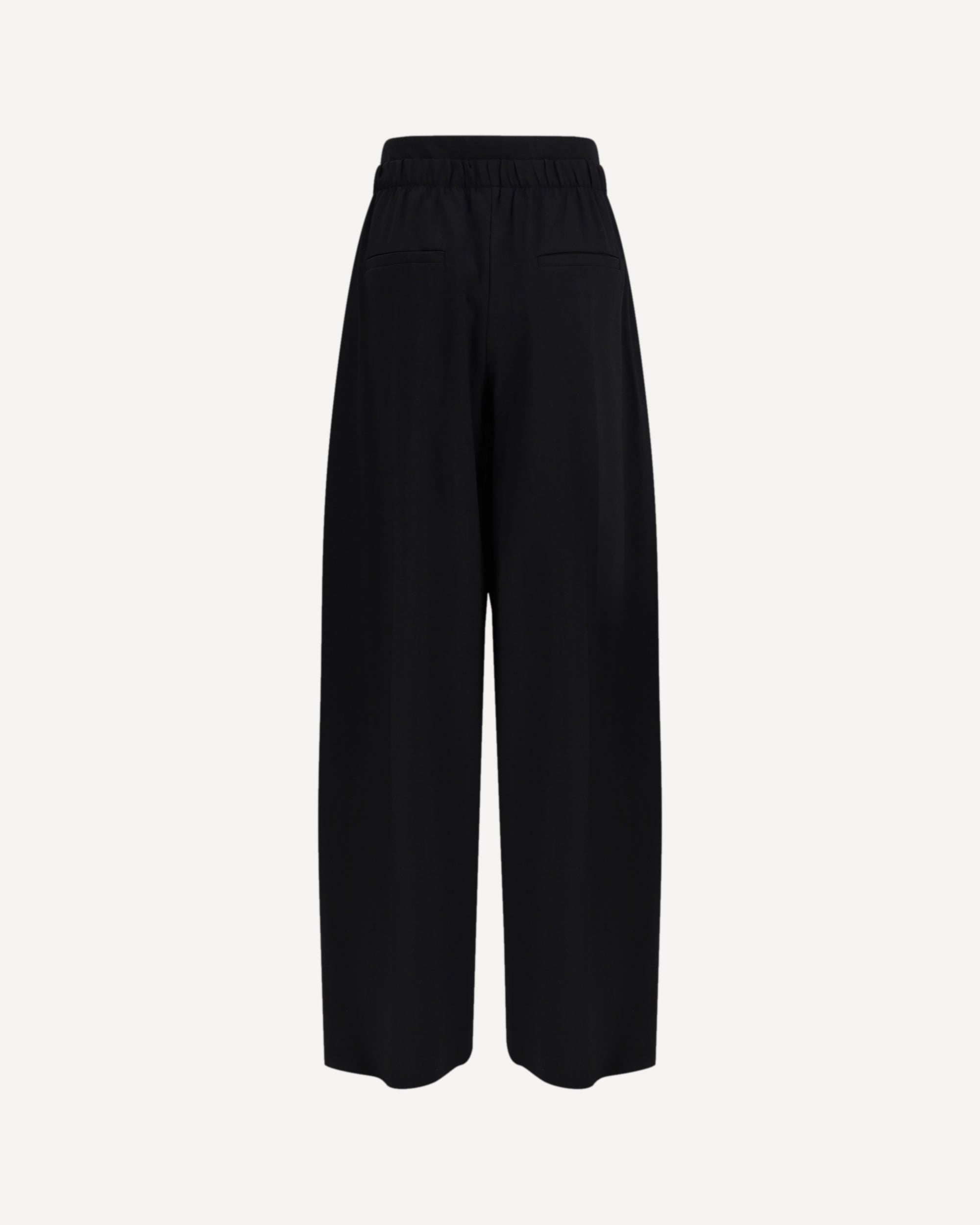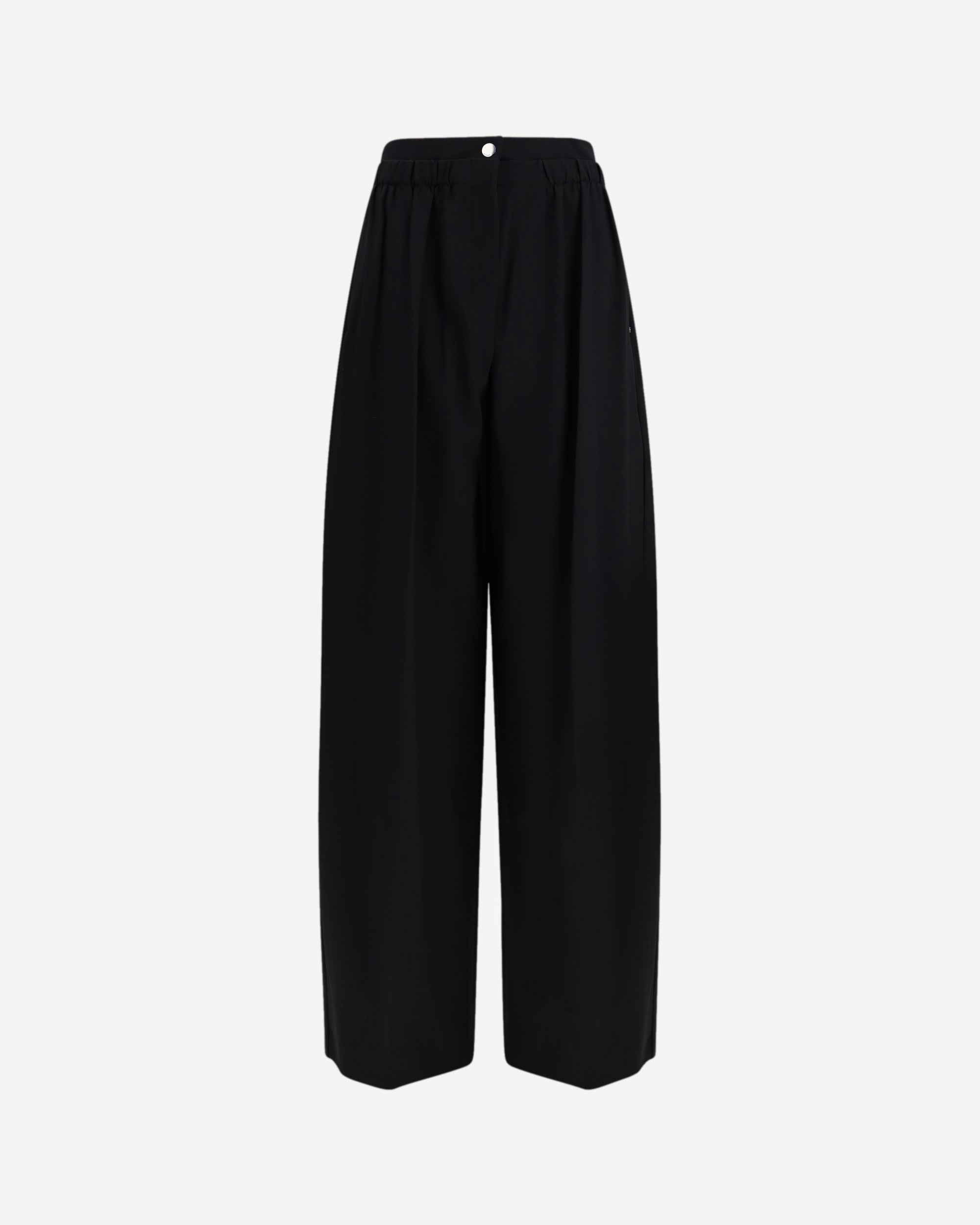 The Wide Stretch Wool Trousers by Sportmax are crafted from stretch gabardine and feature a fluid silhouette with a slightly low waist and a regular fit. The wide leg is defined by front and back pressed creases, while the double gathered waistband introduces a dynamic element that adds movement and a subtle sporty touch. Finished with a branded snap button and concealed zip, this design embodies the brand’s ability to blend tailoring and comfort within a clean, contemporary aesthetic.