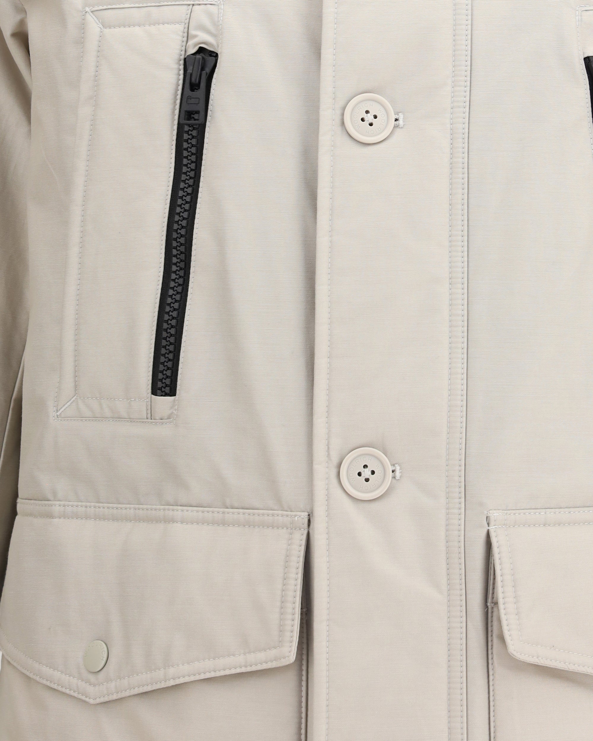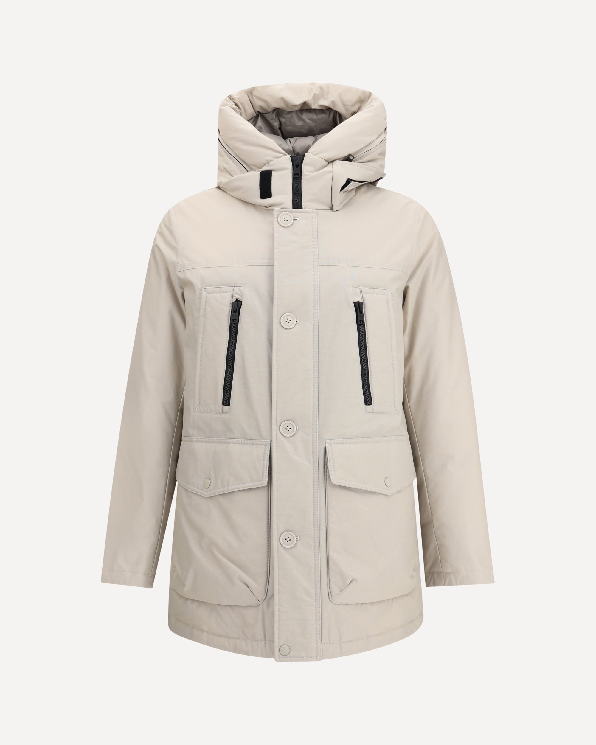 Cotton Ramar Down Jacket by Woolrich, high-necked model with hood, front zipper and button closure, elastic ribbed cuffs, two slit pockets with zipper applied on the front, monochrome padded design, removable patch with iconic brand monogram applied on the hood, two large flap pockets applied on the front, regular fit.