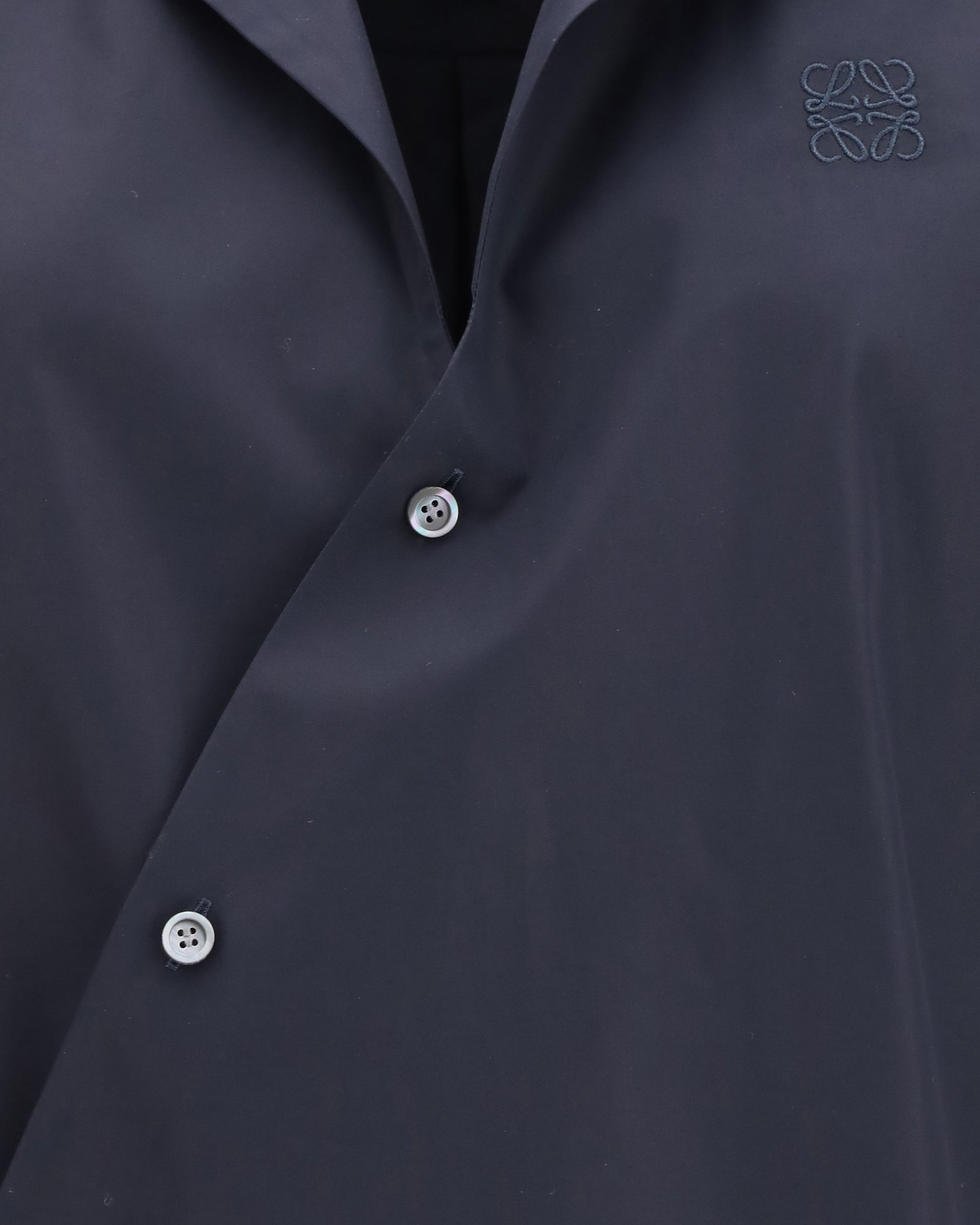 The lightweight cotton poplin Shirt by Loewe delivers a contemporary and distinctive elegance. Defined by an asymmetric front with diagonal button fastening, it adds dynamic character to the silhouette. A relaxed fit and standard length ensure comfort and versatility, while a camp collar and buttoned cuffs refine the design. The embroidered Anagram on the chest subtly signs the piece.