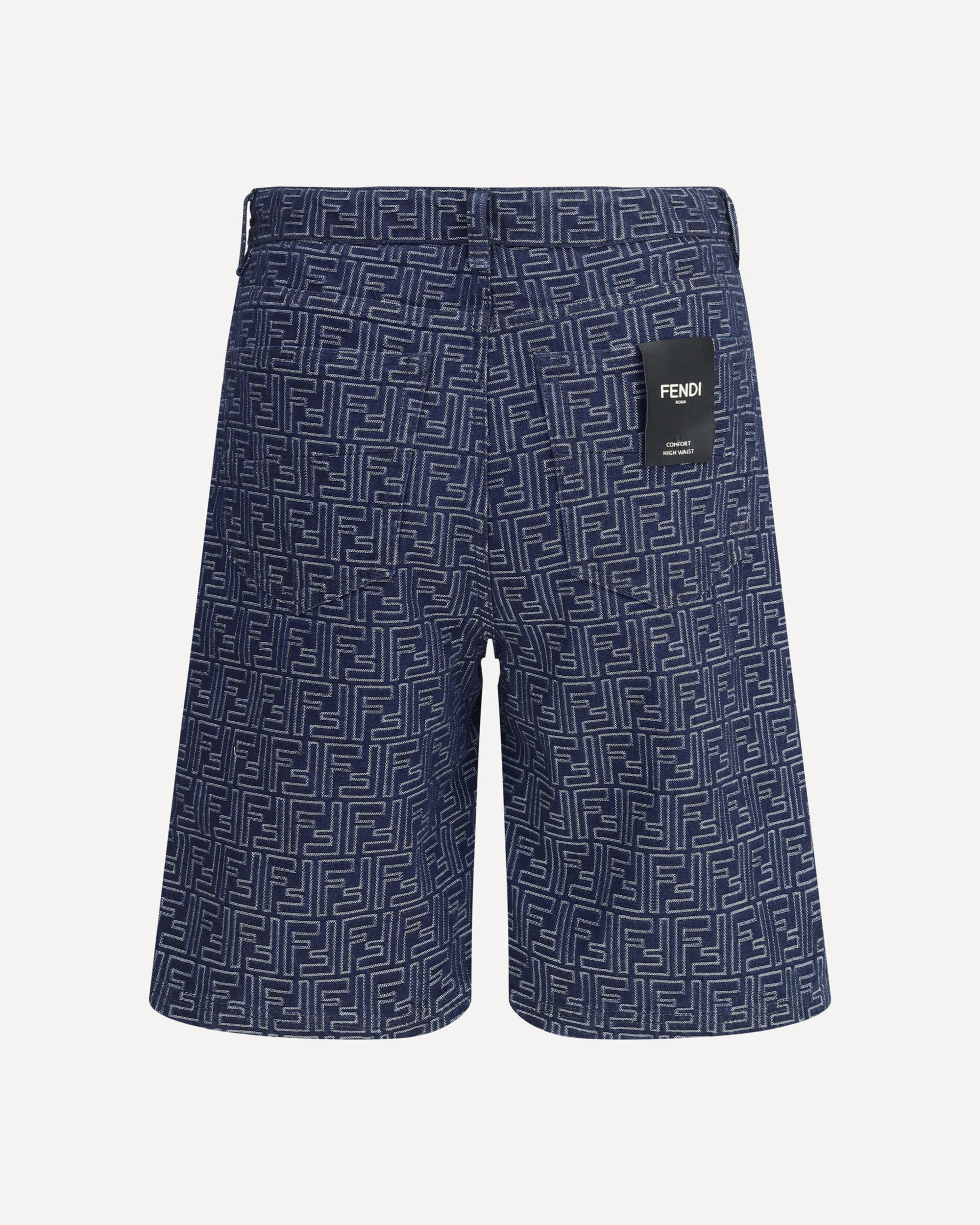 Cotton Shorts by Fendi featuring a denim design embellished with an all-over contrasting FF jacquard pattern. The model features a five-pocket construction, front zipper and button closure, and belt loops at the waist. An iconic and contemporary piece, perfect for adding character to your summer look.
