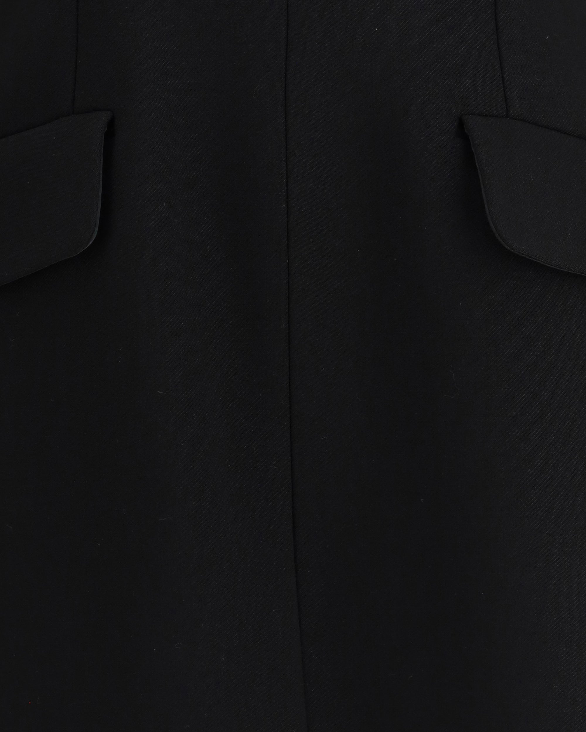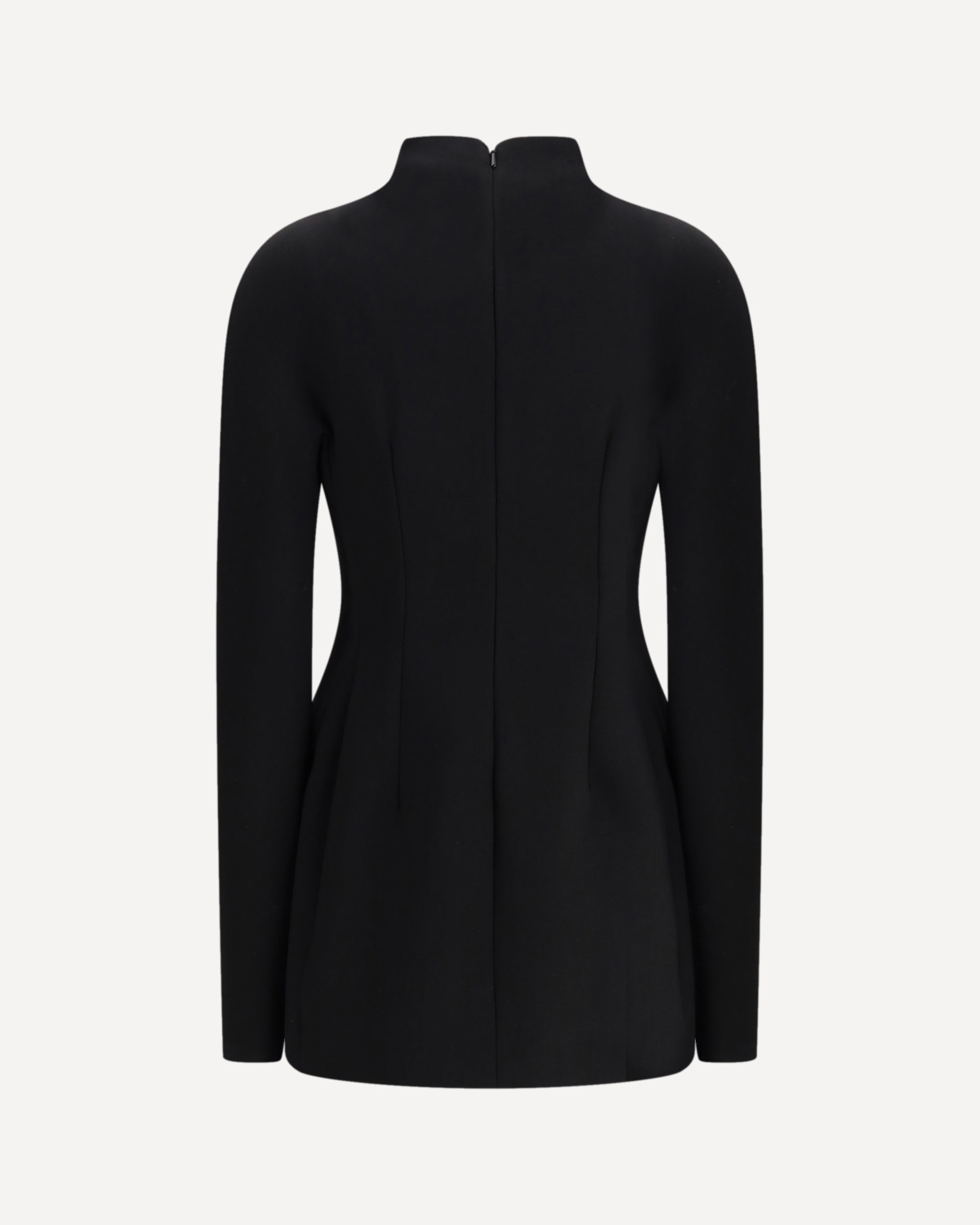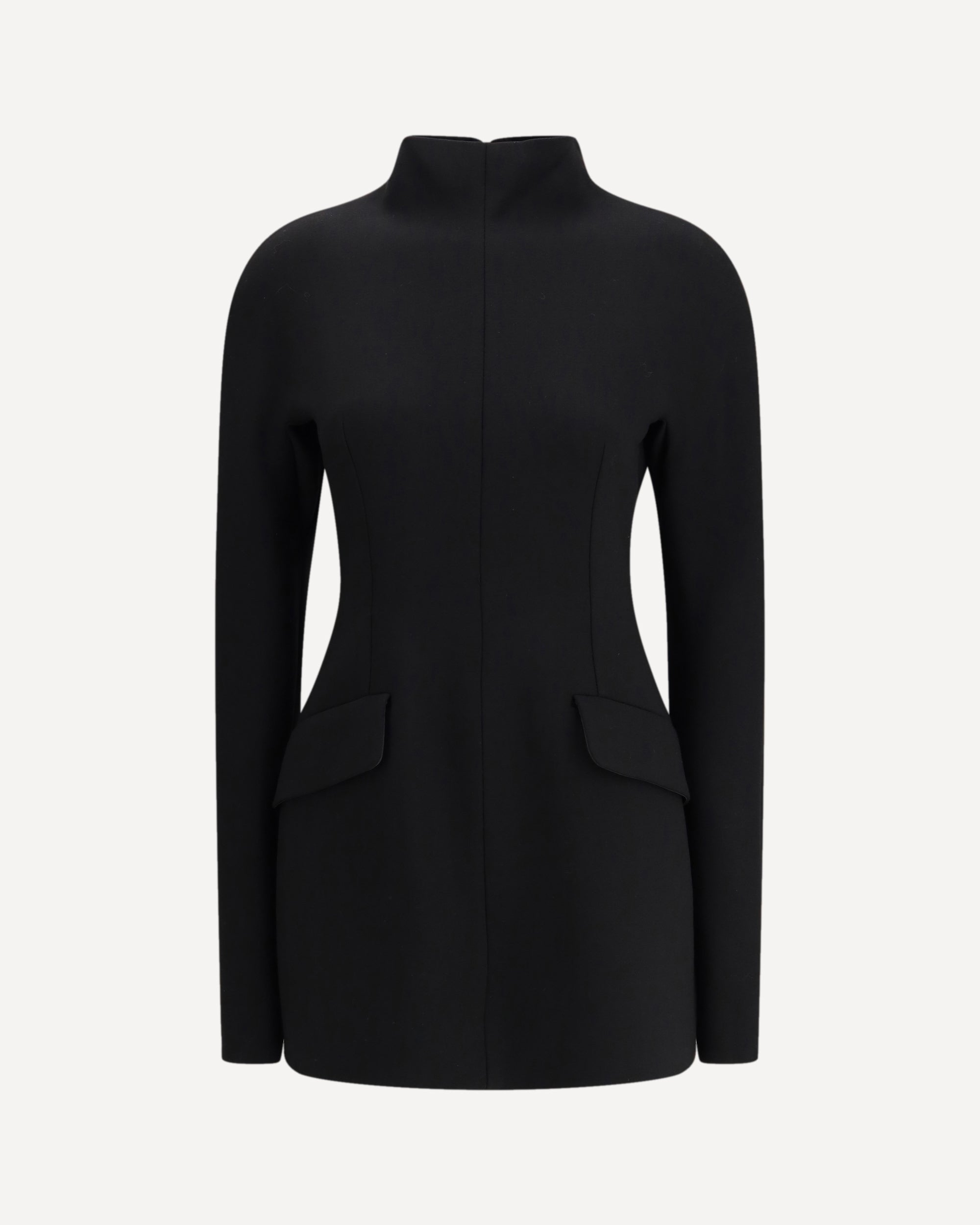 The Short Sculpted Dress by Sportmax from Klepsydra Capsule is crafted from stretch wool-blend gabardine and features a construction that shapes the silhouette through graphic lines and precise contouring. The design includes a raised collar with a concealed back zip, darts and shaped side panels that enhance the figure, as well as side flap pockets integrated into the structure. Fitted at the waist and softly curved at the hips, it embodies the balance of strength and femininity that defines Sportmax, merging sartorial precision with sculptural modernity in a single contemporary vision.