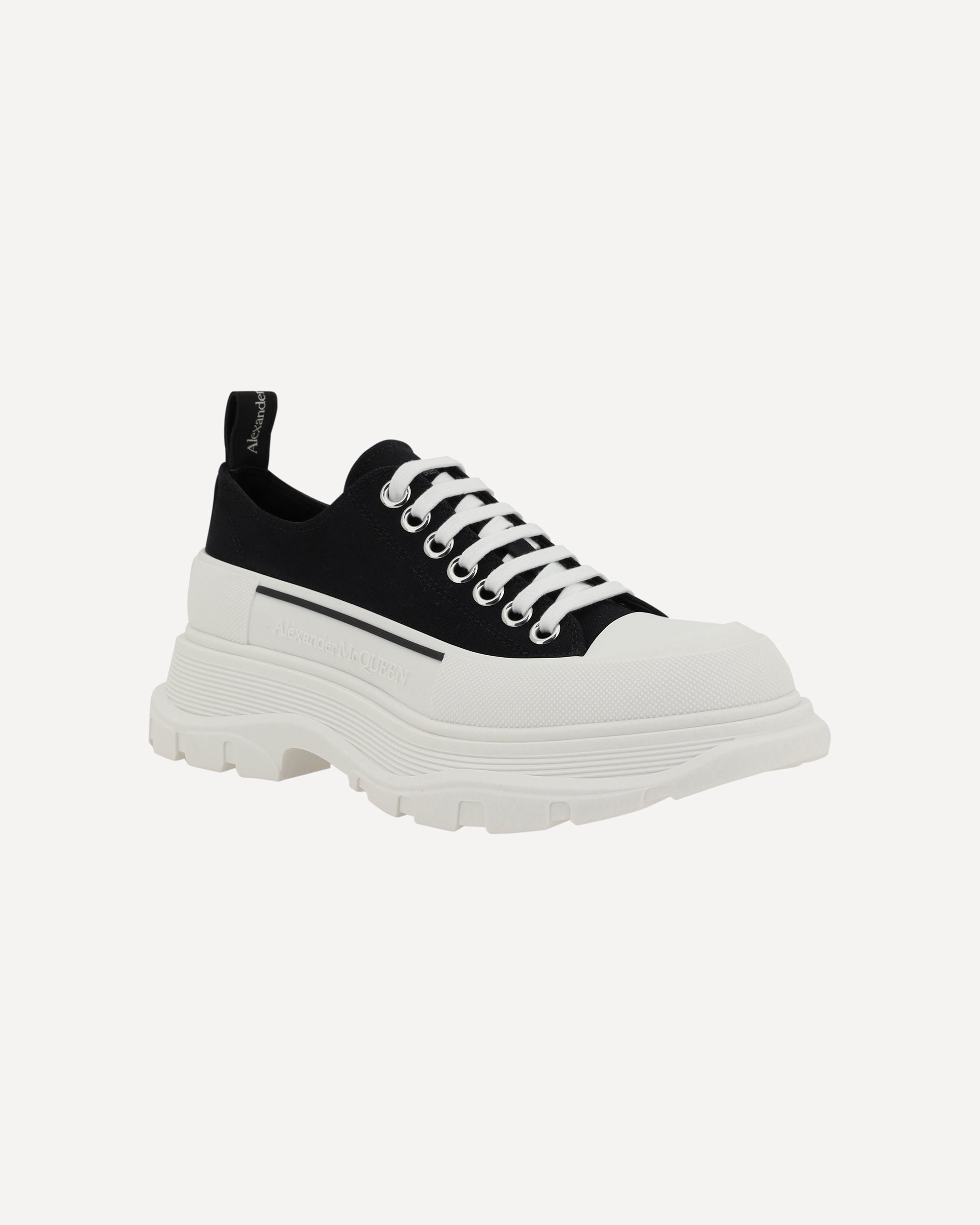 Alexander McQueen's Cotton Tread Slick Sneakers combine modern design and functionality. The reinforced round toe provides extra protection, while the lace-up closure ensures a secure and adjustable fit. The pull on heel makes it even easier to wear, adding practicality to the model. The contrasting platform sole gives a touch of momentum and originality, while the logoed press stud insole confirms the attention to detail typical of the brand. These sneakers are perfect for those looking for an urban and sophisticated look without sacrificing comfort.