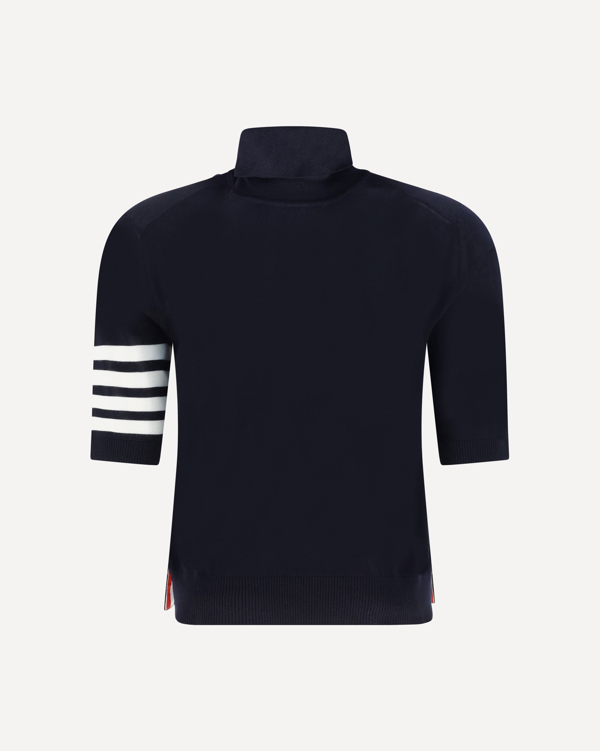 Thom Browne's Virgin Wool Turtleneck Sweater is a refined and sophisticated piece that combines elegance with distinctive details. With a ribbed turtleneck and short sleeves, it features a monochrome pattern enhanced by contrasting hems. The brand's iconic bands on the left sleeve and the ribbed hem with slight side slits add a touch of originality.