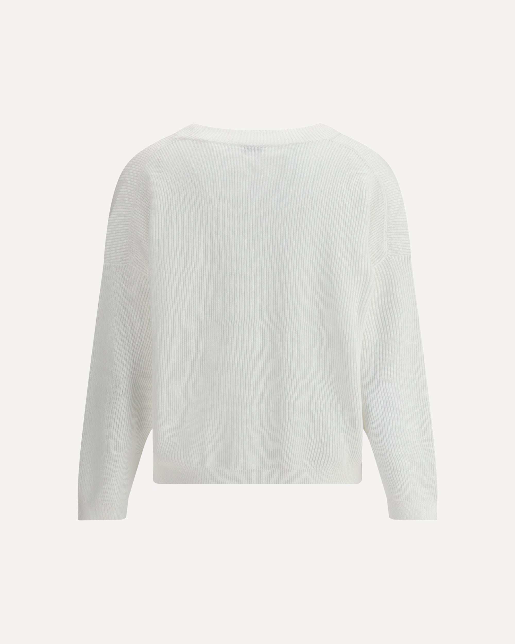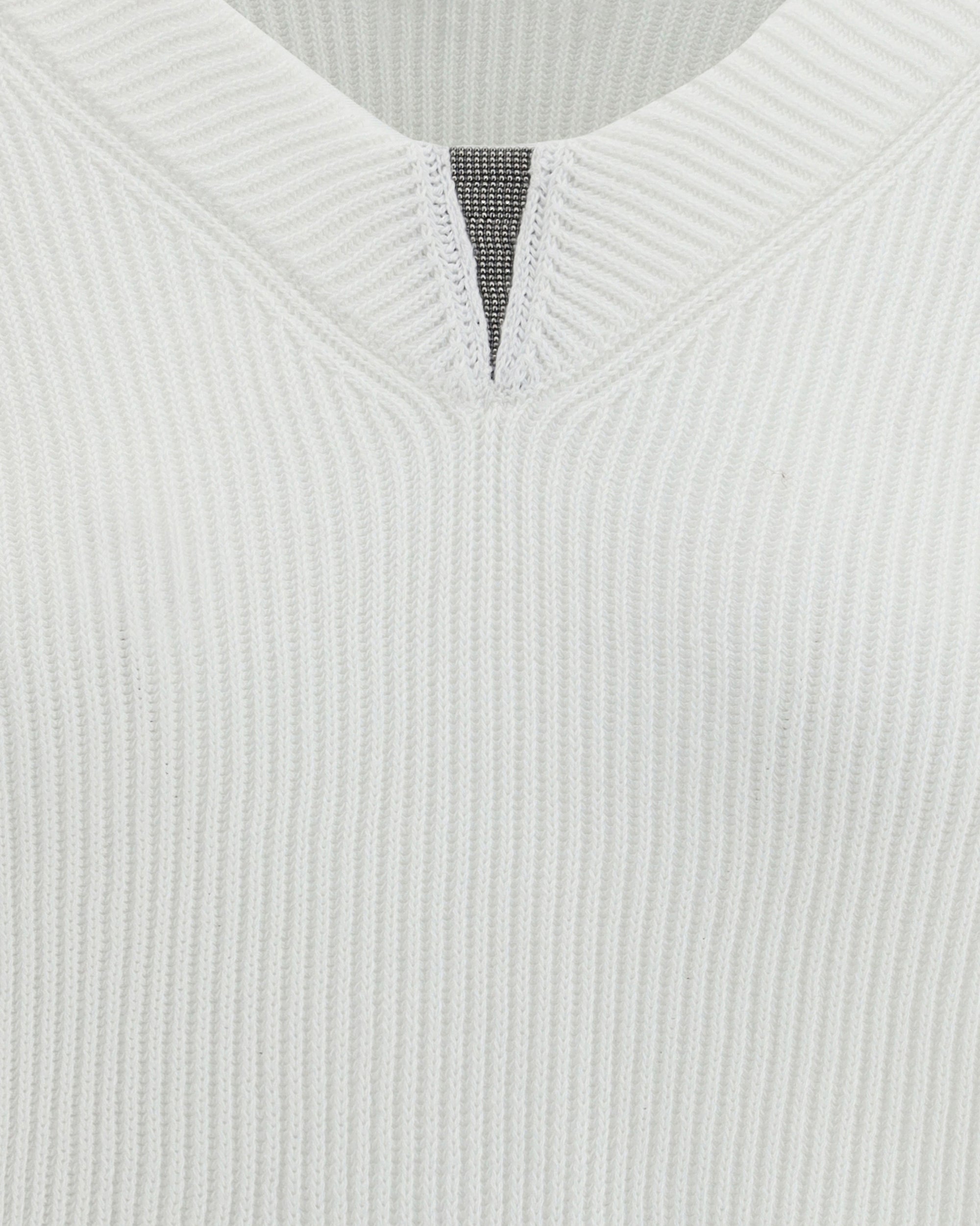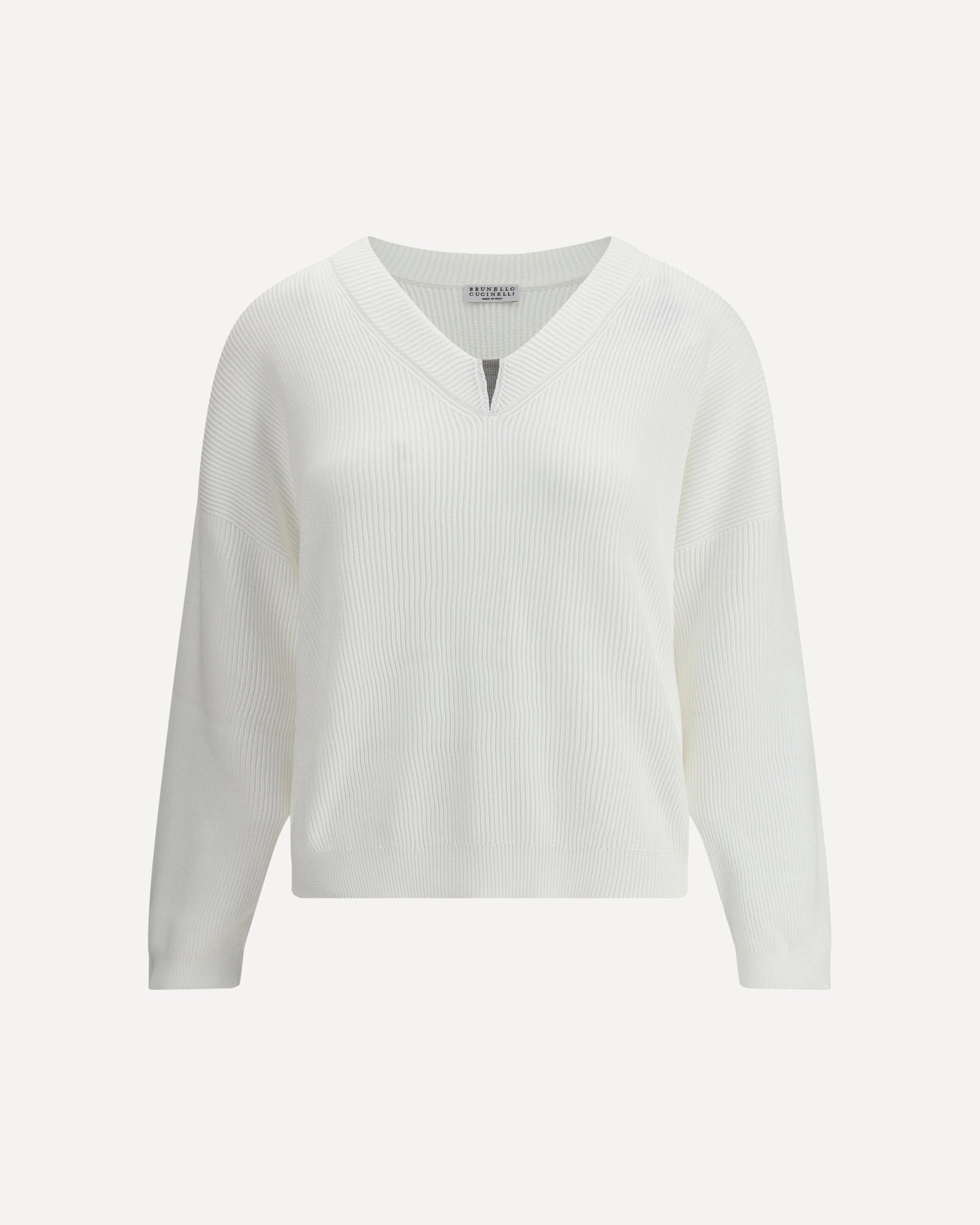 Brunello Cucinelli's cotton sweater is an elegant and refined piece, featuring a V-neck on the front embellished with the brand's famous shiny jewels, which add a touch of light and luxury. The ribbed design gives an interesting and modern texture. This sweater is perfect for a sophisticated yet relaxed look, ideal for any casual-chic occasion.