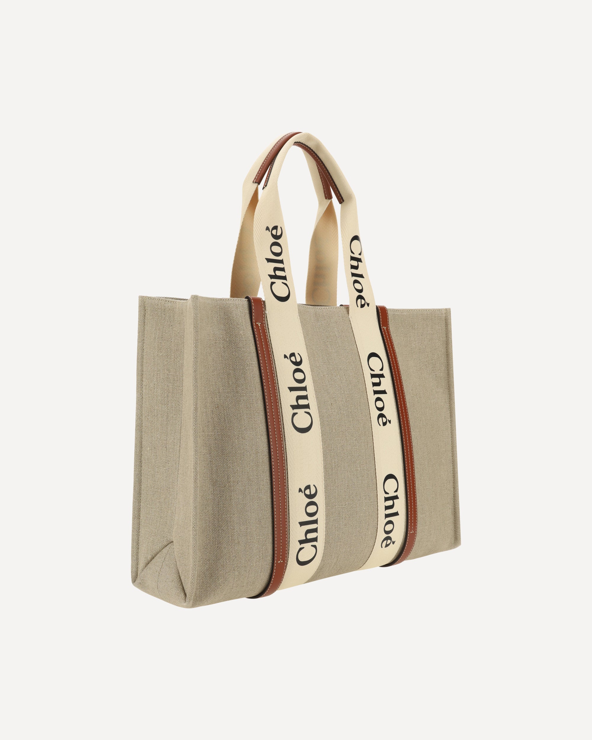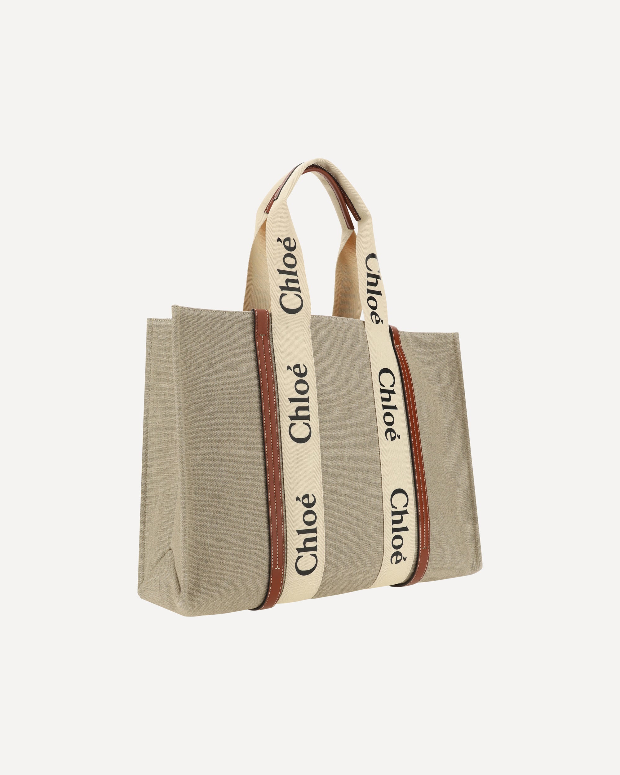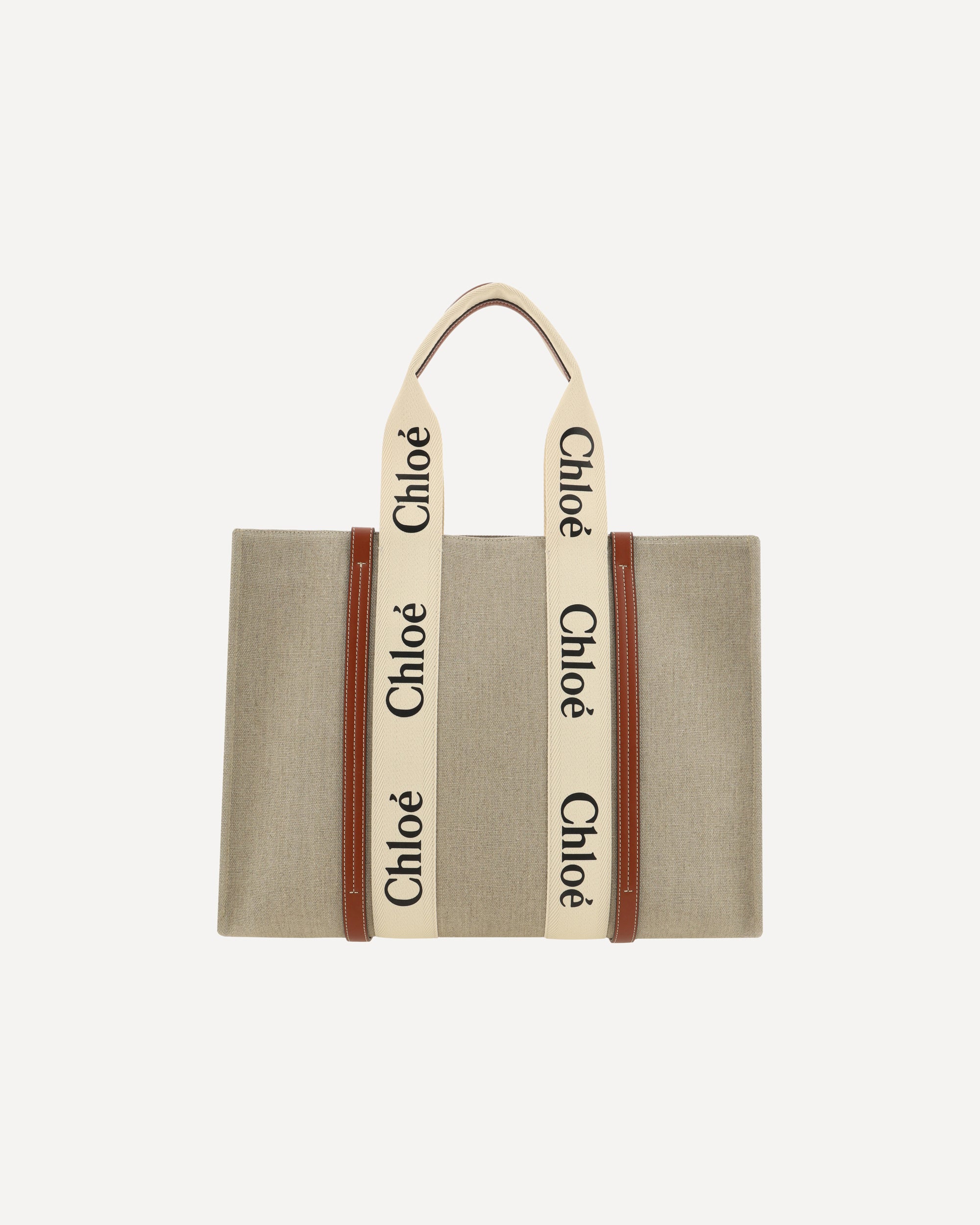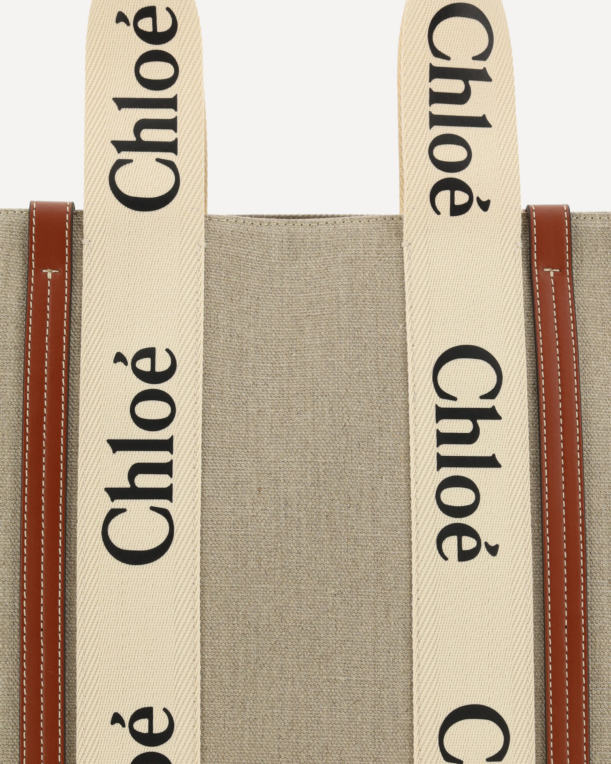 Linen Woody Handbag by Chloé, two flat top handles, appliqué handle extensions on bag panels, iconic brand monogram printed in contrast on handles, interior flat pocket, leather trim.