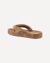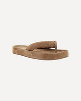 Pedro García's suede Almu Sandals feature a sleek and modern flip-flop design. The high, non-slip flat sole with logo provides stability and comfort, while the anatomical suede-covered insole ensures a soft and comfortable fit. The logoed insole adds a distinctive touch to the design. These sandals are perfect for a chic and practical summer look.