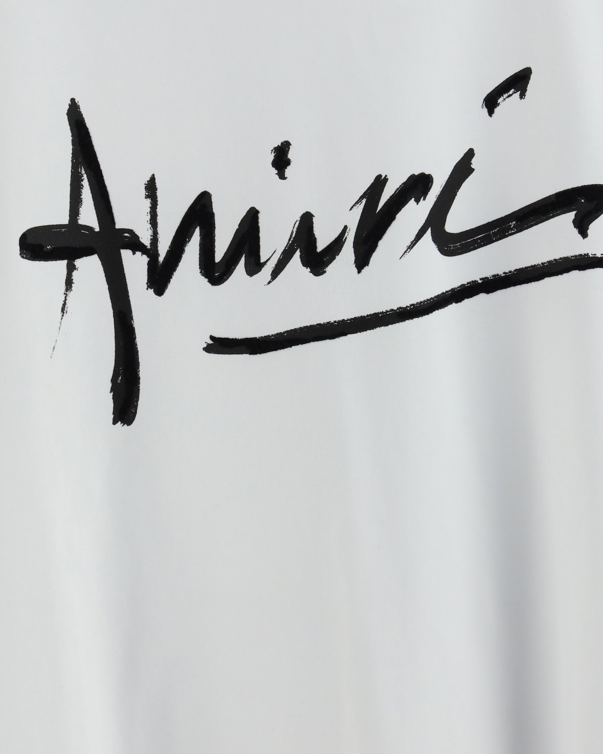The Script T-shirt by Amiri elevates a timeless essential through a contrasting script logo placed on the front, adding a refined graphic statement to a clean silhouette. Crafted from pure cotton, it features a classic round neckline, short sleeves, a straight hem, and tonal stitching, delivering an understated yet polished everyday piece.