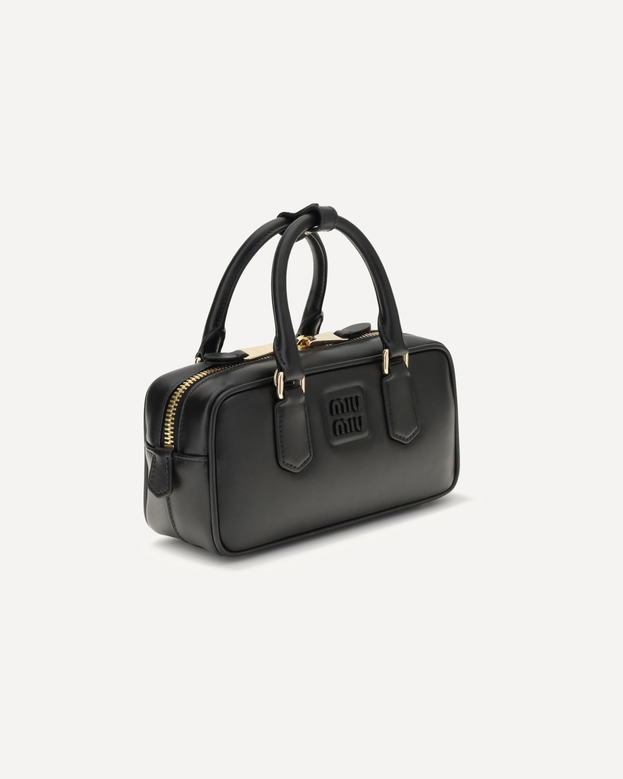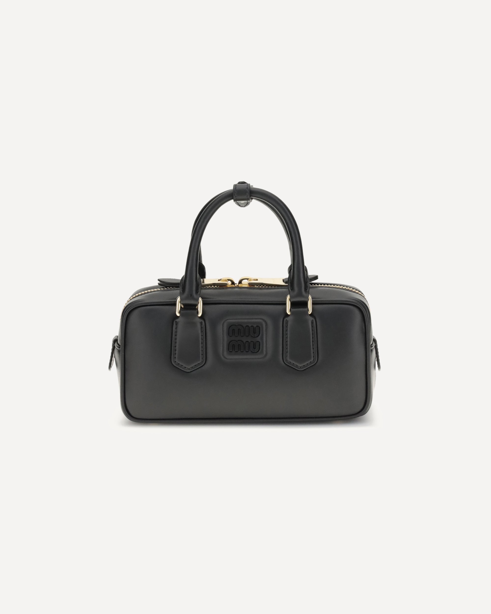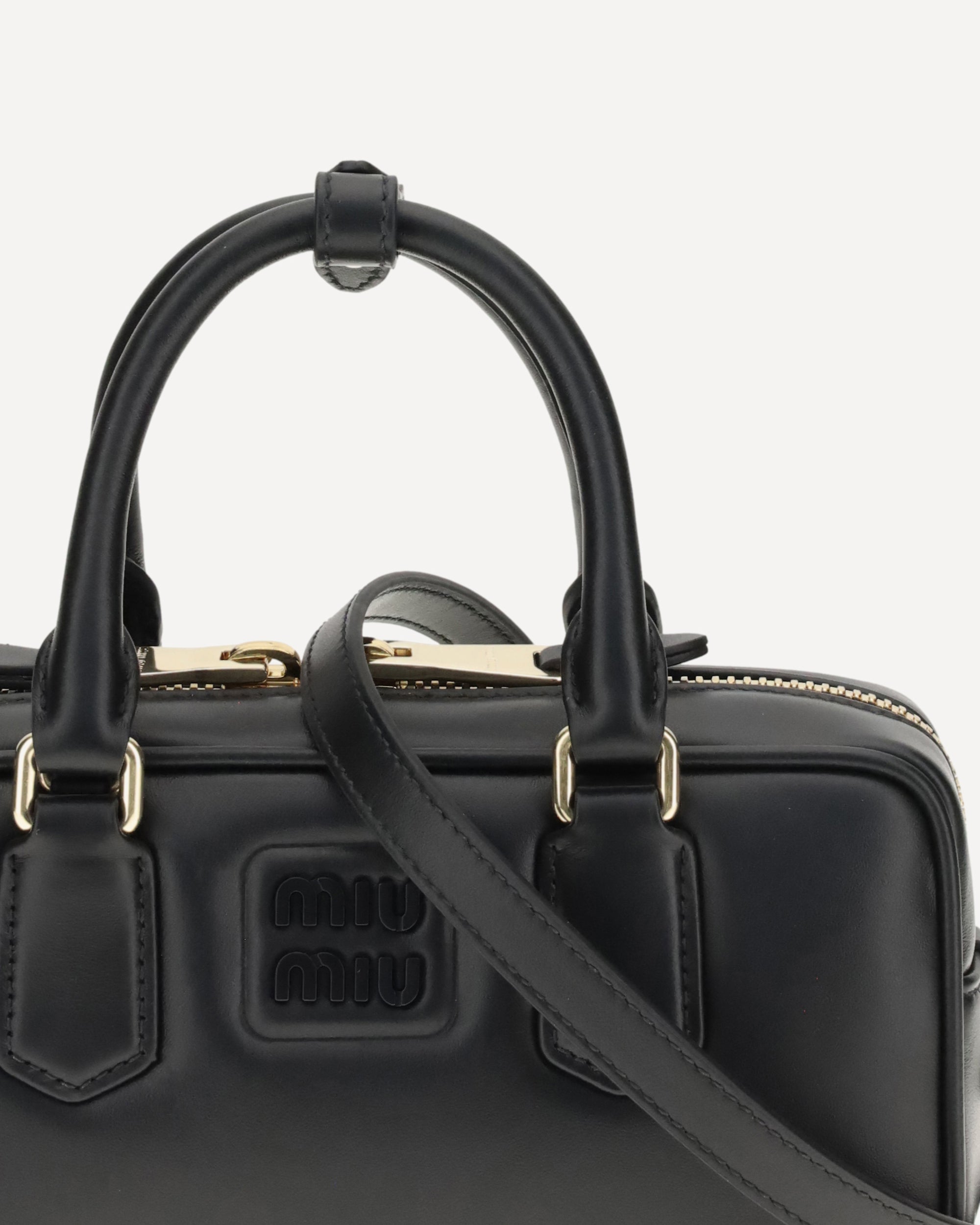 Leather Arcadie Handbag by Miu Miu, double rigid and tubular handles at top, top zipper closure, iconic brand monogram press-stamped on front, single interior compartment, removable and adjustable flat leather shoulder strap.
