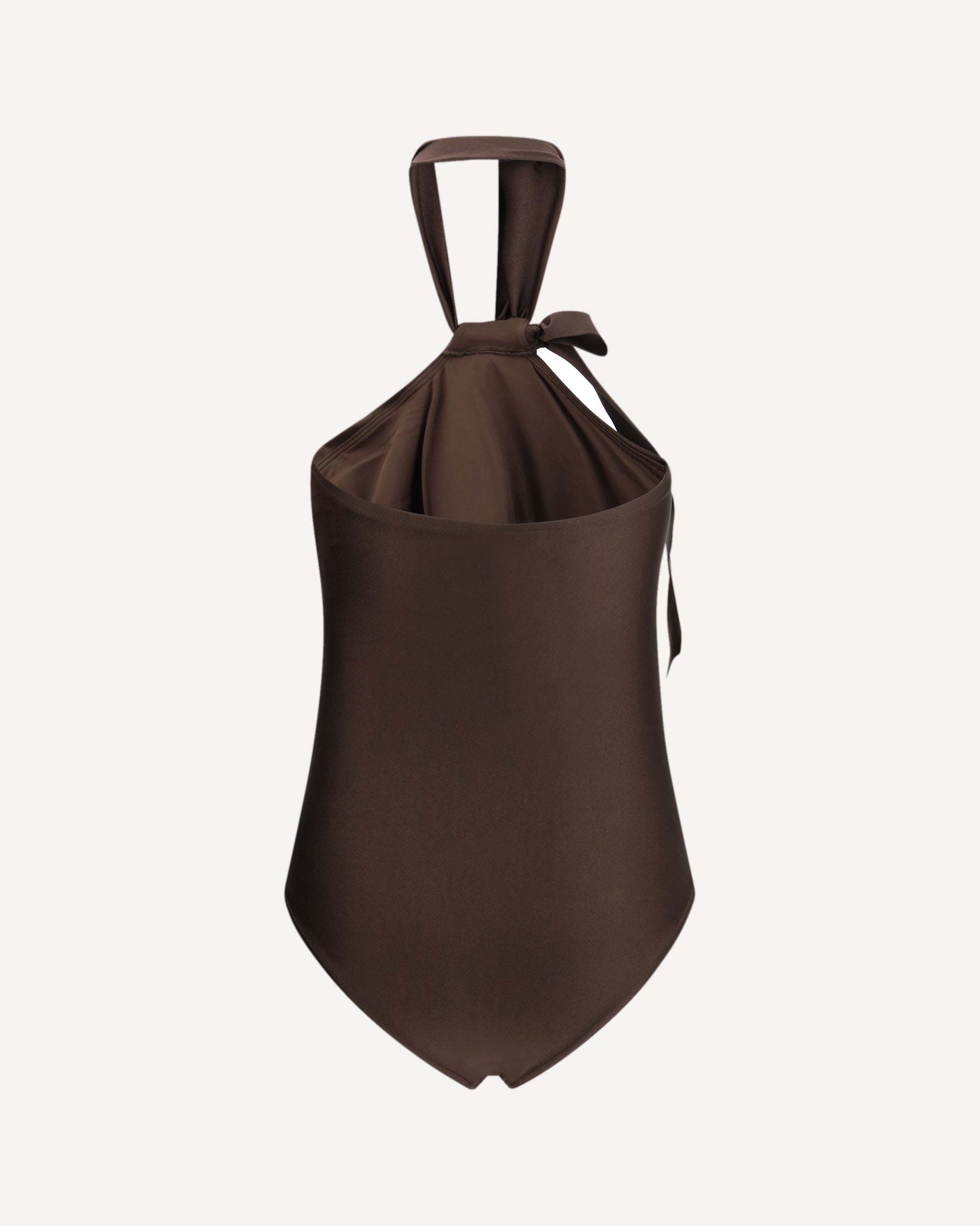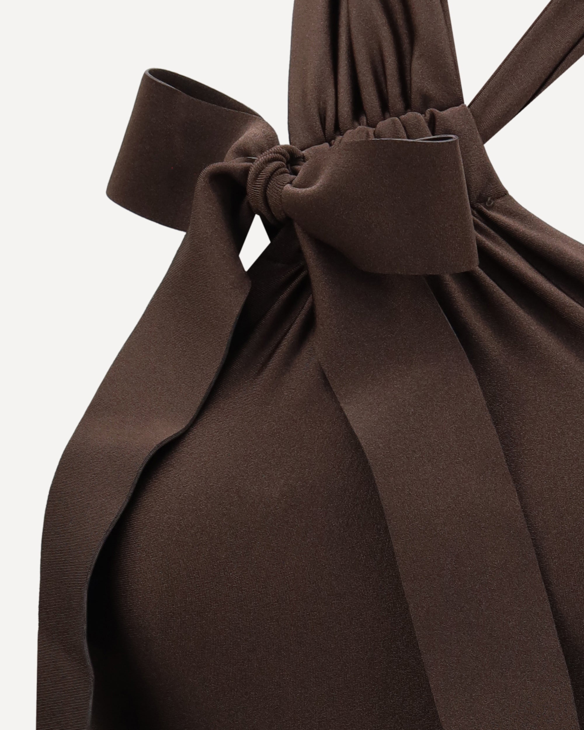 The Awaken Tie Neck one-piece bathing Suit by Zimmermann from the Resort Swim 2026 Collection embodies refined elegance with a sculptural silhouette. Crafted from shiny lycra in a sepia hue, it features a single adjustable shoulder strap with bow-tie detailing, adding a feminine and graceful touch. Designed with full coverage bottoms and fully lined construction, it offers both comfort and a flawless fit.