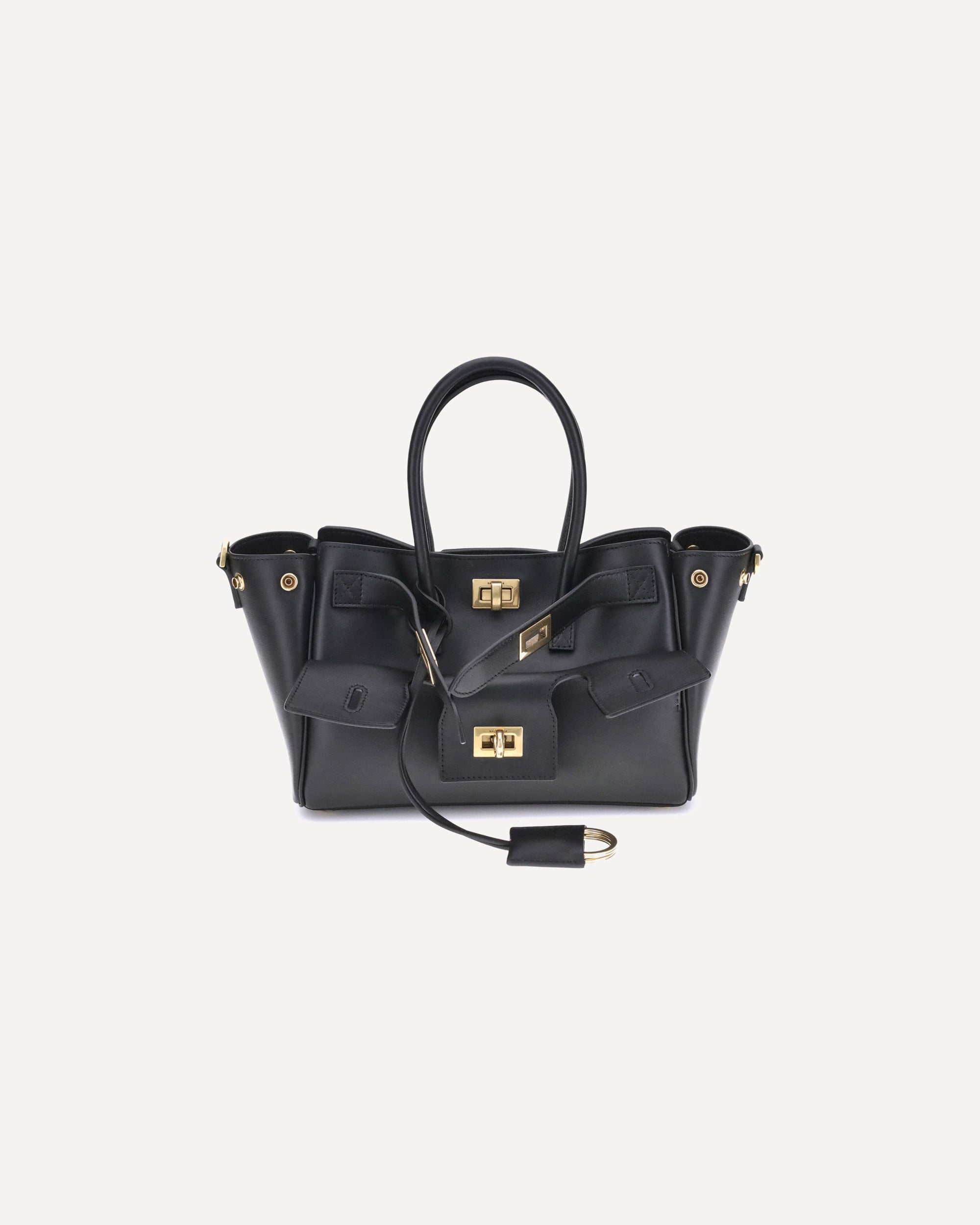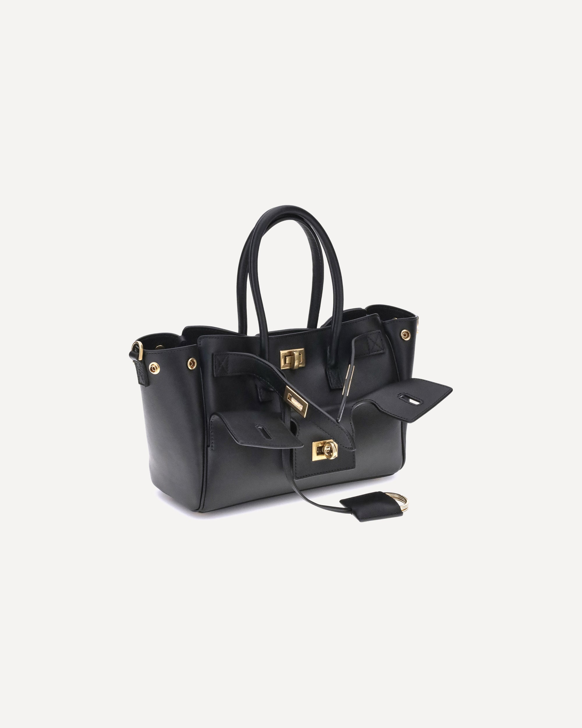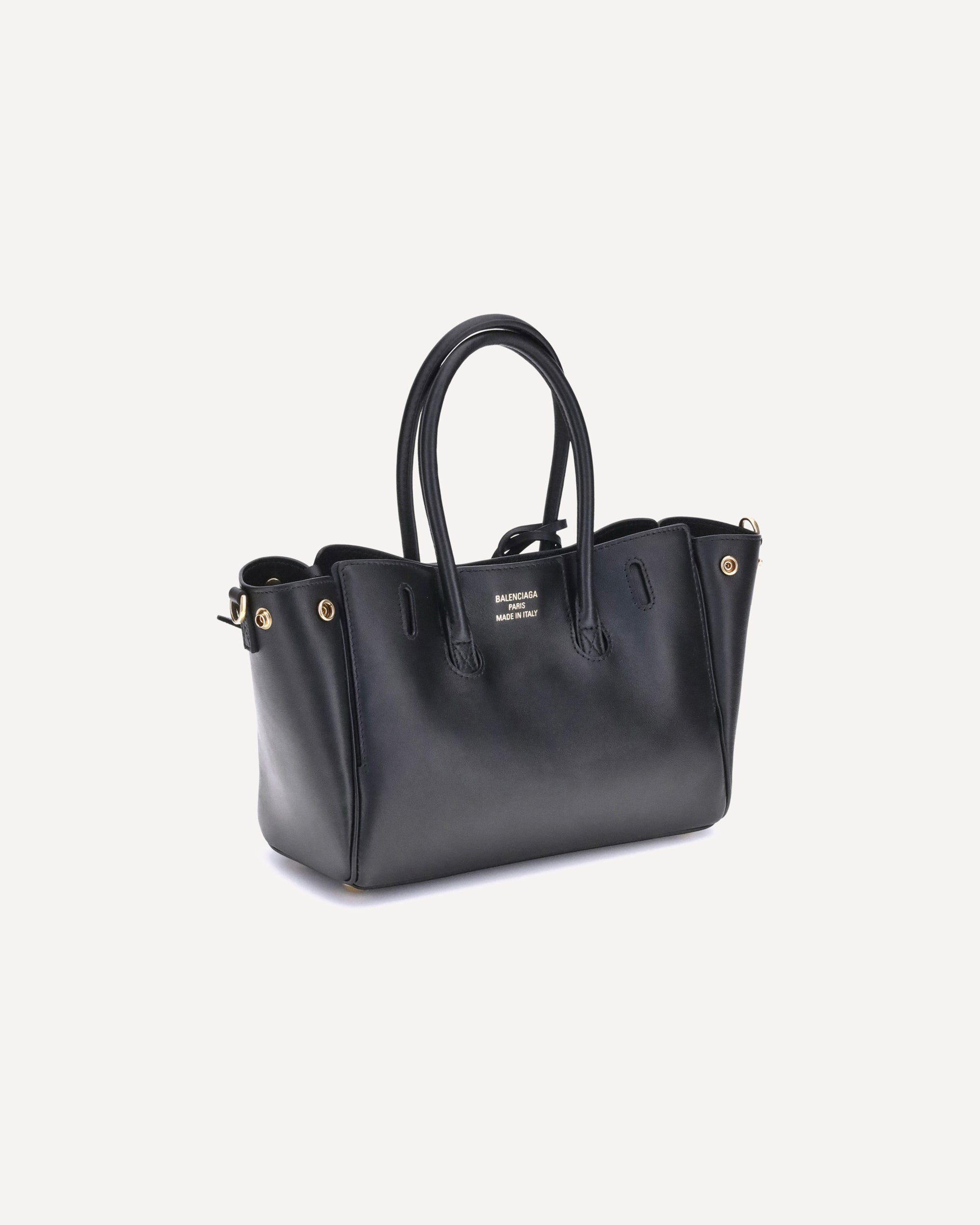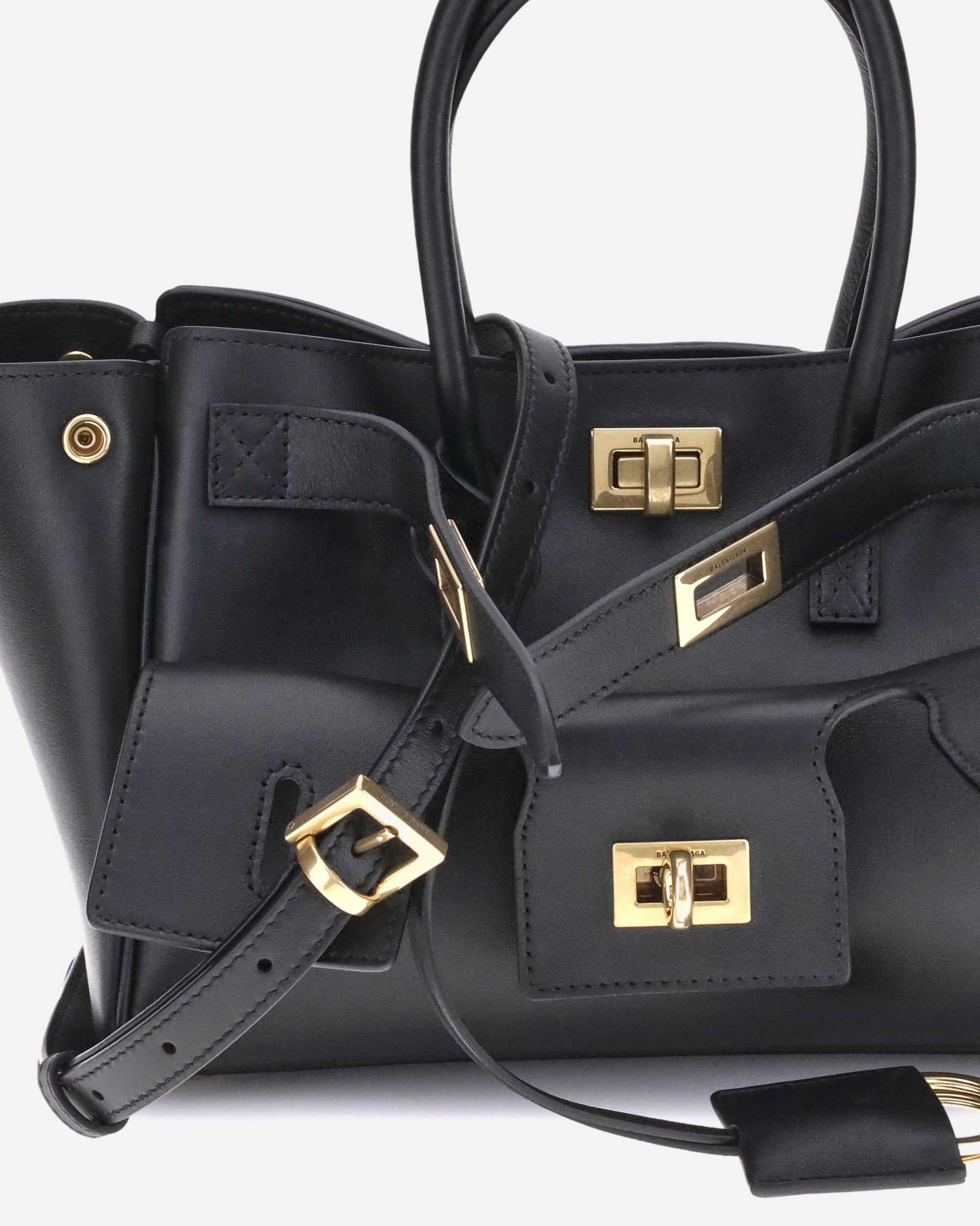 The Bel Air mini Handbag by Balenciaga is a versatile and iconic accessory. Carried on the shoulder, over the shoulder or by hand, it features two handles and an adjustable, removable shoulder strap. The embossed Balenciaga Paris logo with lamination decorates the back. Antiqued gold hardware, a removable key ring, side snap buttons and a swivel closure and engraved logo belts complete the design. It offers a large front pocket, an open main compartment and two interior zippered pockets, combining style and functionality.