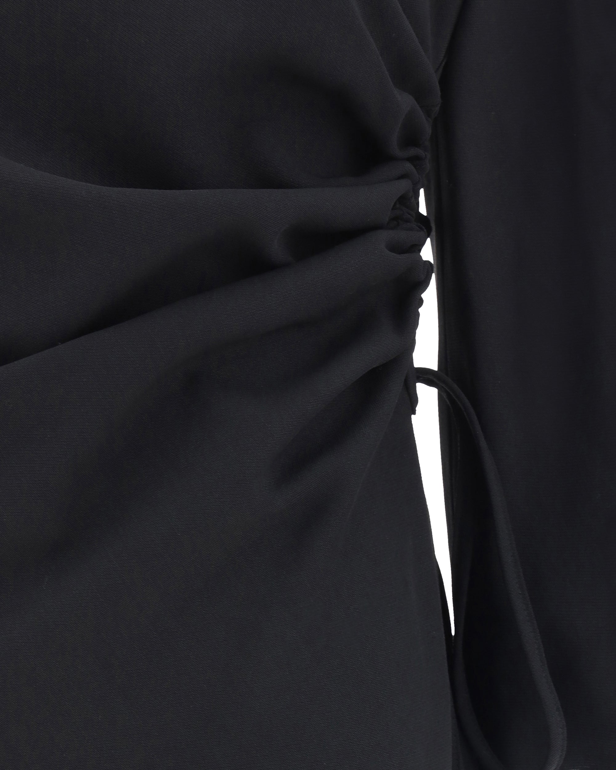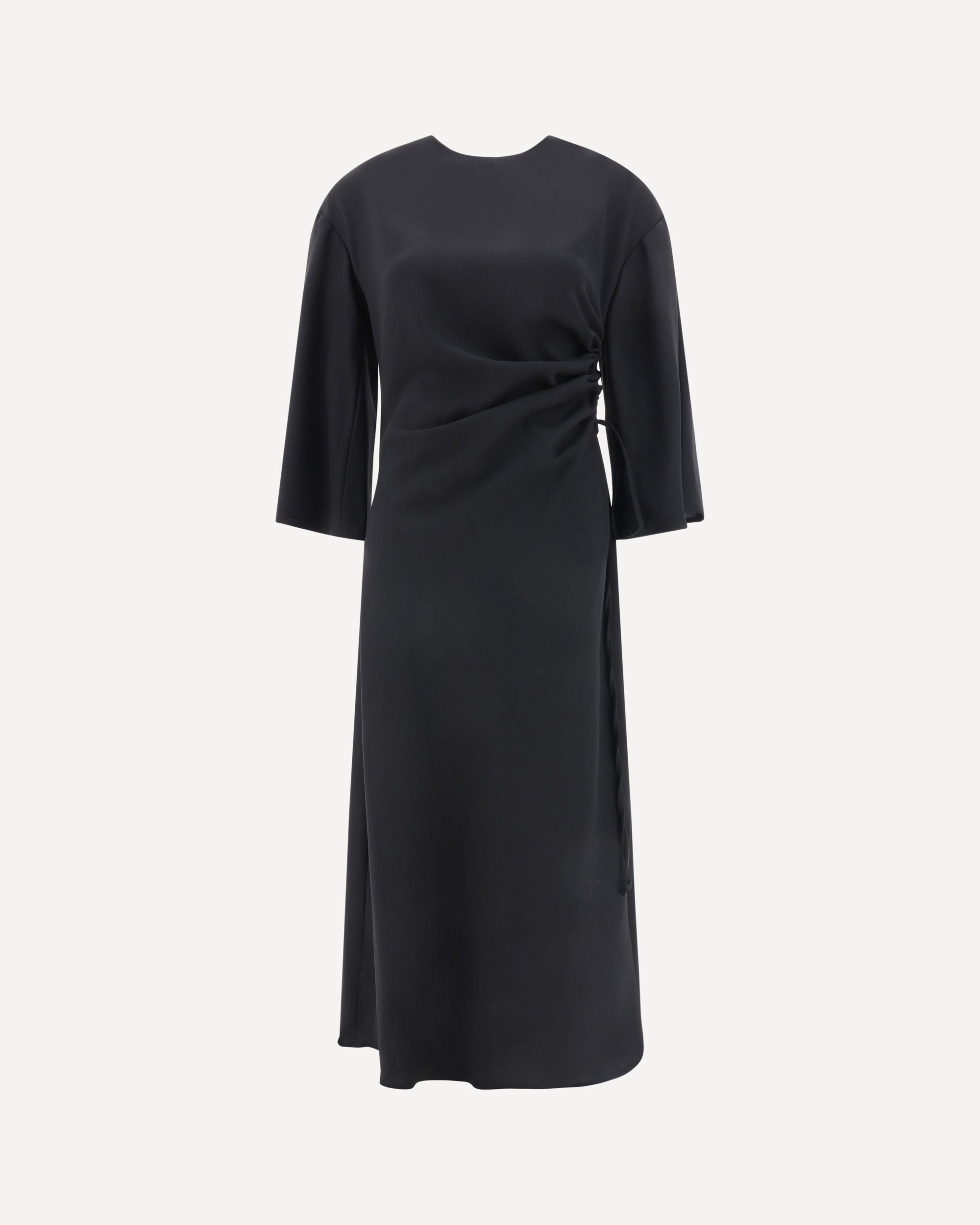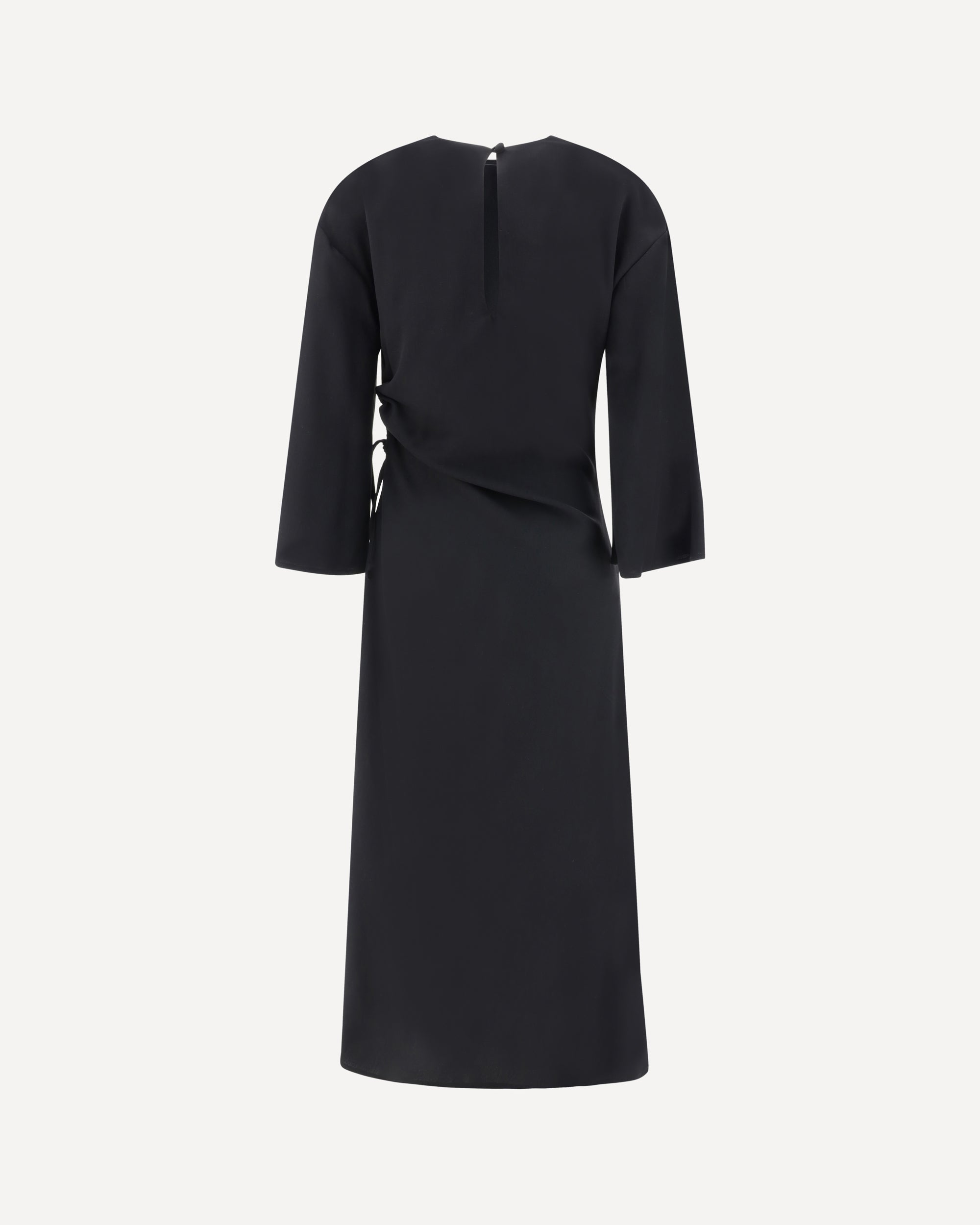 Virgin Wool Midi Bassano Dress by Crida Milano, flared long sleeve design, classic crew neck, button back closure, adjustable side cut-out detail, monochrome pattern, regular fit.