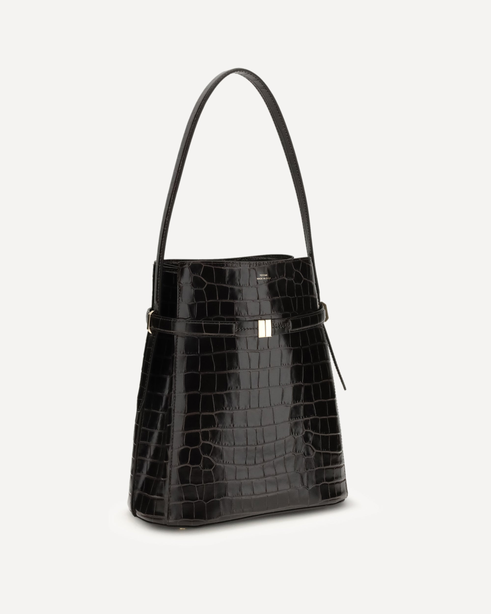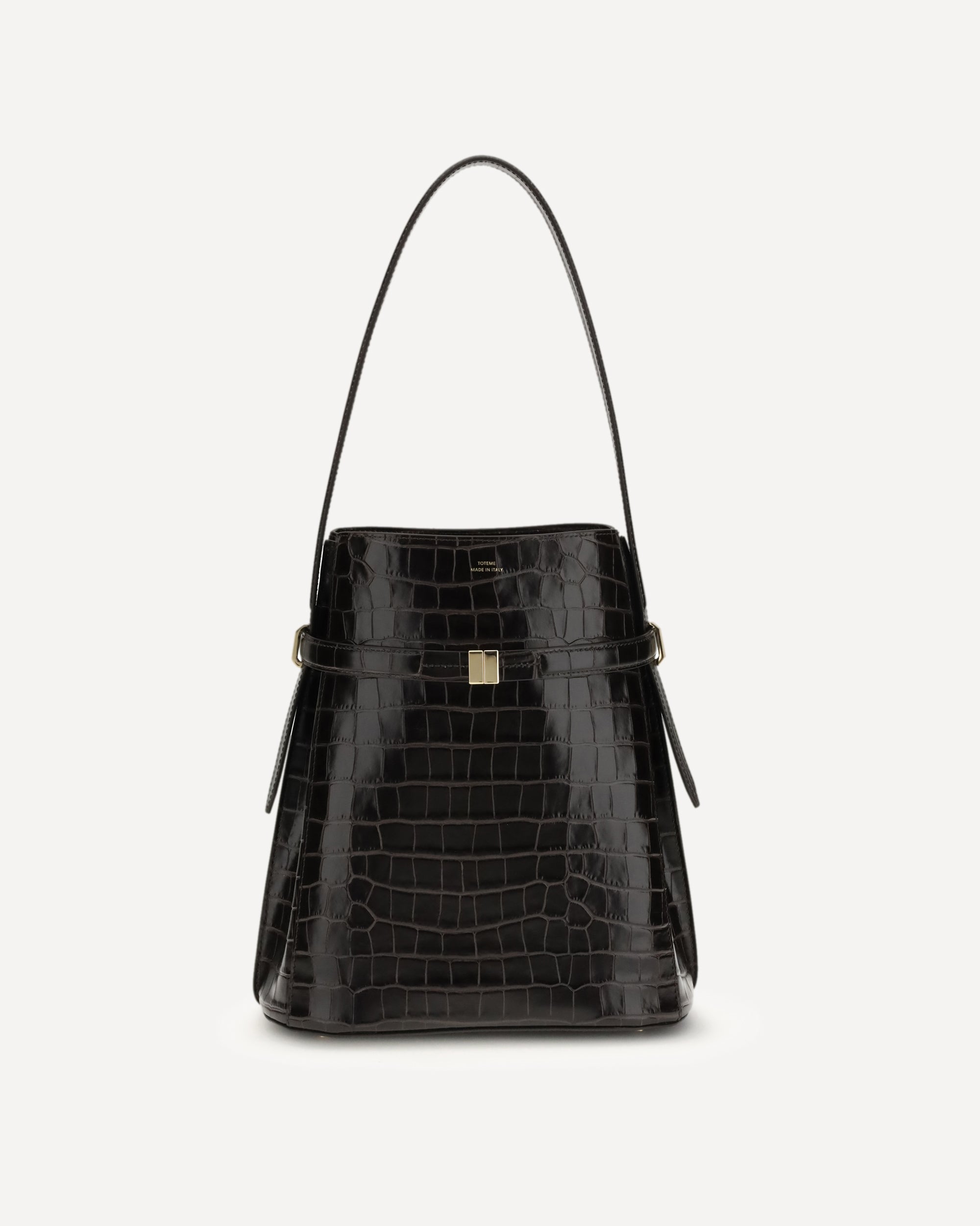 The Crocodile print leather Bucket Bag by Toteme with belt combines luxury and functionality with fine leather crafted in Italy and gold hardware that enhances its elegance. The elegant belt allows you to shape the silhouette, cinching it for a compact profile or leaving it open for more storage. Inside, two pouch pockets provide practicality, while the shoulder strap allows it to be worn comfortably, making it a sophisticated and versatile accessory.