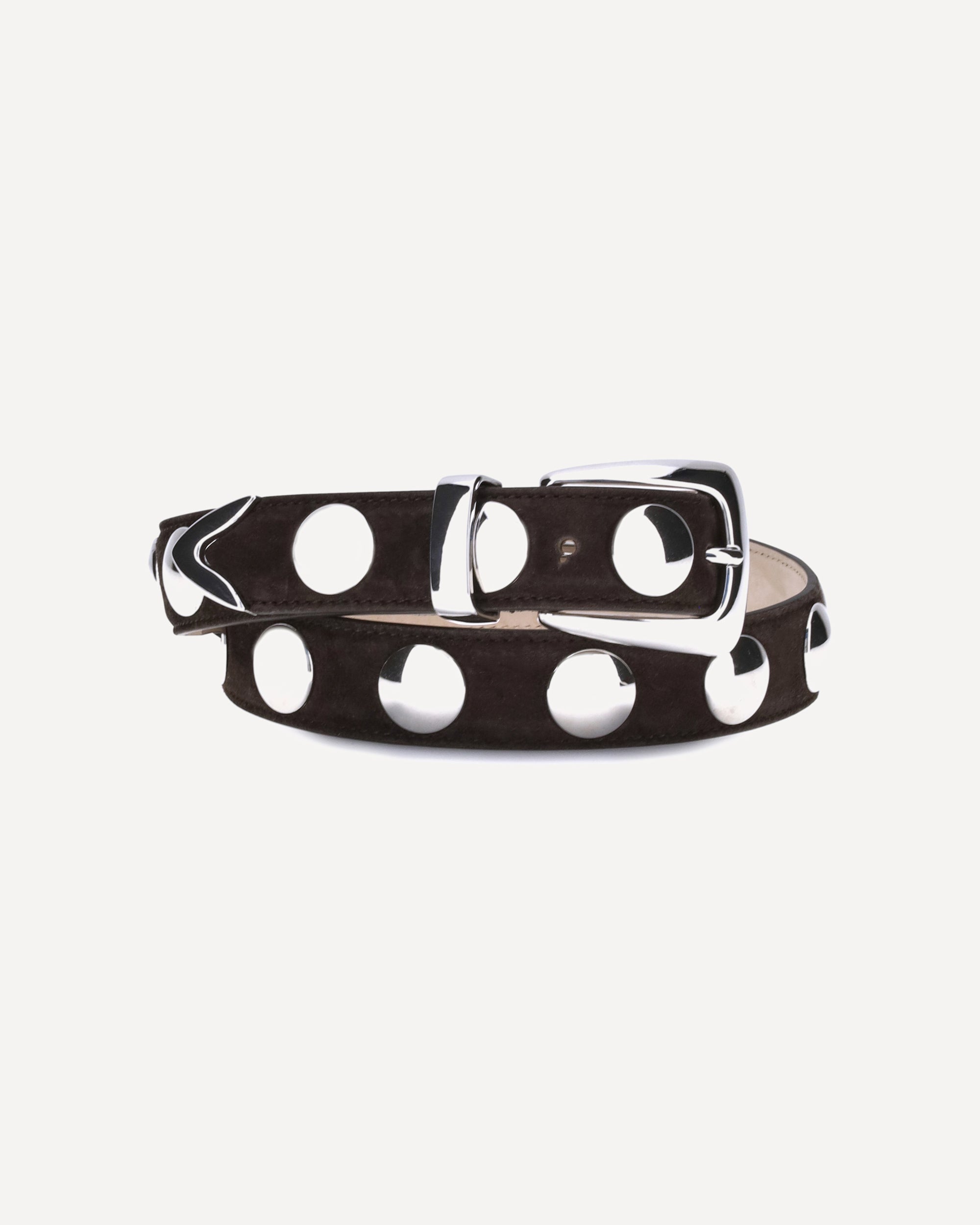 The Benny leather Belt by Khaite combines elegance and panache in a refined design. Made of smooth leather, it is decorated with silver spherical studs and completed with a matching metal buckle. Perfect for enhancing dresses, blazers or high-waisted pants with a bold and sophisticated touch.