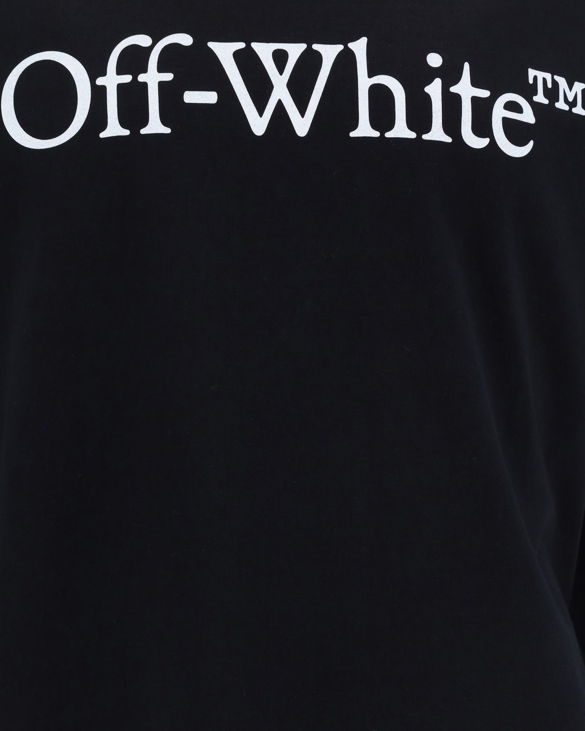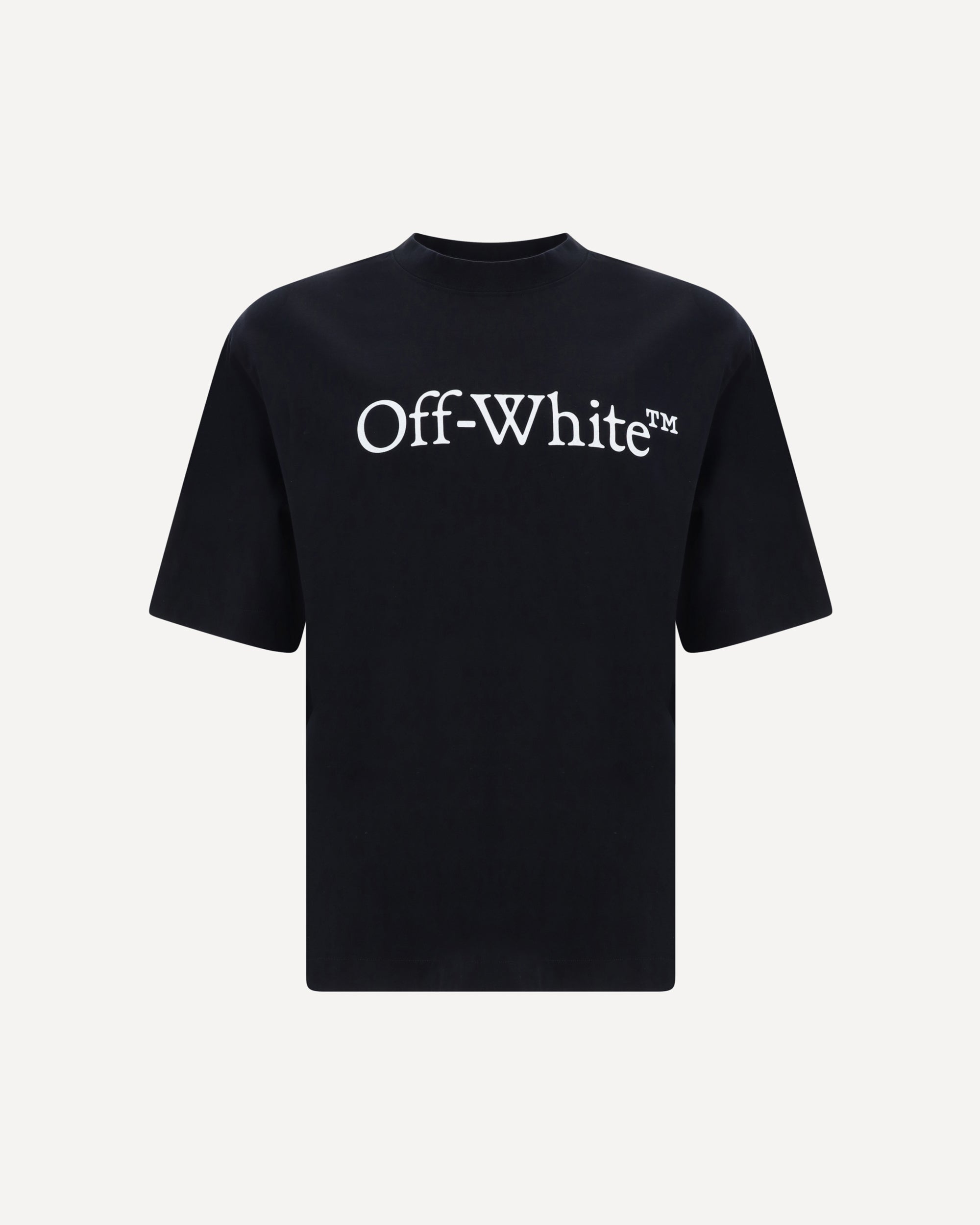 Cotton Big Bookish Skate T-Shirt by Off-White, features ribbed crew neck, contrasting iconic brand monogram on front, monochrome pattern, regular fit.