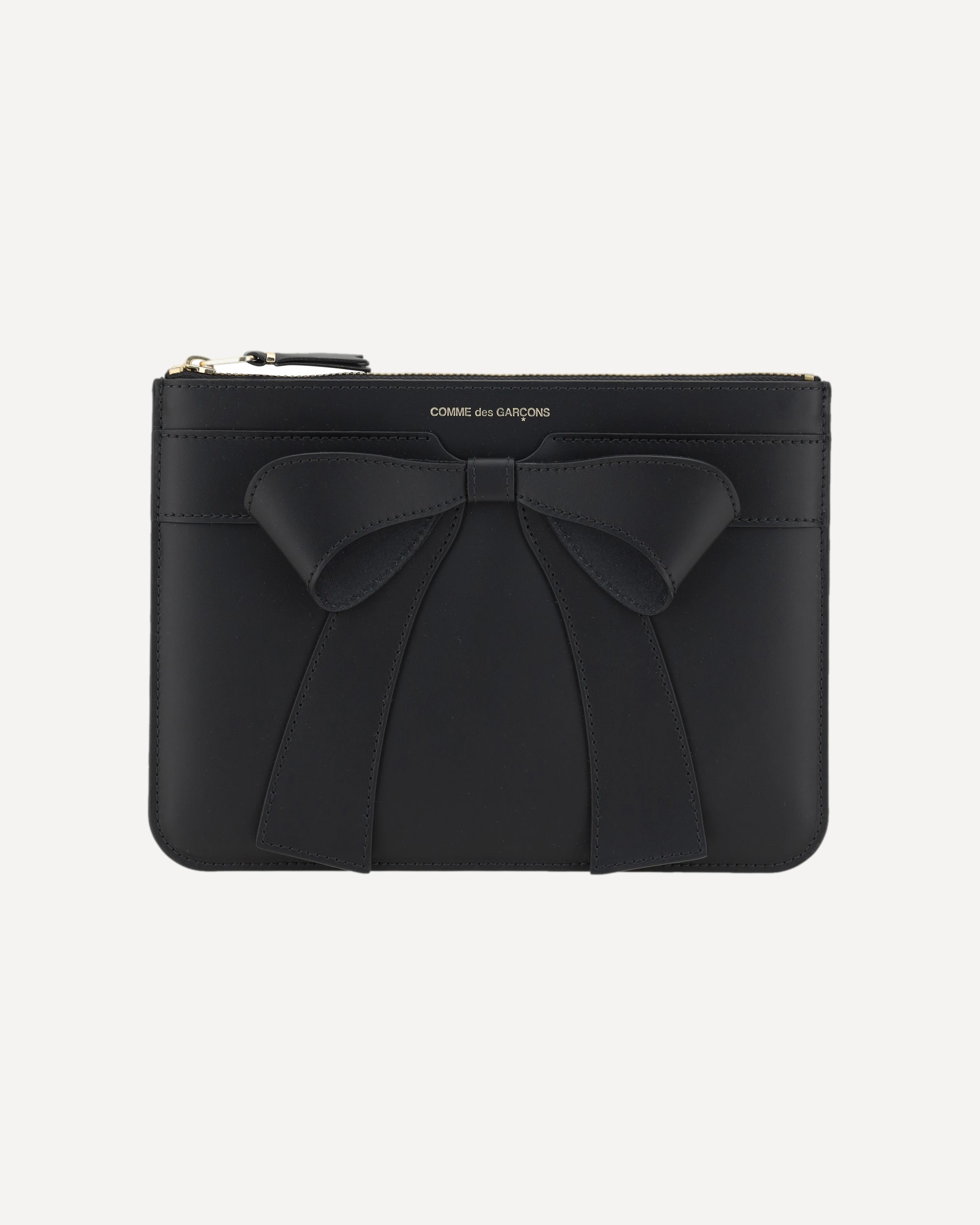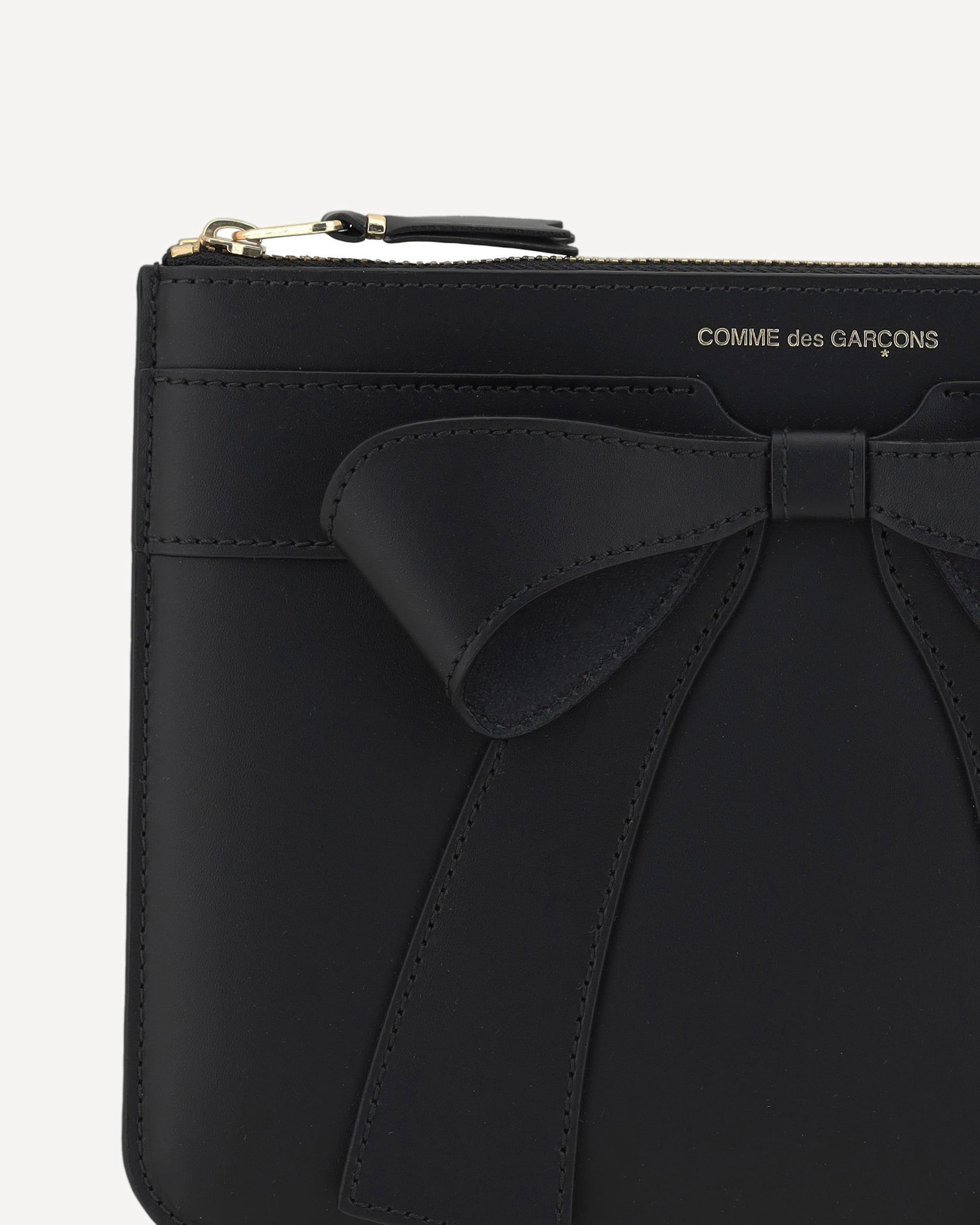 The Big Bow leather coin purse by Comme des Garçons is an elegant and refined accessory, featuring a press-stamped logo on the front. The 3D bow detail applied on the front adds a touch of originality and femininity. The top zipper closure ensures practicality and security, while the interior, with a single compartment, offers enough space to store coins or small items.