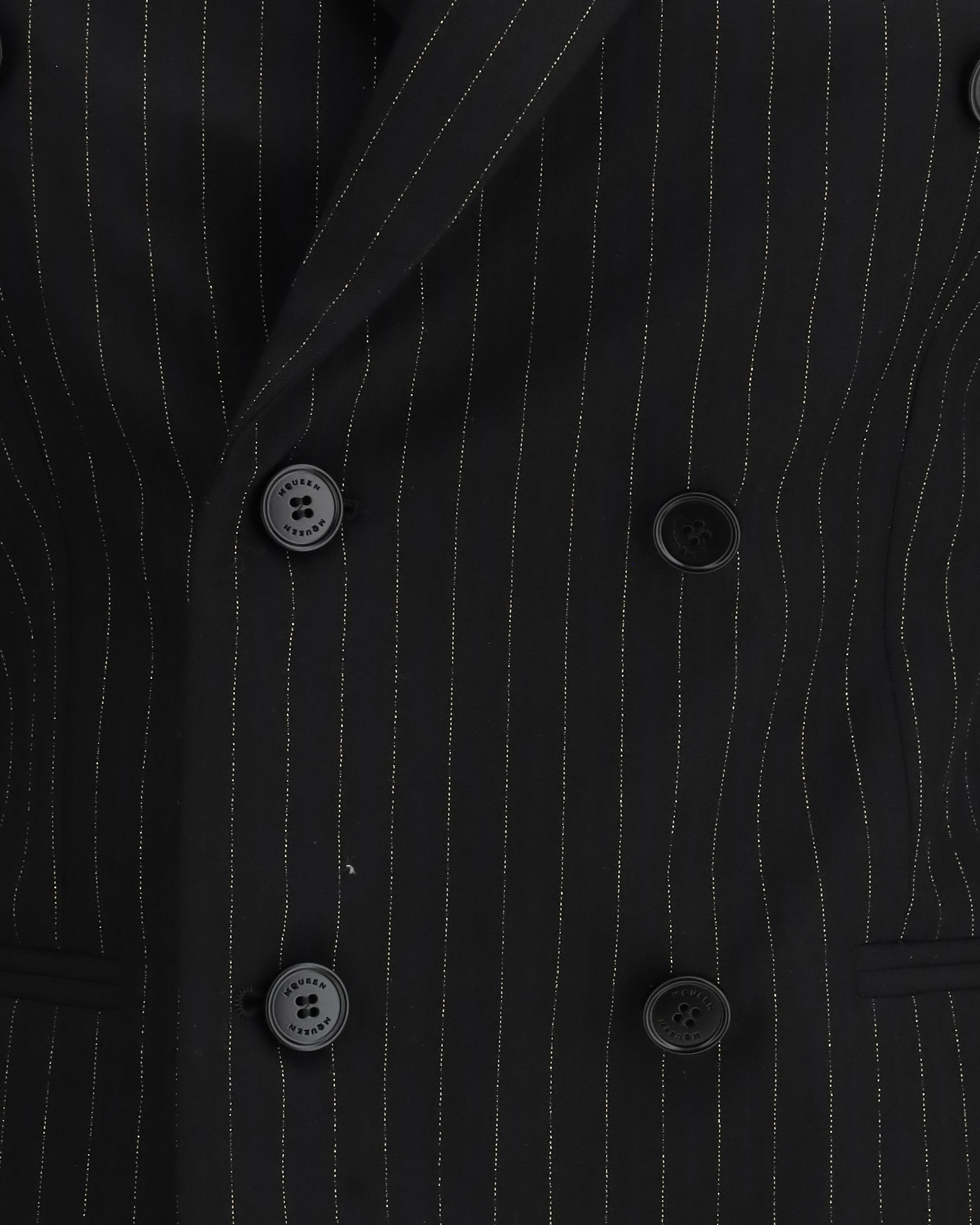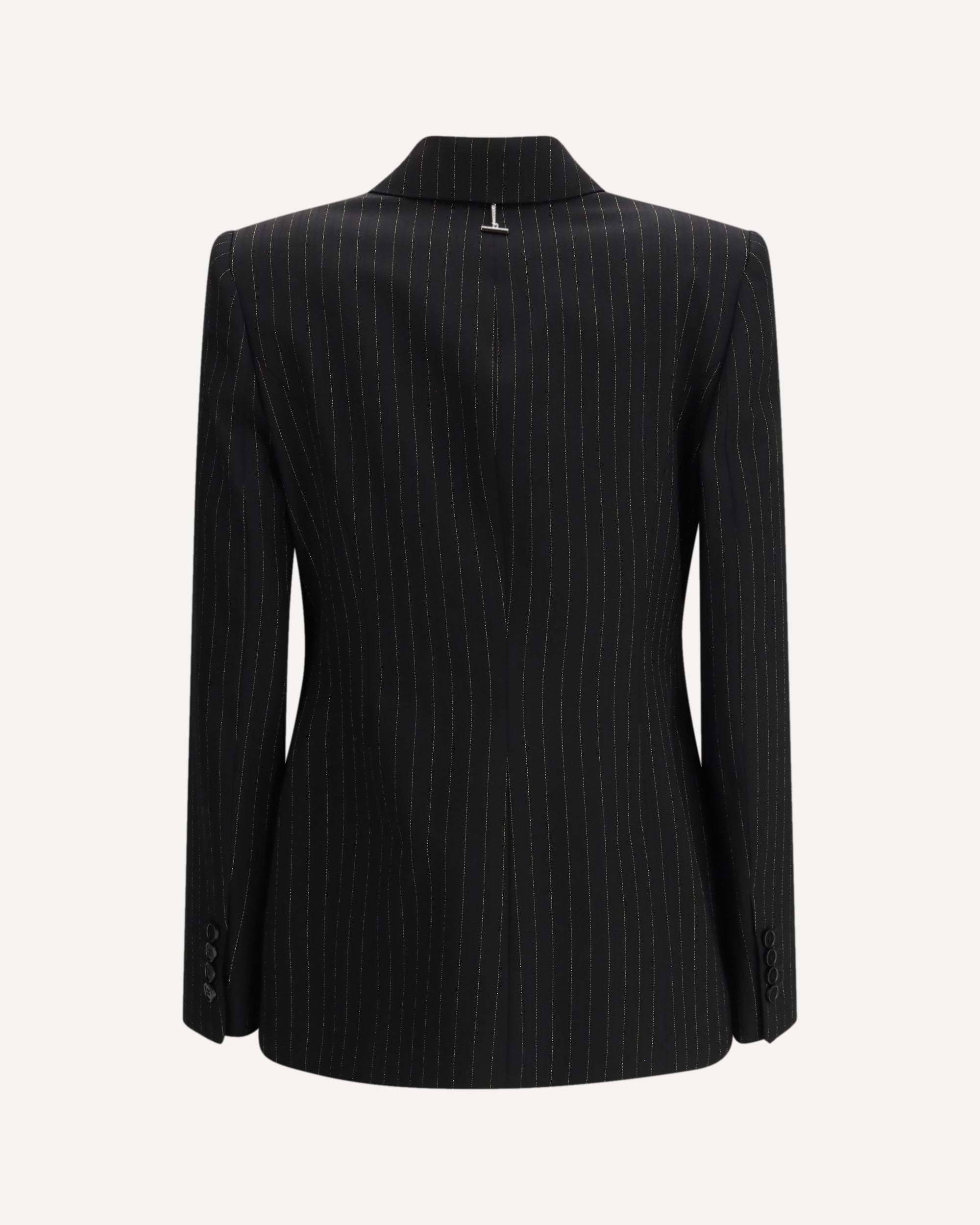 The pinstriped double-breasted Jacket by Alexander McQueen reimagines classic tailoring with a bold, contemporary edge. The fine stripe pattern is enhanced by a refined metallic pinstripe effect, adding graphic depth while preserving elegance. Classic lapels, a double-breasted button fastening, a chest pocket, and side welt pockets shape a sharply constructed silhouette. At the back, T-chain details introduce a distinctive, symbolic accent that reflects the house’s unmistakable identity. A statement piece designed for confident, sophisticated dressing with a strong sartorial attitude.