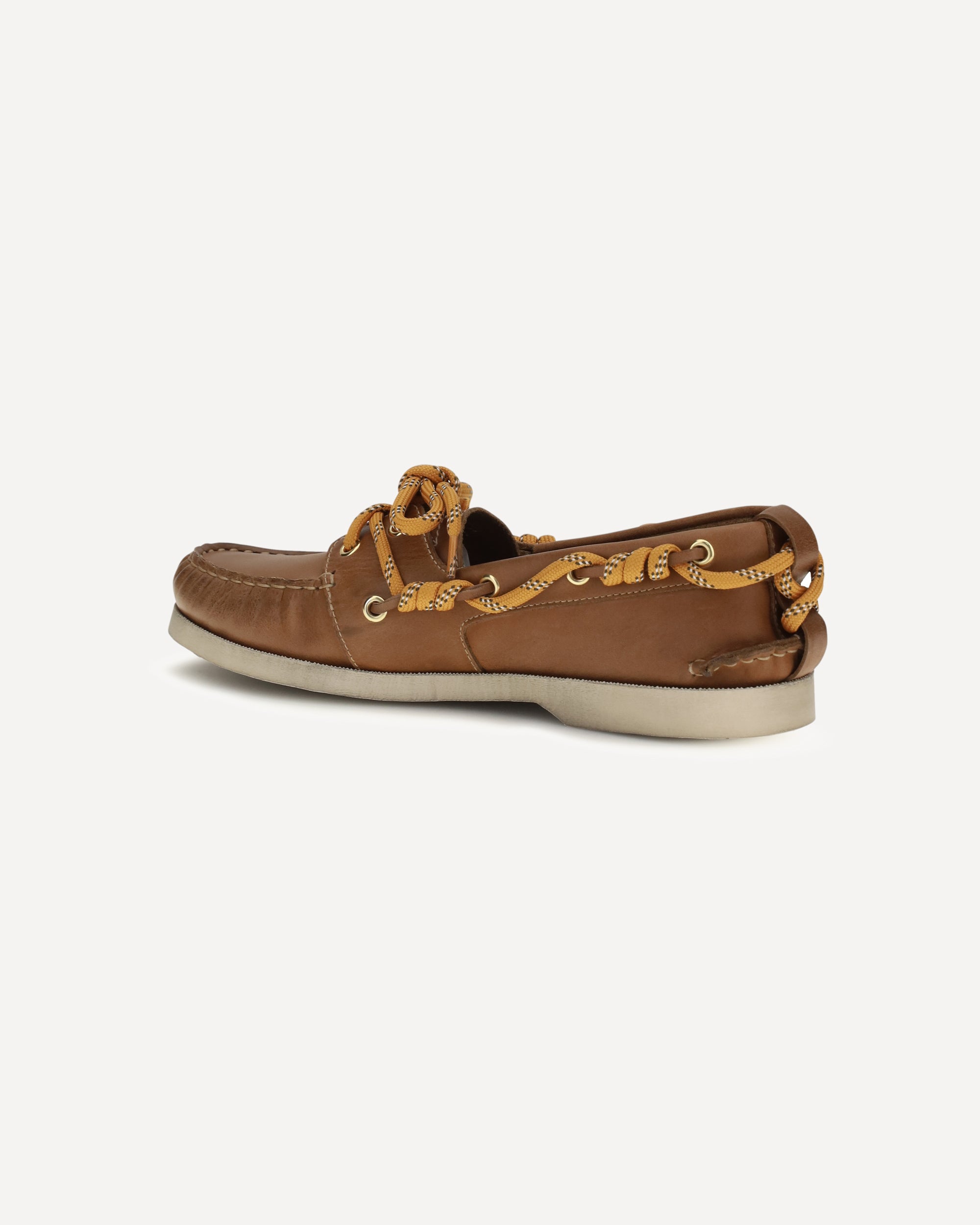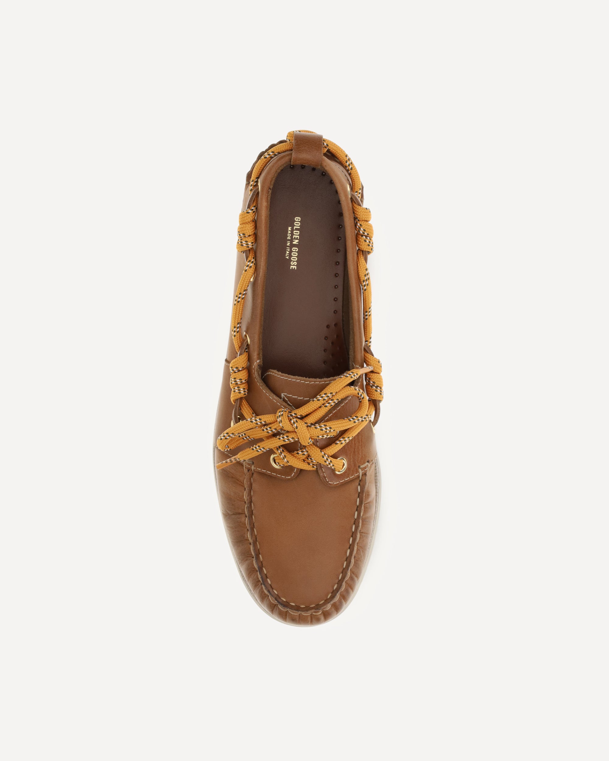 The Cruise boat Loafers in leather by Golden Goose are a perfect blend of casual style and unique details. Featuring gold metal eyelets and an orange trekking cord with gold-colored metal charms, these loafers offer a distinctive touch. The tone-on-tone loop detail on the heel adds elegance, while the vintage treatment gives them a refined and authentic look. Ideal for a relaxed yet sophisticated look.
