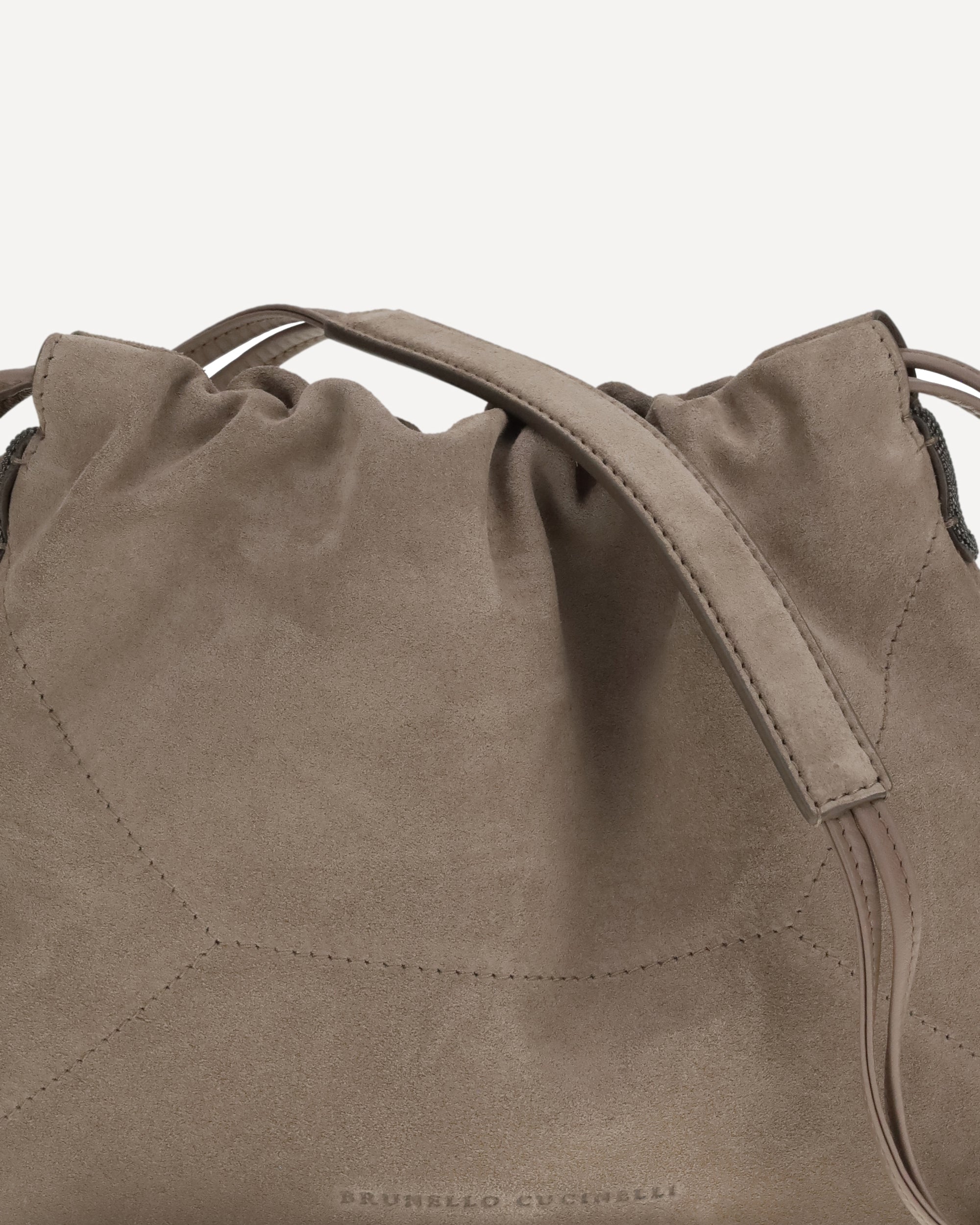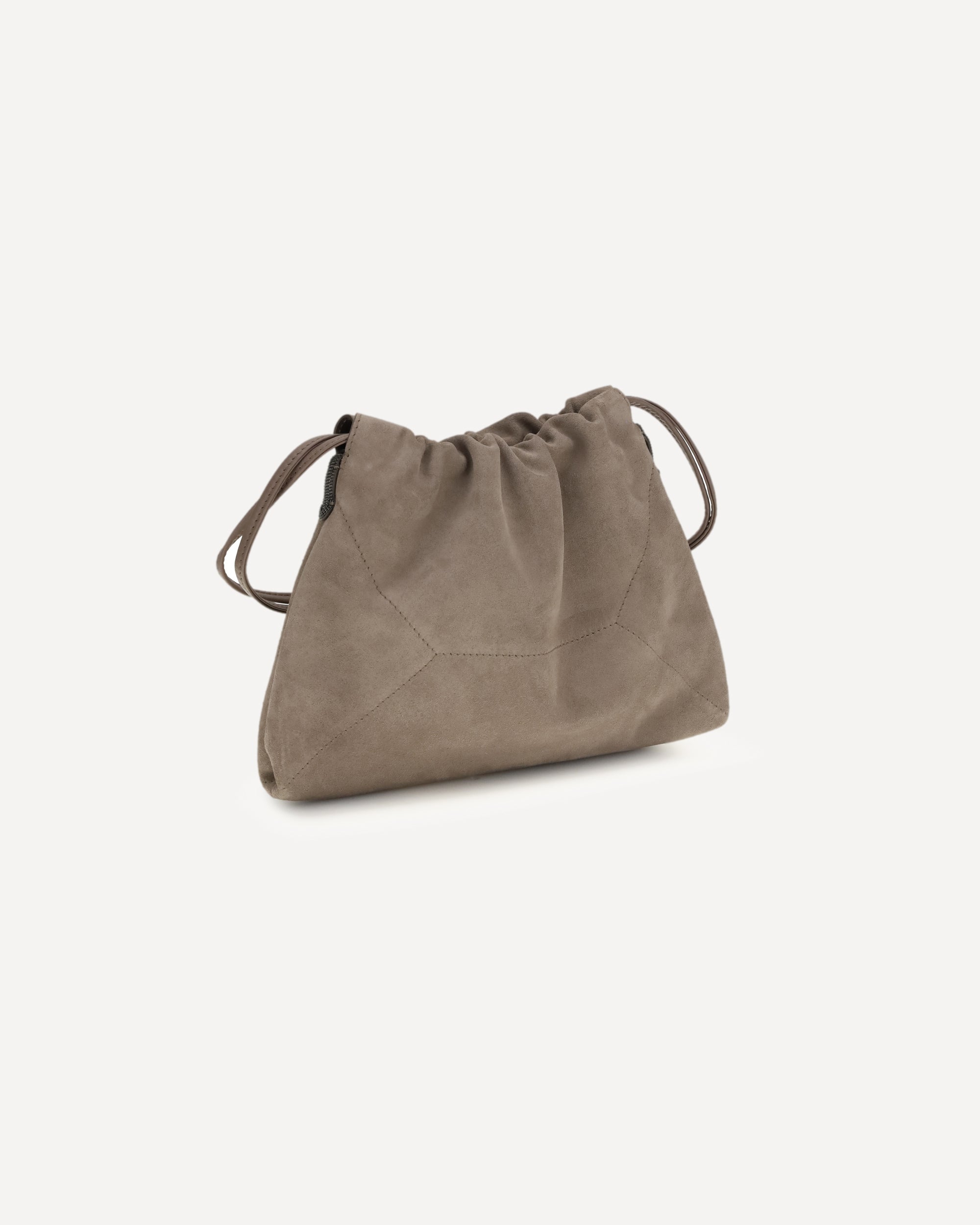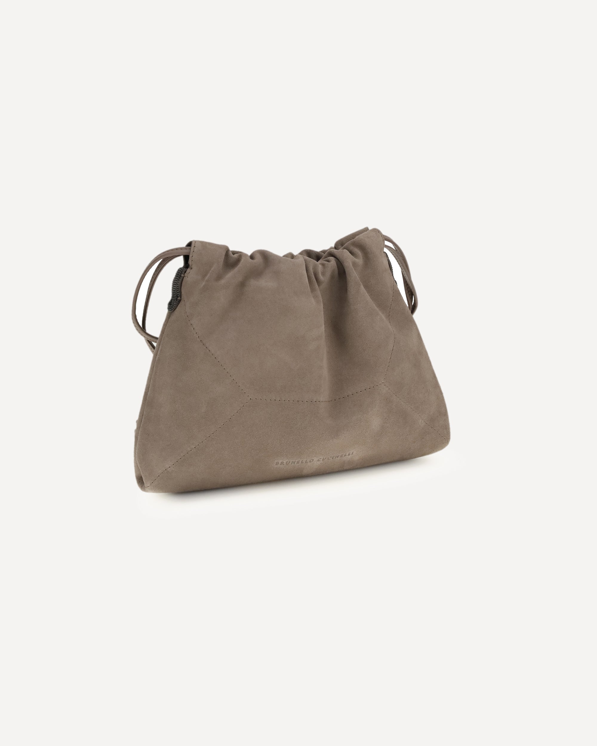 The suede Pouch Bag by Brunello Cucinelli is distinguished by a refined and essential style. Featuring a drawstring closure and shoulder strap, it features a leather lining with a practical inside pocket. The design is embellished with a nickel-free monile decoration, which adds a bright and sophisticated touch.