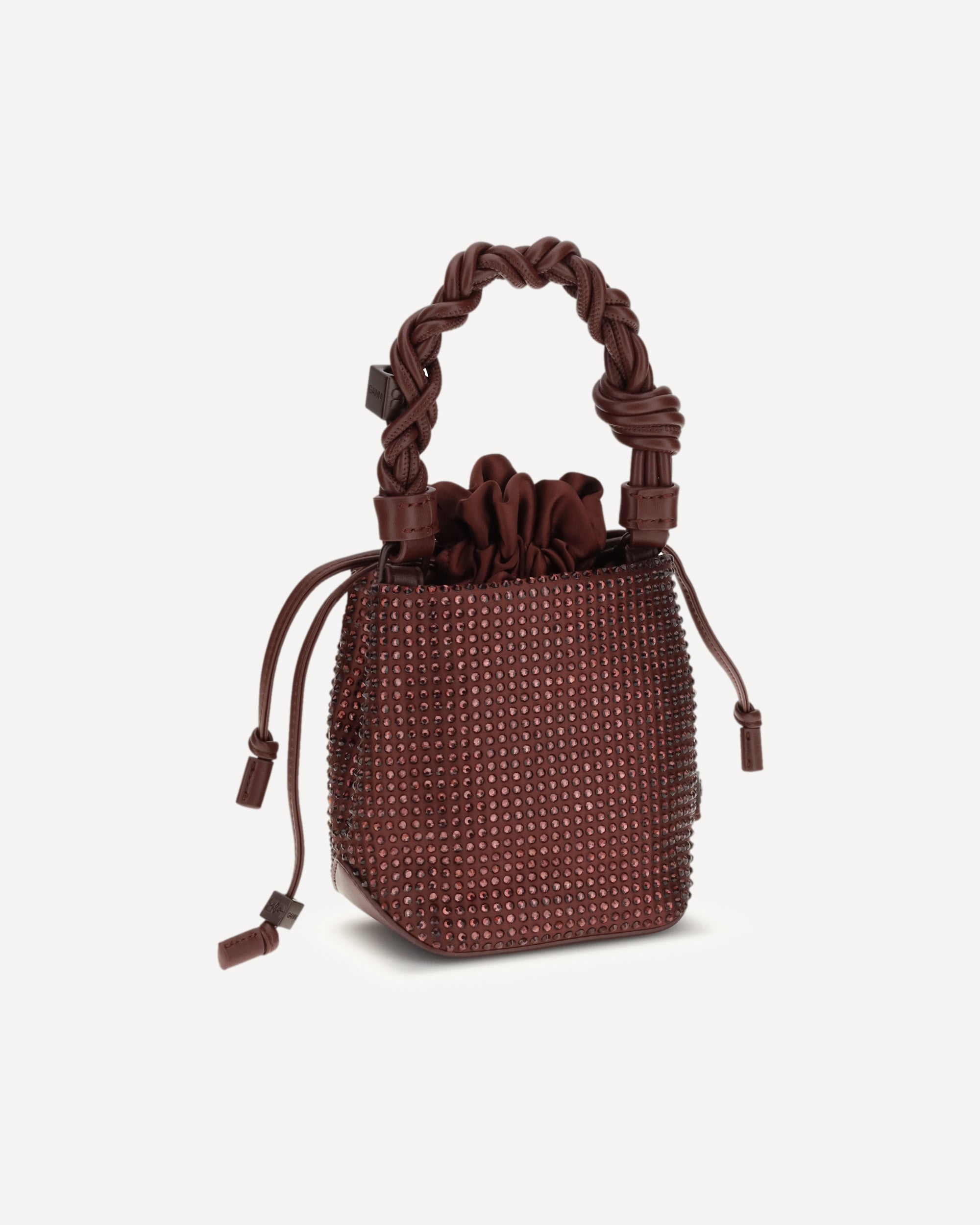 The mini Bou Buckle Bag by Ganni with Rhinestones is a little gem of style, entirely studded with tone-on-tone rhinestones. It features a braided top handle with knot detail and an adjustable, removable shoulder strap that adds to its versatility. Completing the design is an internal drawstring clutch bag, embossed logo on the back and a flat pocket for a compact yet character-filled accessory.