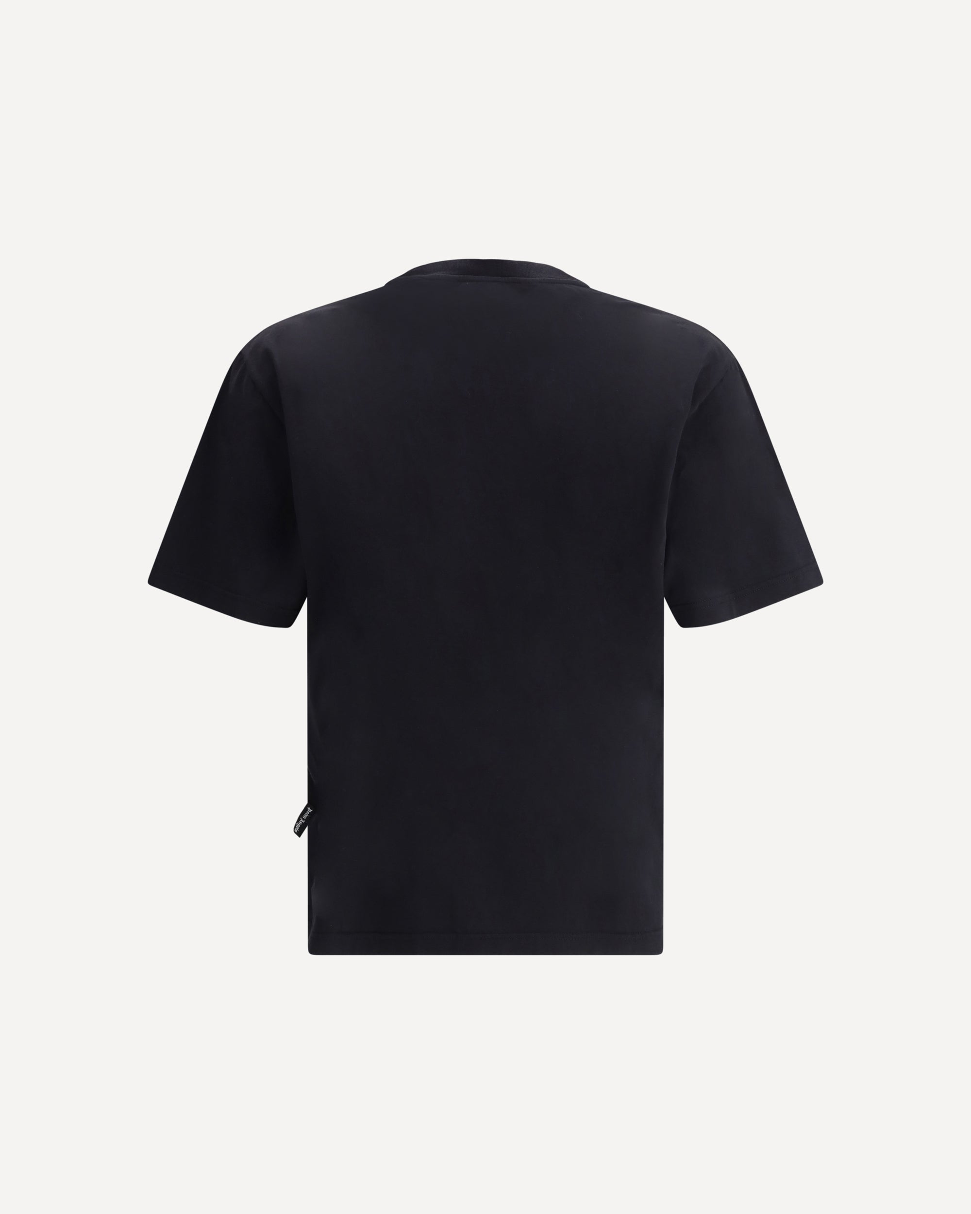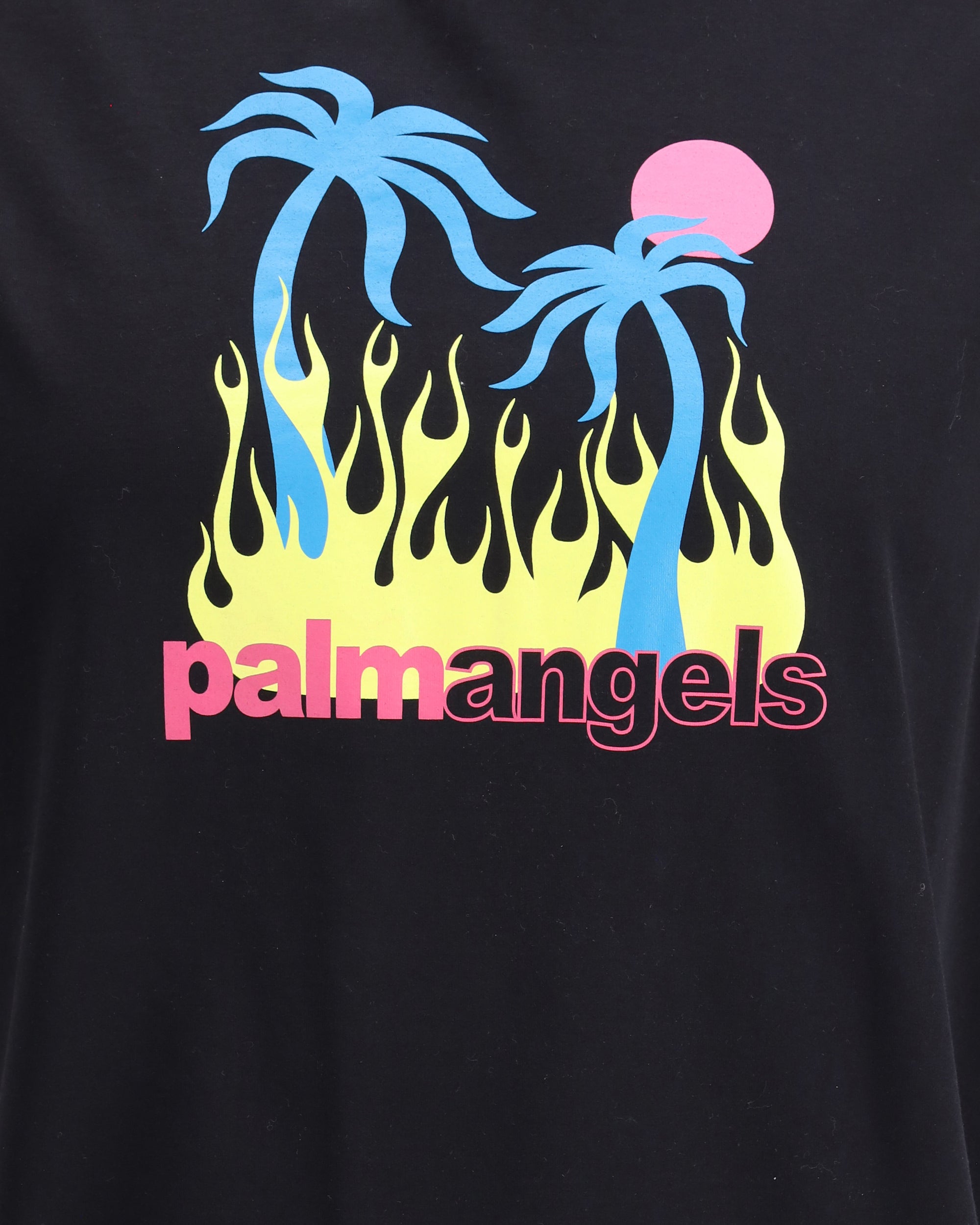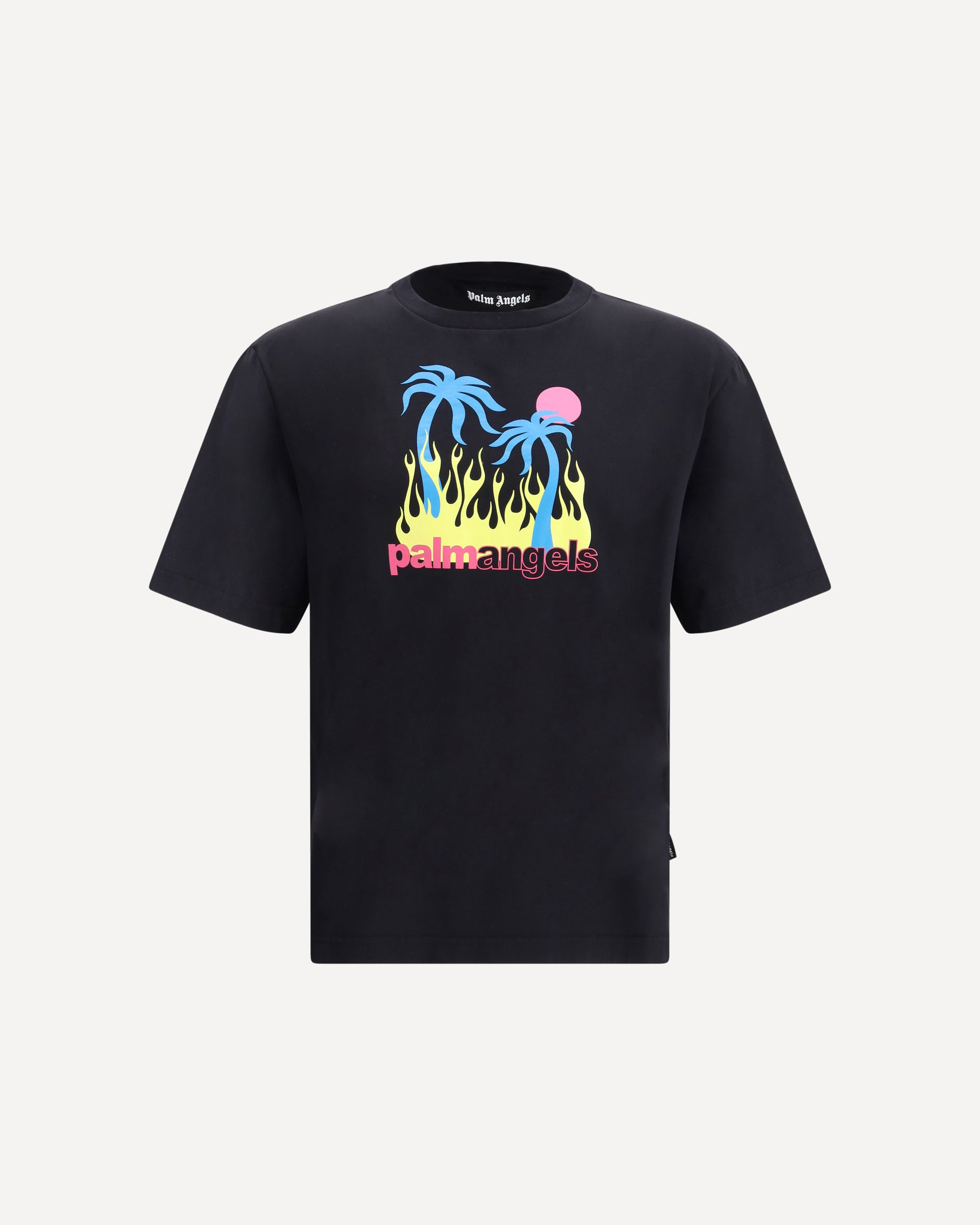 Cotton Burning Oasis T-Shirt by Palm Angels features a ribbed crew neck and a multicolored maxi print on the front, featuring the brand's iconic monogram. This bold and modern design gives the T-shirt a distinctive touch, perfect for those looking for a casual yet striking garment.