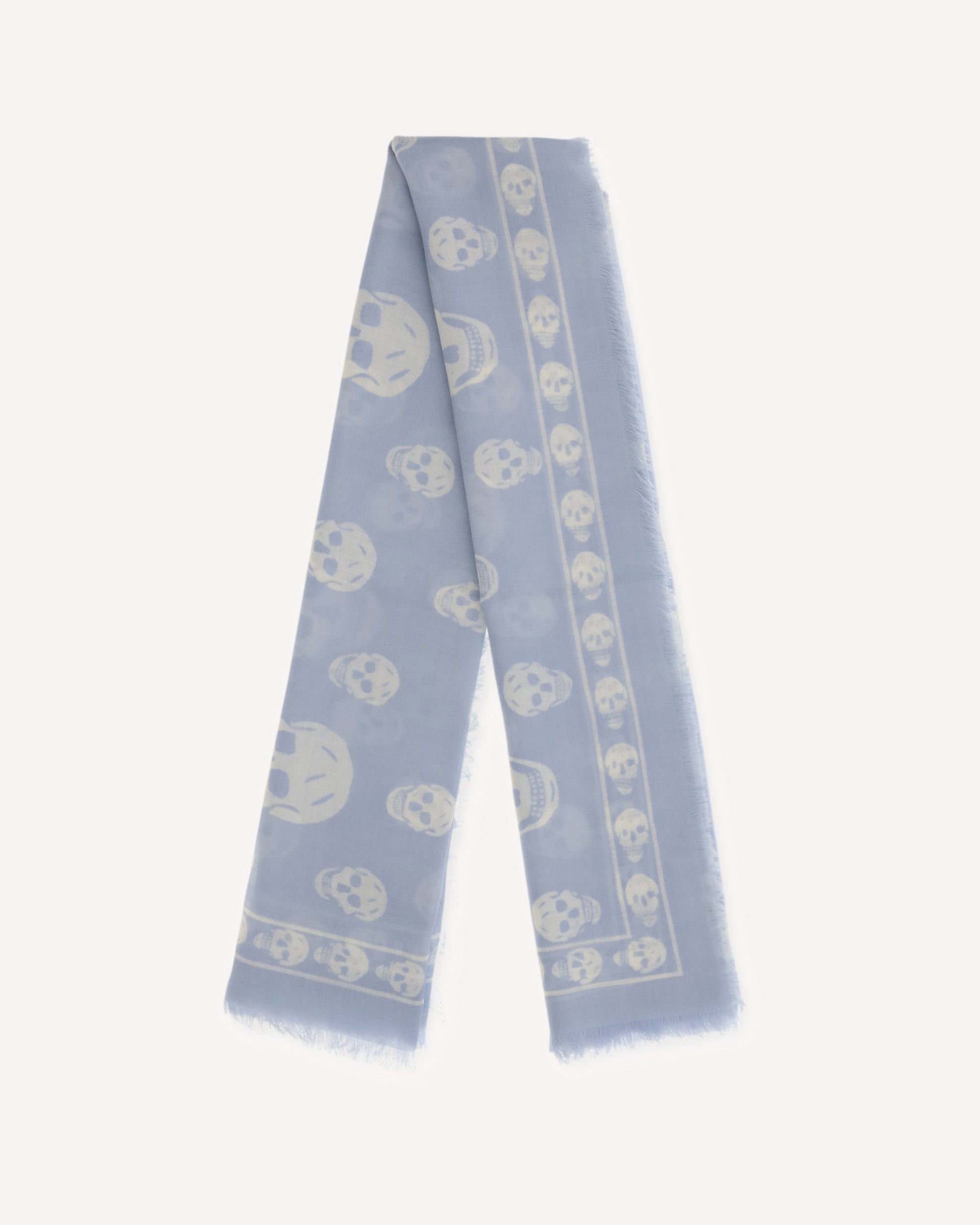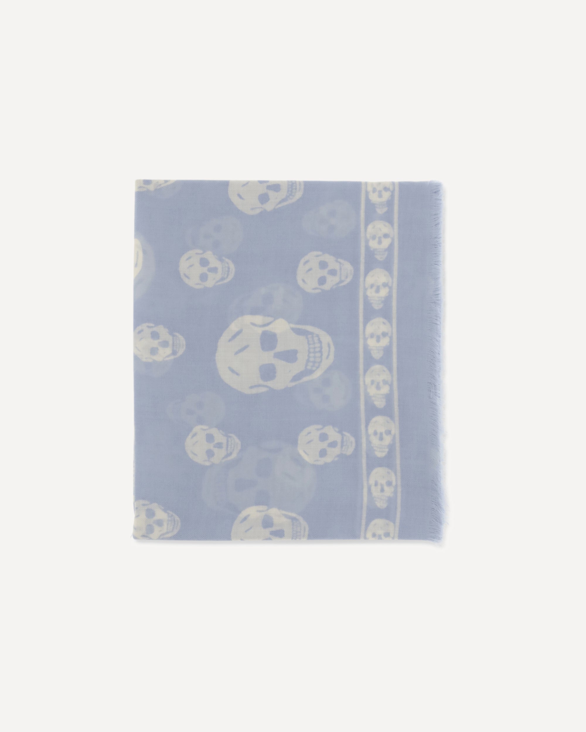 The Skull Foulard by McQueen is crafted from a silk and modal blend in black and dark grey, featuring an all-over Skull motif. The fringed edges are accented with Skull details and the McQueen logo, creating a distinctive, contemporary accessory.