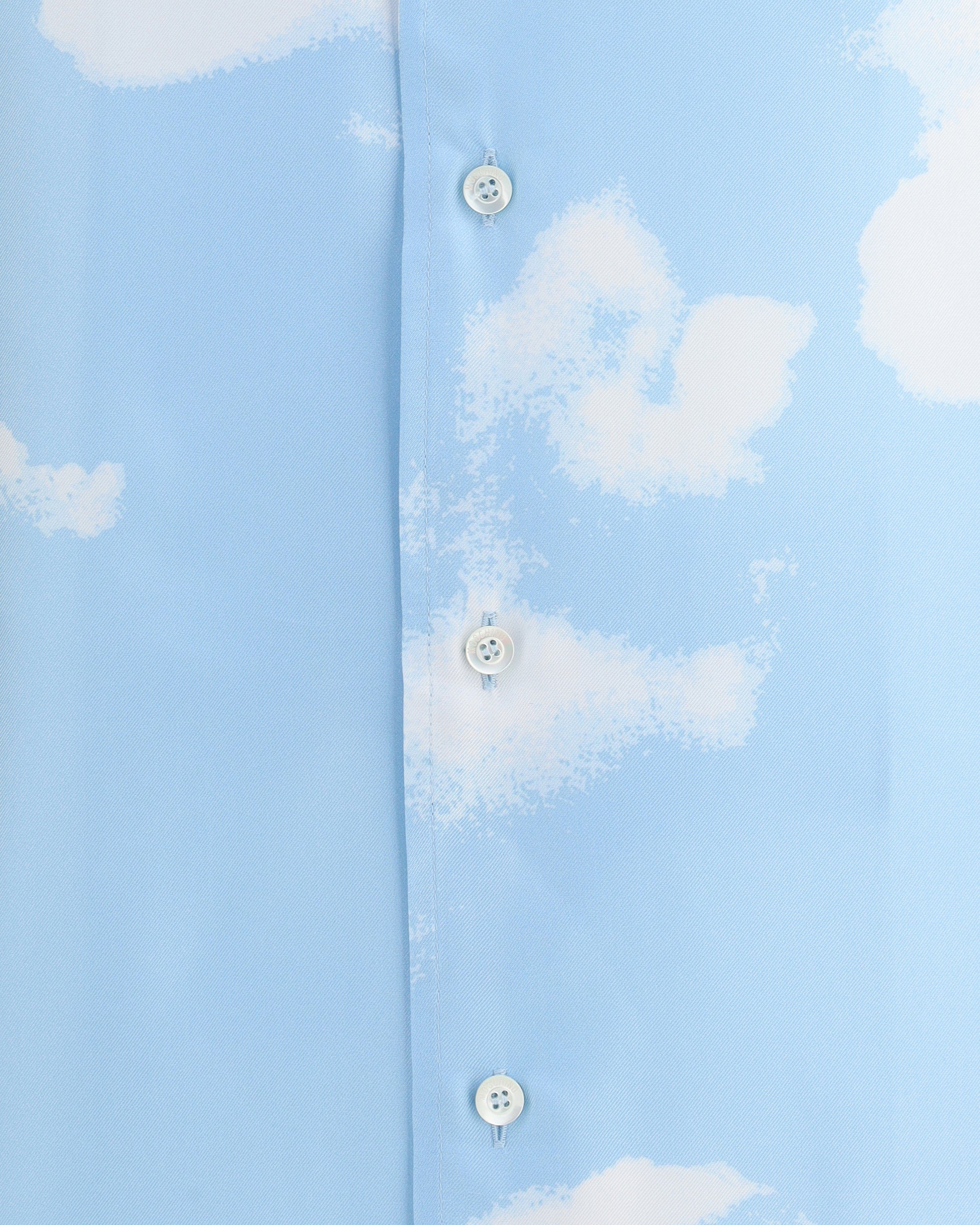 Moschino's silk Shirt with cuban collar is a sophisticated and contemporary piece. Short-sleeved, it features a front button closure, side slits and a sky-inspired pattern with white clouds. An oversized fit completes the design for a sleek and modern look.