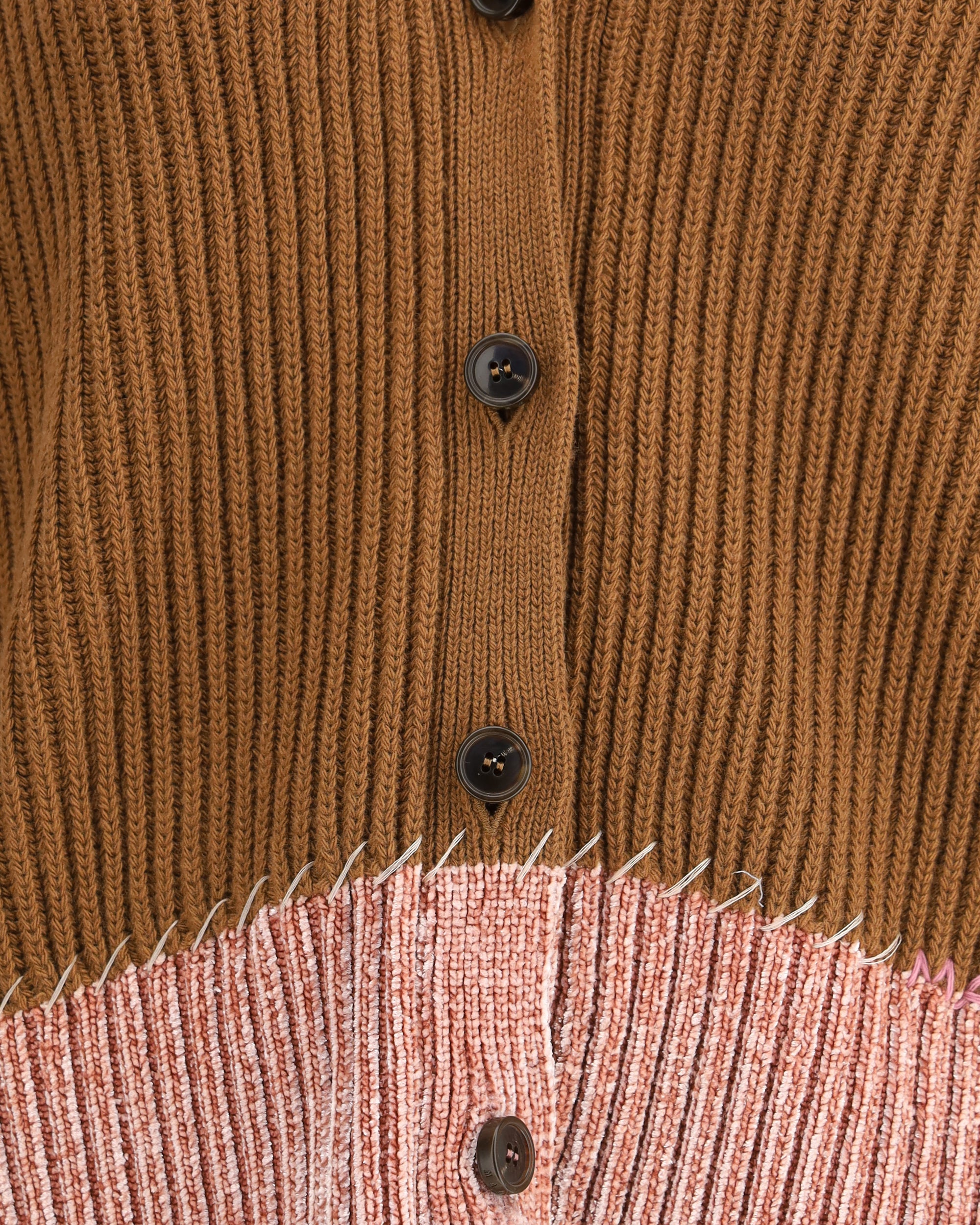 Marni's brown cardigan in fine wool, with chenille underside in shades of pink, connected via faux raw seams in shades of beige, carefully handcrafted in Italy. Elegant and versatile design, perfect for pairing with both casual and formal looks.