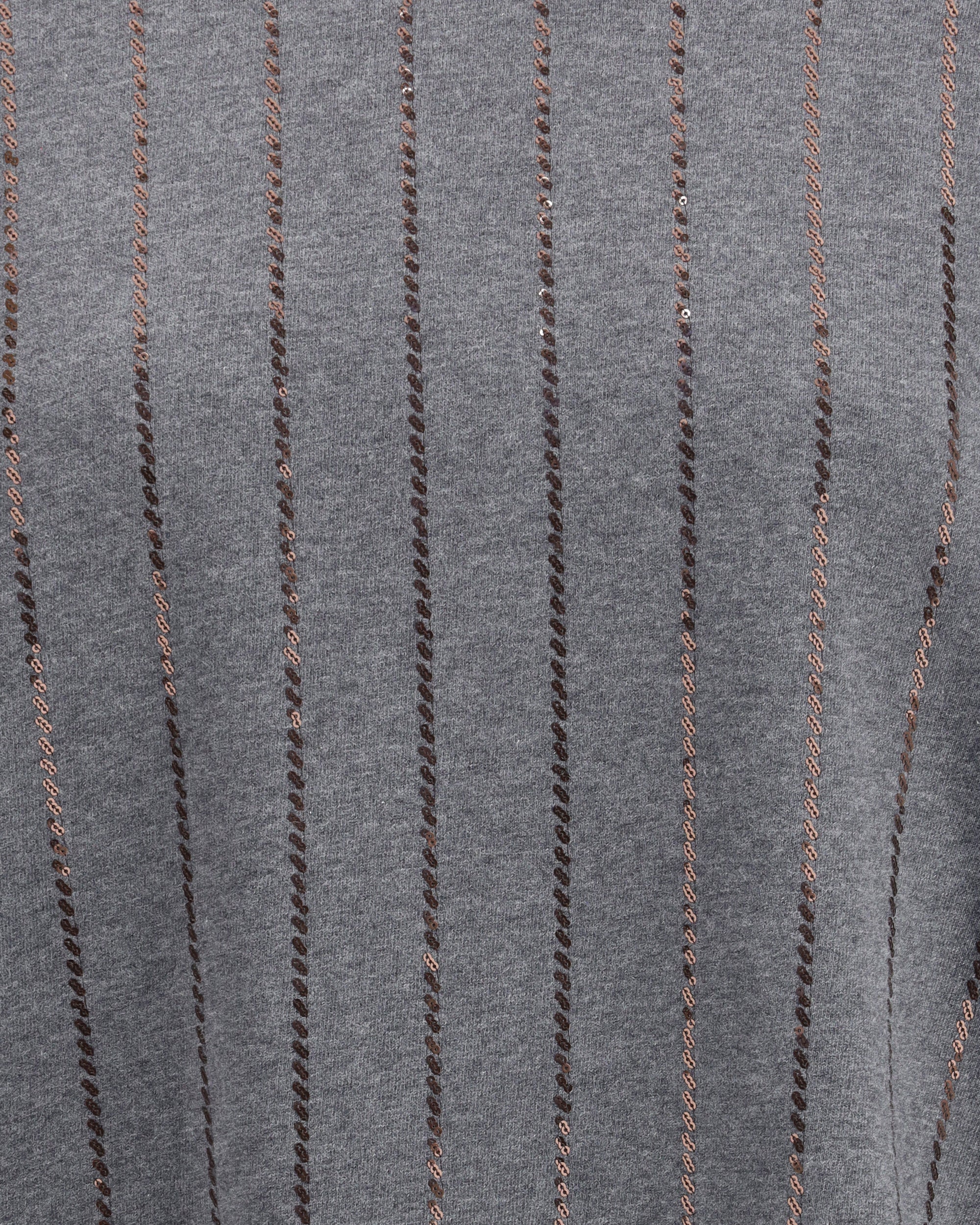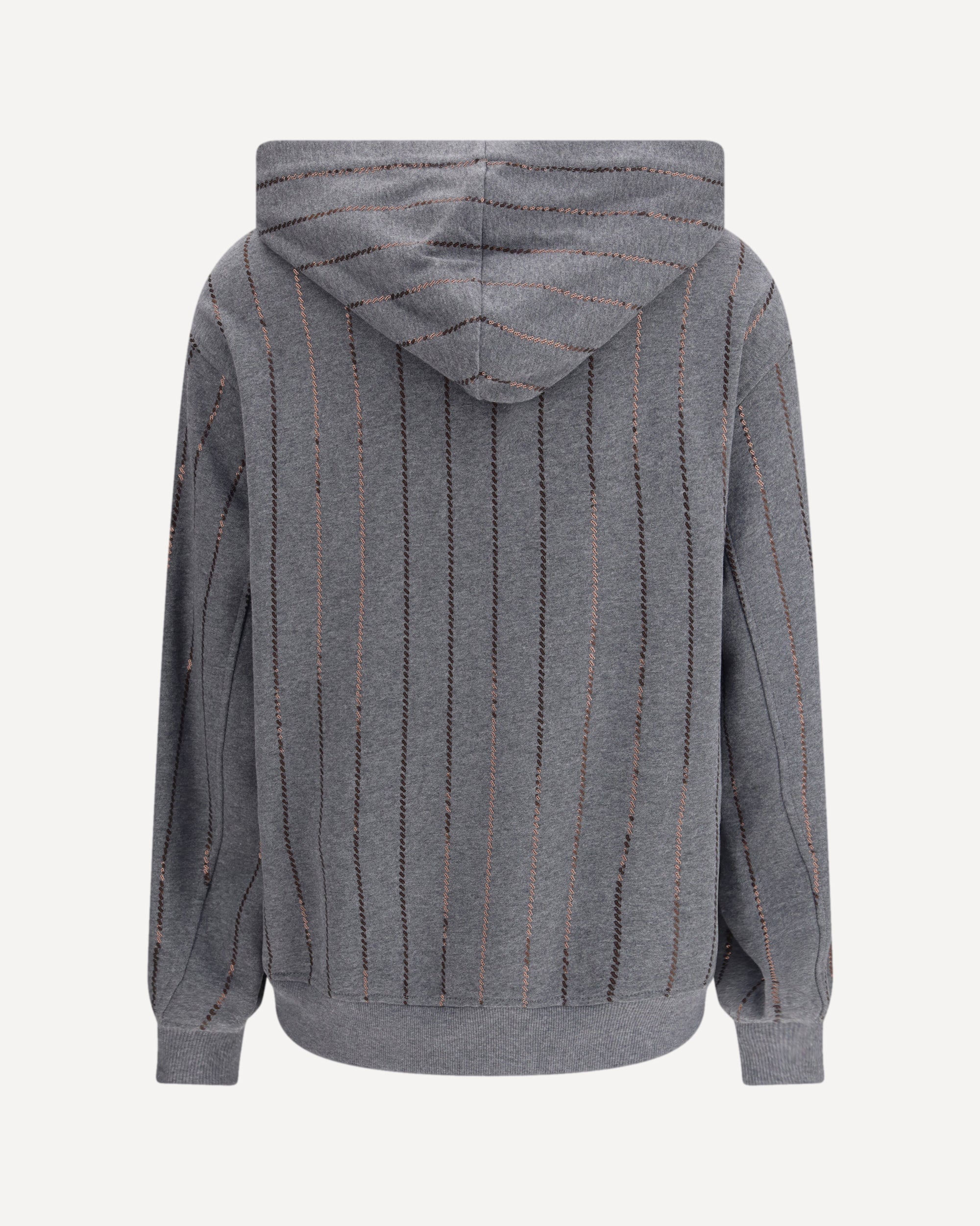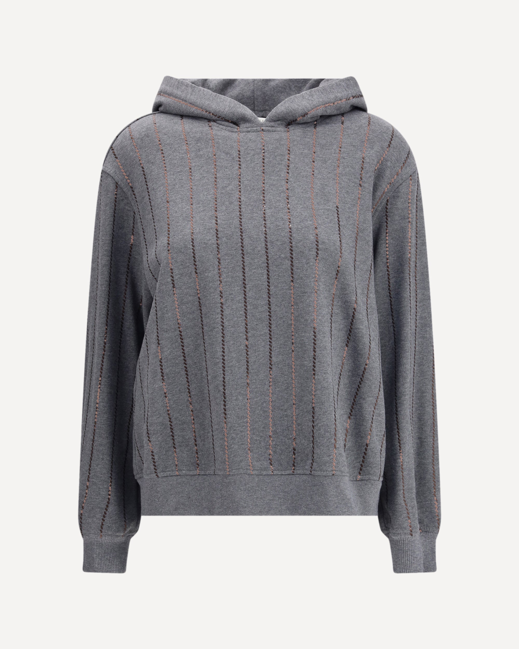 The cotton Sweatshirt by Brunello Cucinelli blends comfort and refinement in a piece with a modern, relaxed spirit. The hood and ribbed trims define a balanced sporty silhouette, while the dazzling chalk stripe sequin embroidery adds a subtle sparkle and signature sophistication. The long sleeves with cuffs complete the design, making this sweatshirt a perfect choice for effortlessly elegant casual looks and moments of refined leisure.