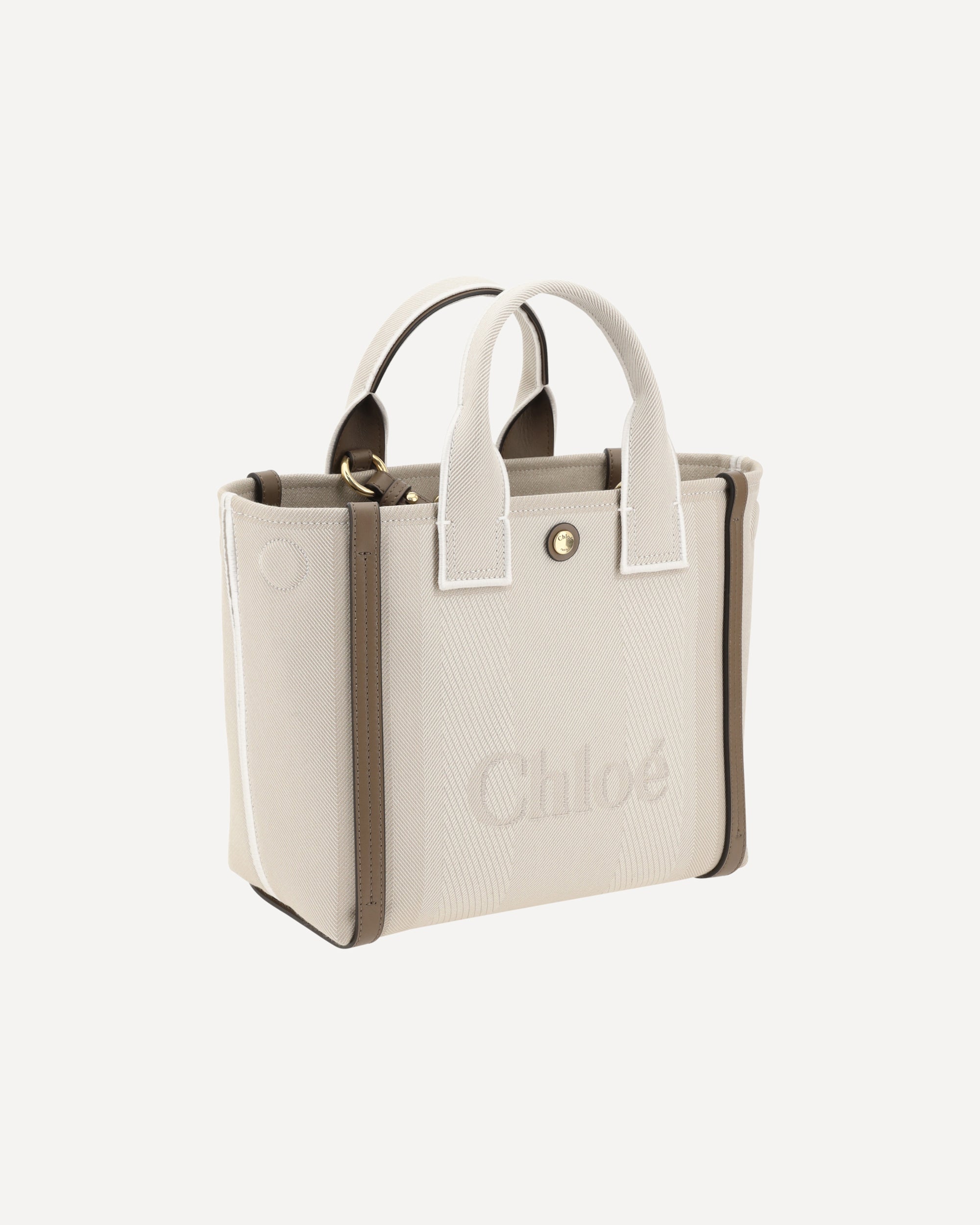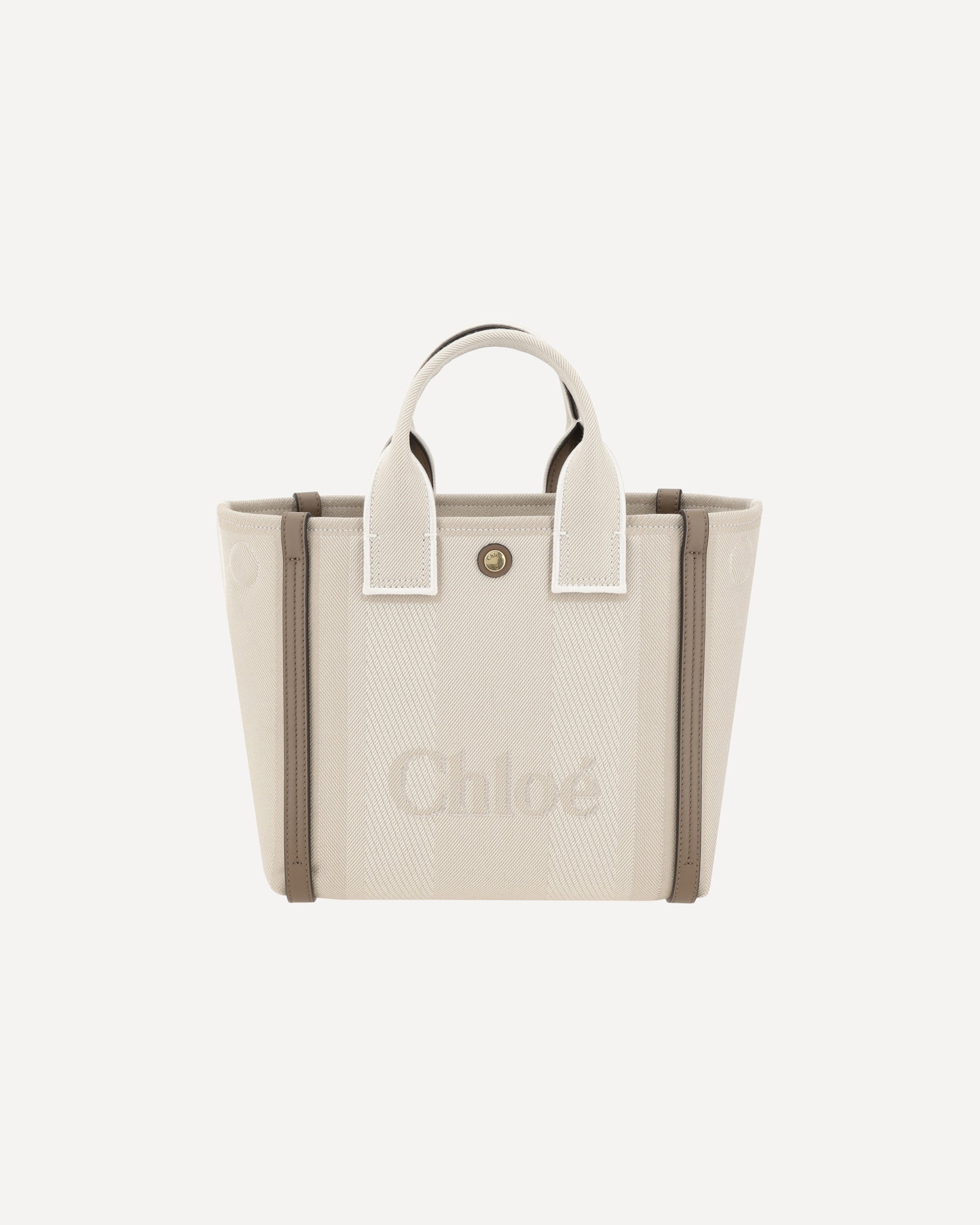 Chloé's Carry Tote Bag is a stylish, multifunctional accessory made of cotton with contrasting leather details that accentuate its sophisticated appeal. Magnetic buttons on the side panels allow you to adjust the width of the bag for added convenience. The snap top closure provides security, while double flat handles and a removable and adjustable leather shoulder strap offer multiple carrying options, perfect for any occasion. The brand's iconic monogram is visible on both the front and back, adding a distinctive touch. Inside, a welt pocket allows you to organize smaller items, while the brand's signature on the side panels enhances the design with an exclusive and refined detail.