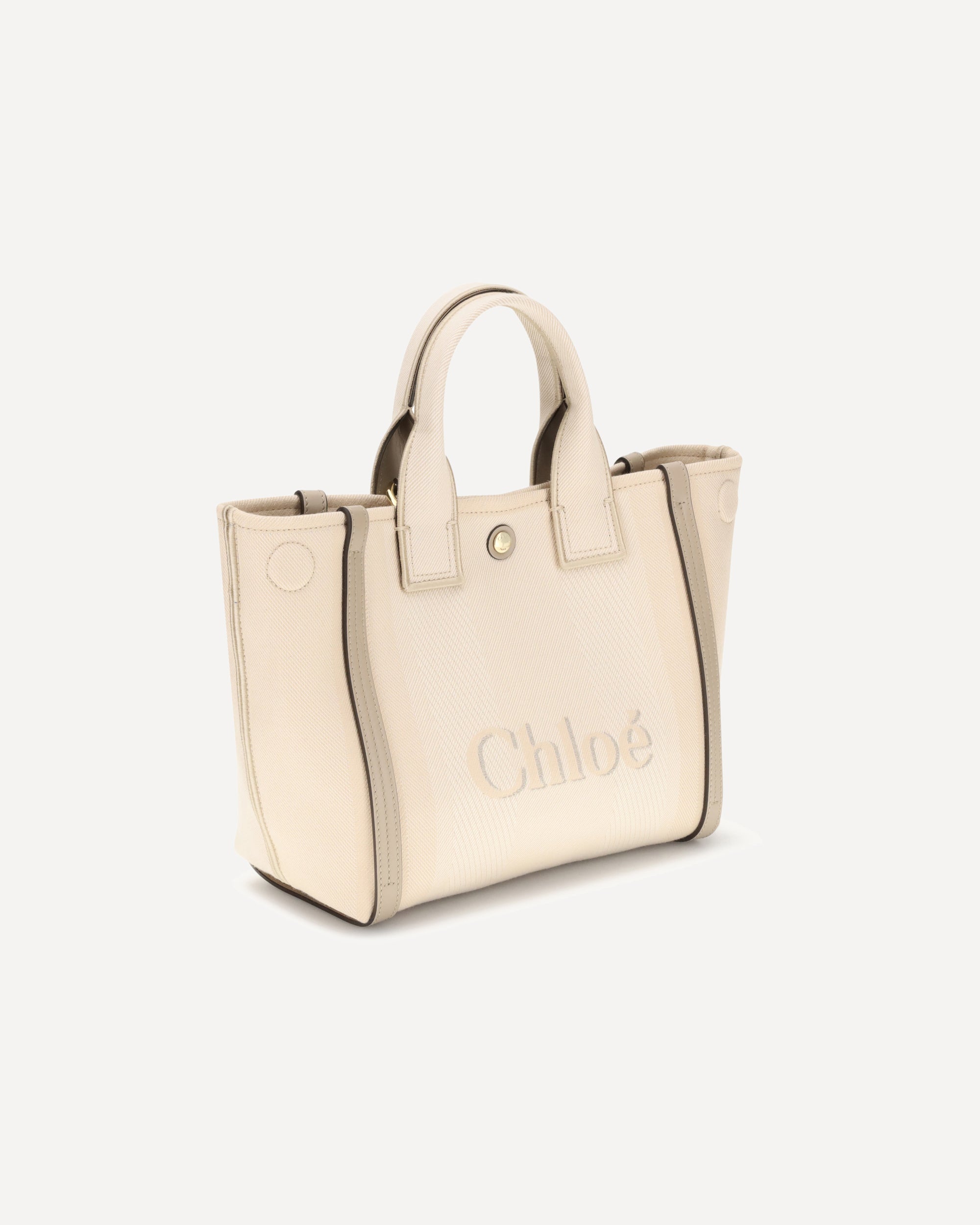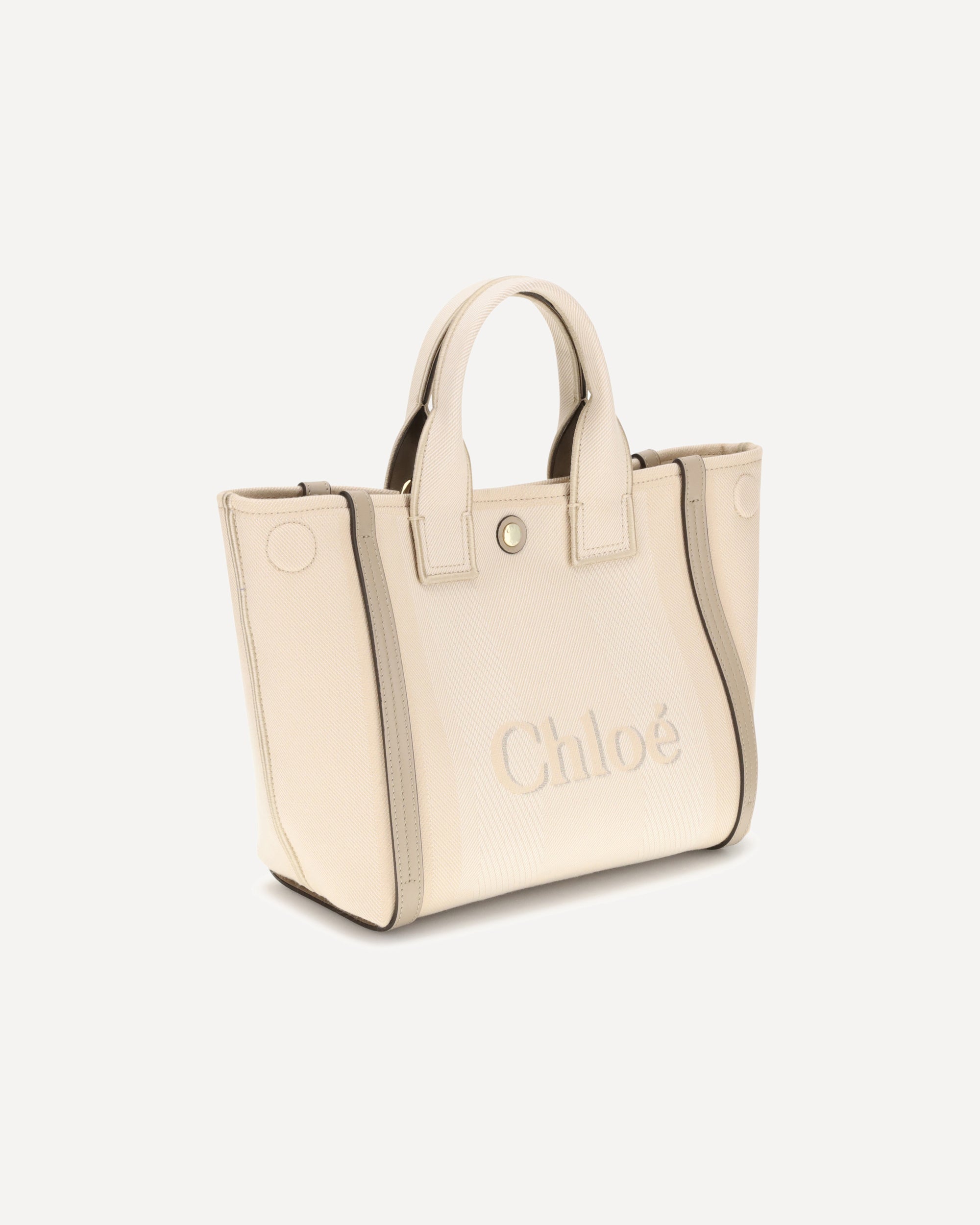 Chloé's Carry Tote Bag is a stylish, multifunctional accessory made of cotton with contrasting leather details that accentuate its sophisticated appeal. Magnetic buttons on the side panels allow you to adjust the width of the bag for added convenience. The snap top closure provides security, while double flat handles and a removable and adjustable leather shoulder strap offer multiple carrying options, perfect for any occasion. The brand's iconic monogram is visible on both the front and back, adding a distinctive touch. Inside, a welt pocket allows you to organize smaller items, while the brand's signature on the side panels enhances the design with an exclusive and refined detail.