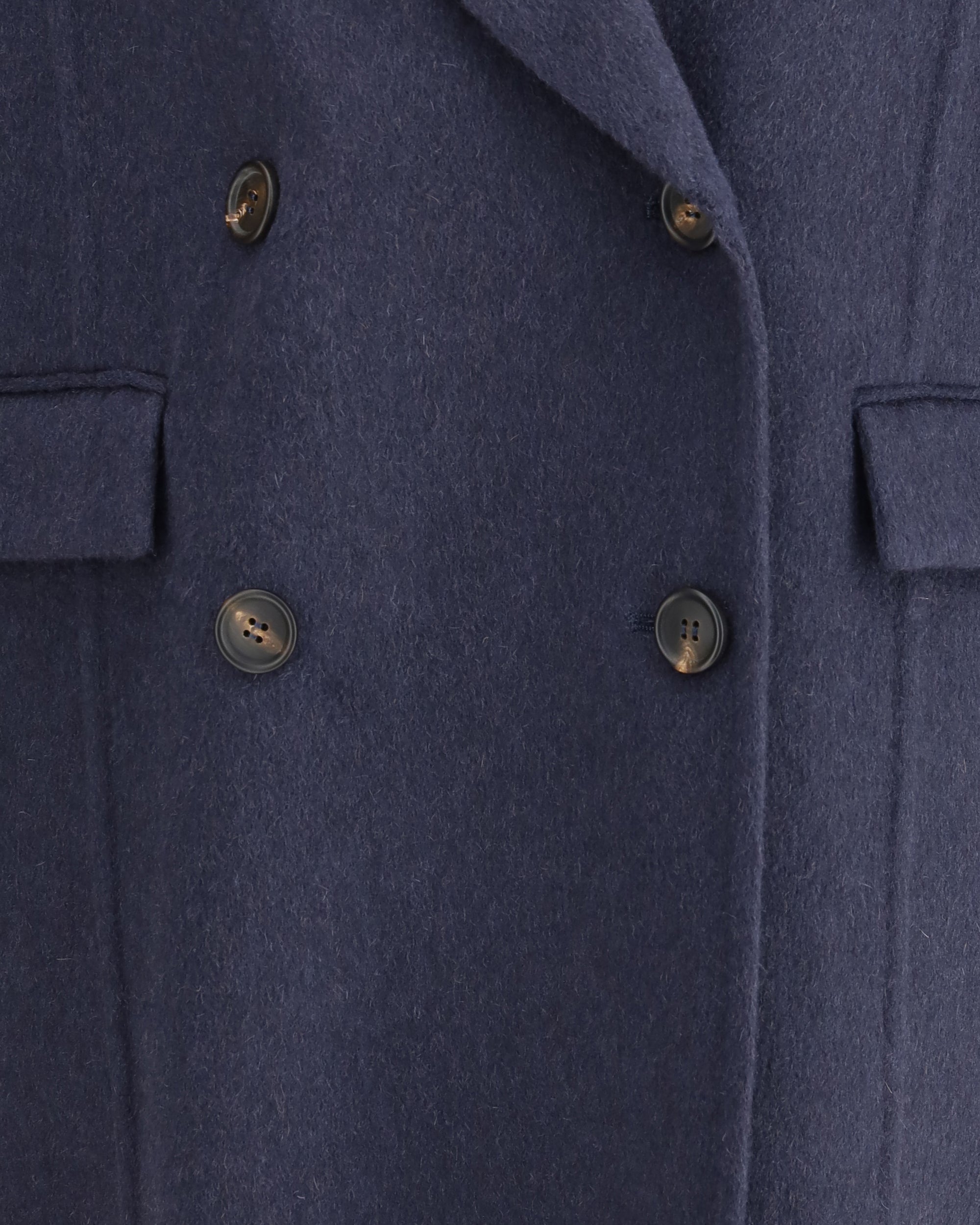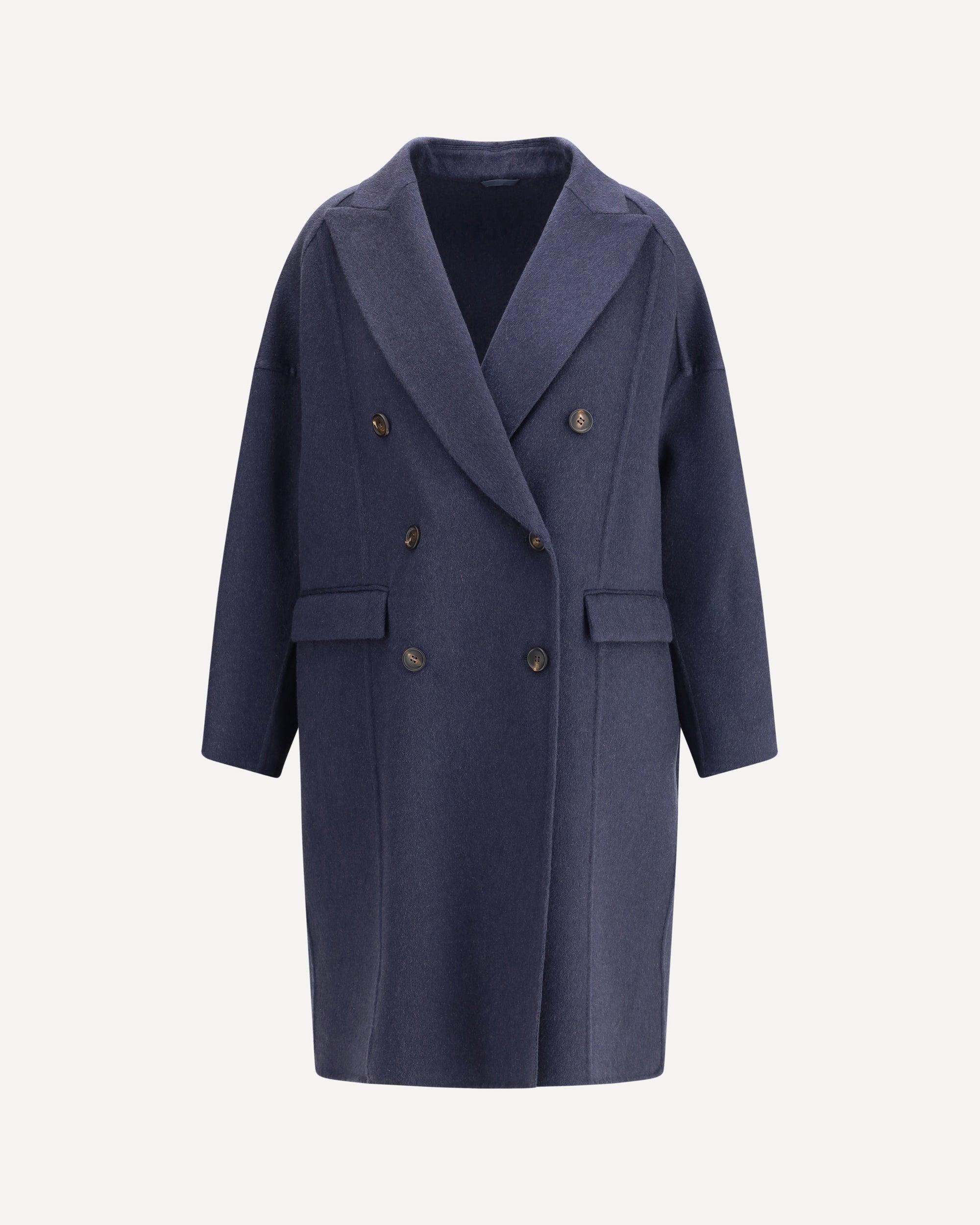 Brunello Cucinelli's cashmere Coat expresses elegance and quality craftsmanship in every detail. Featuring a wide peaked lapel and a double-breasted closure with contrasting buttons, it has two welt flap pockets applied on the front. The monochrome design, over-fit and mid-length make it a sophisticated and versatile garment, perfect for completing refined looks in the cold season.