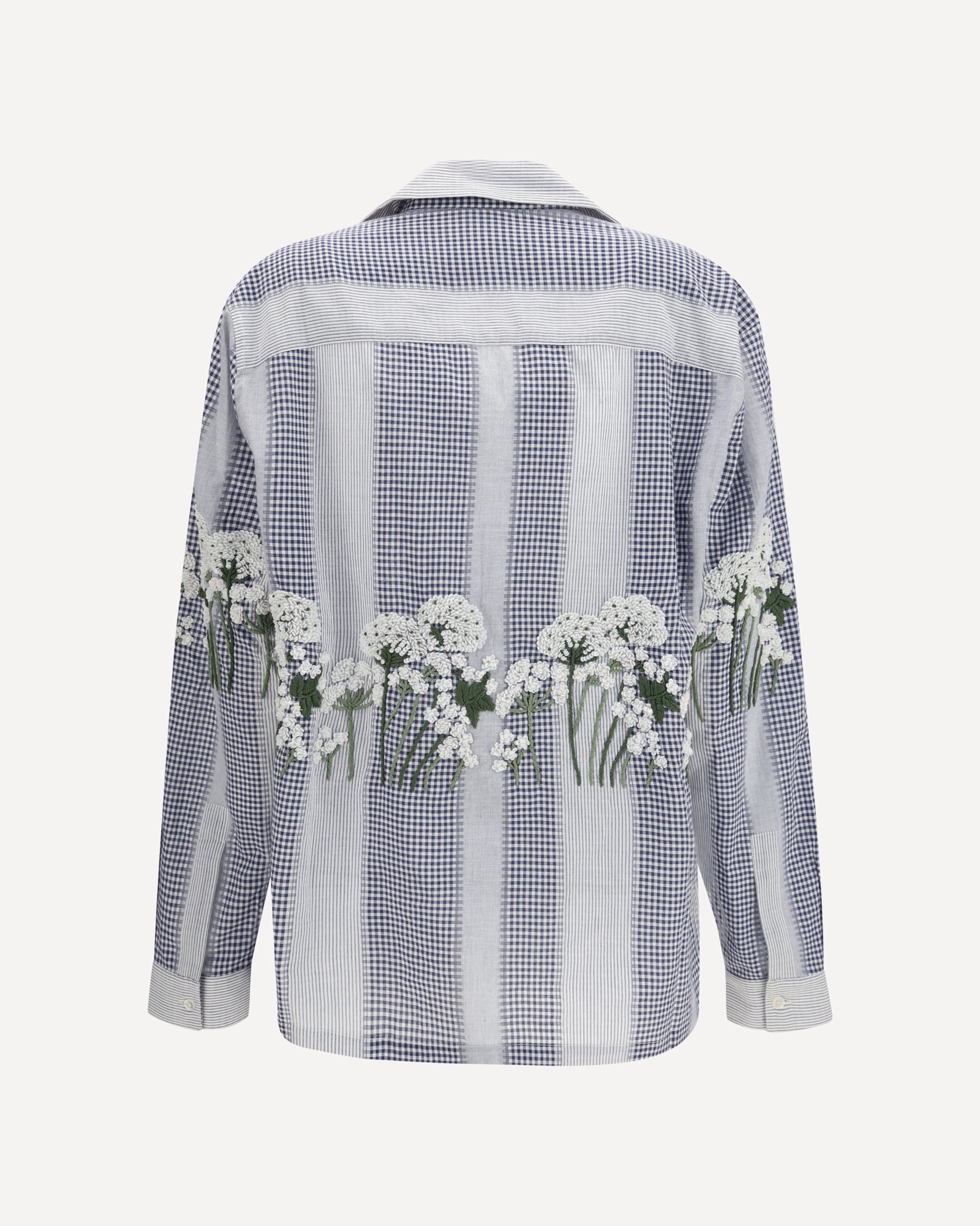 The Corsa Shirt by Baziszt stands out for its creative and contemporary design, featuring a soft and comfortable silhouette. Crafted with long sleeves and a bowling collar, it includes a button fastening and patch pockets on the front. The piece is enhanced with floral embroidery emerging from the pockets and extending onto the sleeves, creating a distinctive decorative effect. The striped and checked pattern adds an additional graphic element, while the finished cuffs complete the design with attention to detail.