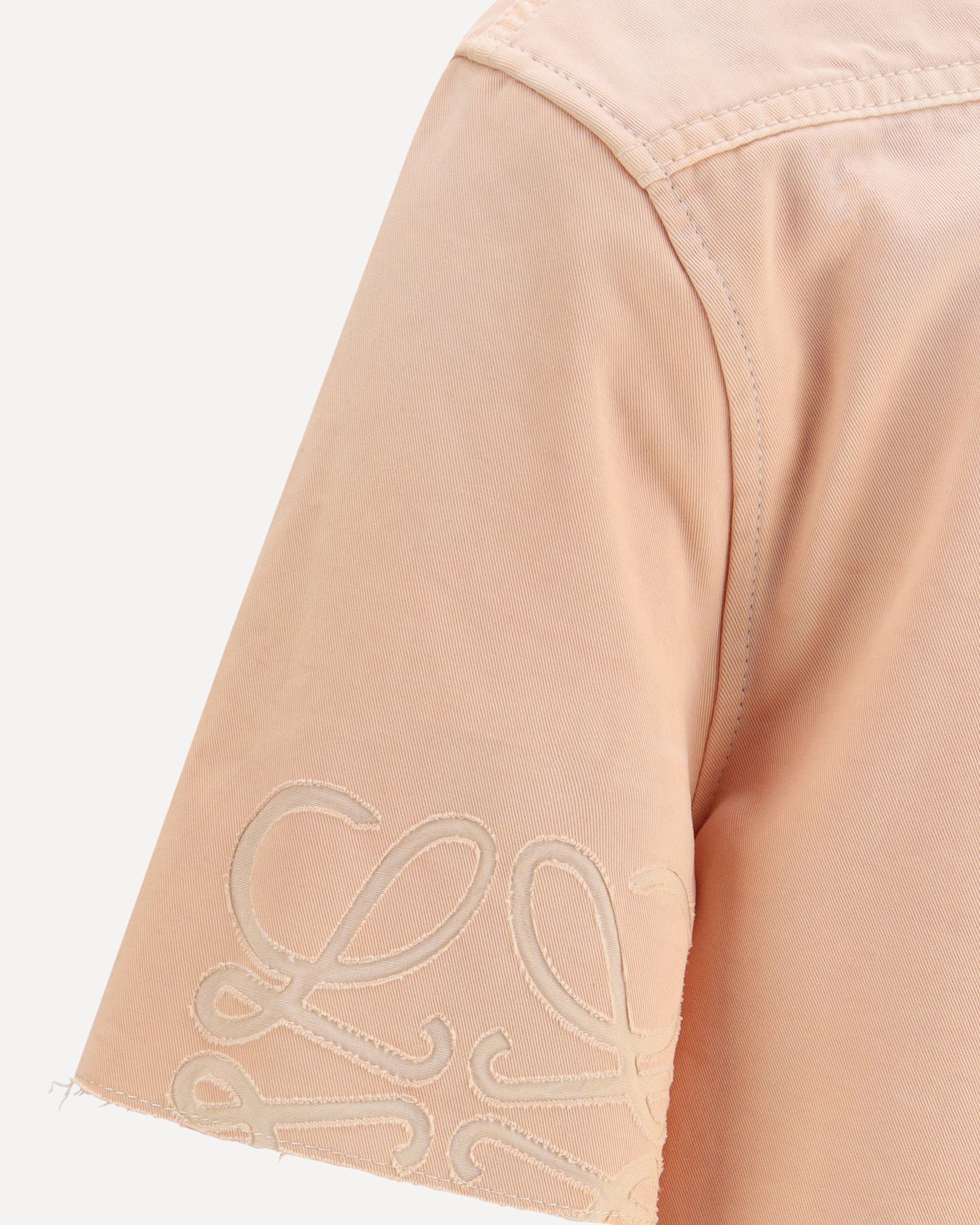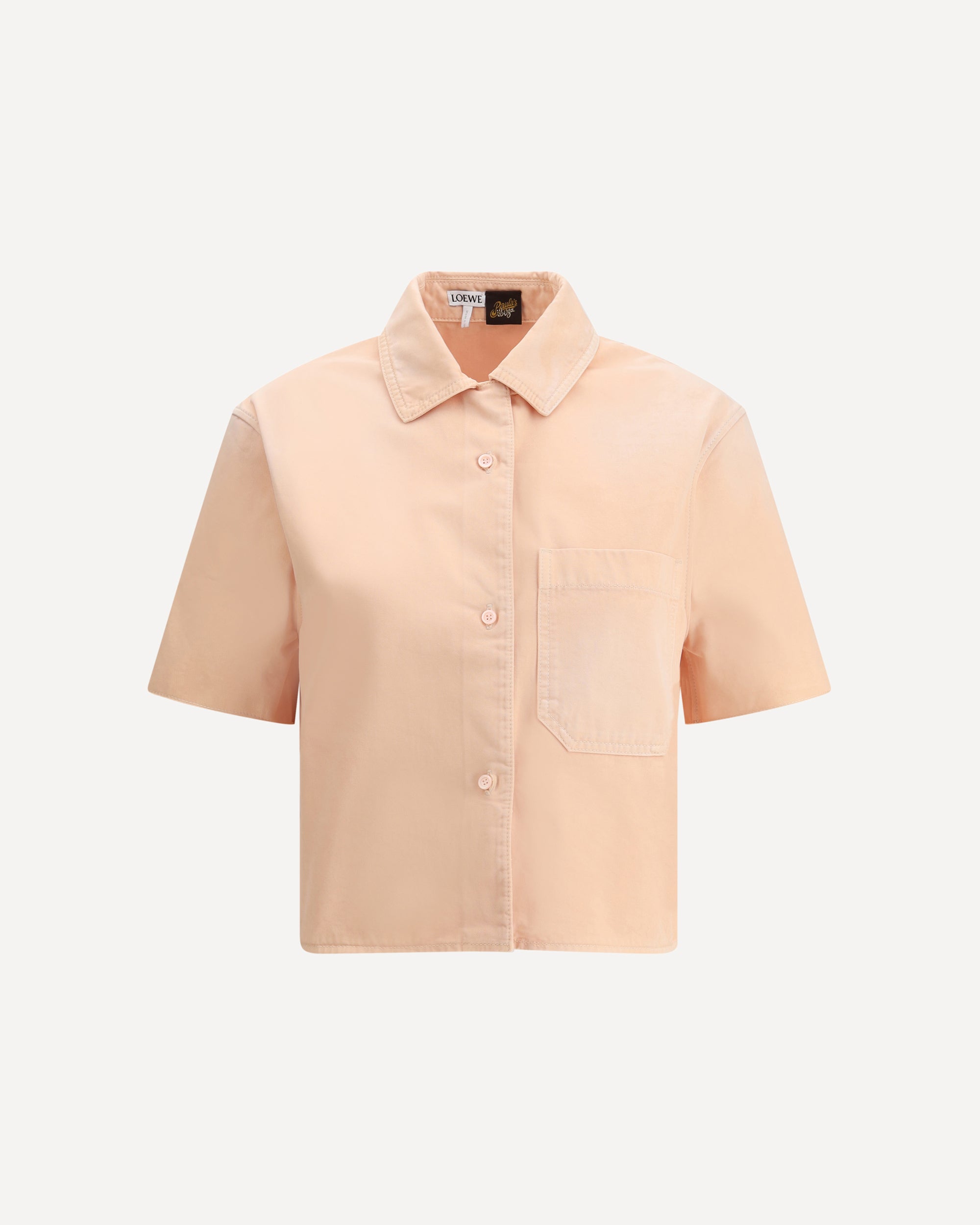 Loewe's Cropped Shirt from Paula's Ibiza collection is a fresh and bold piece of clothing. Featuring raw-cut short sleeves with the brand's logo, it has a classic collar and a front button closure. A patch pocket on the front adds a practical and distinctive touch, making this shirt perfect for a casual yet sophisticated look.