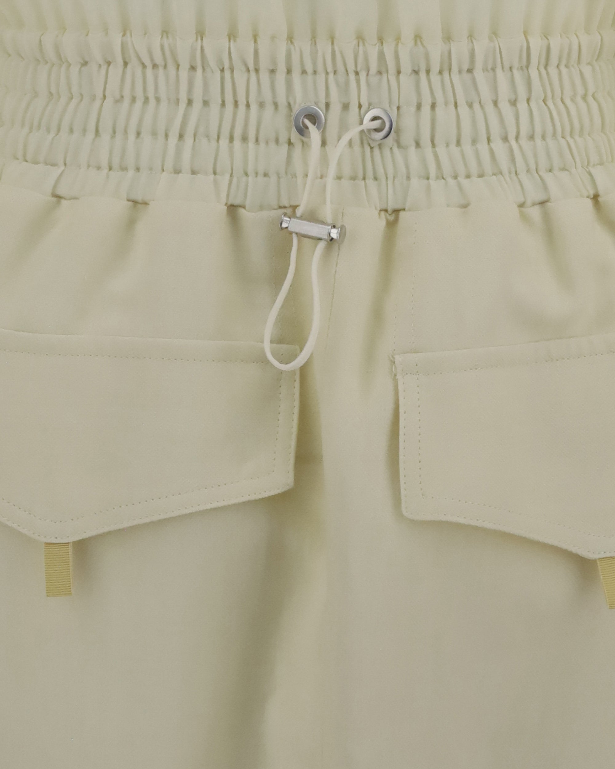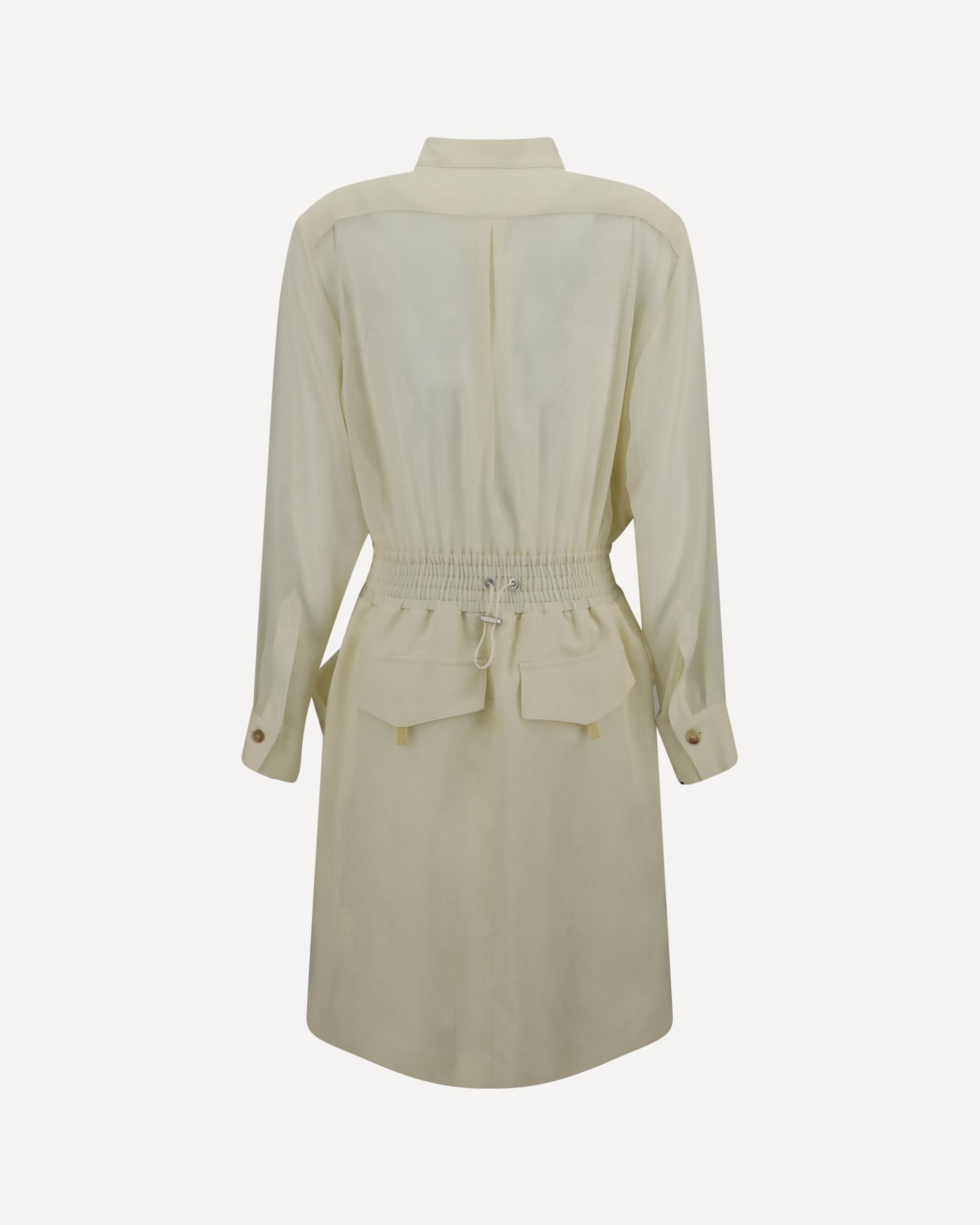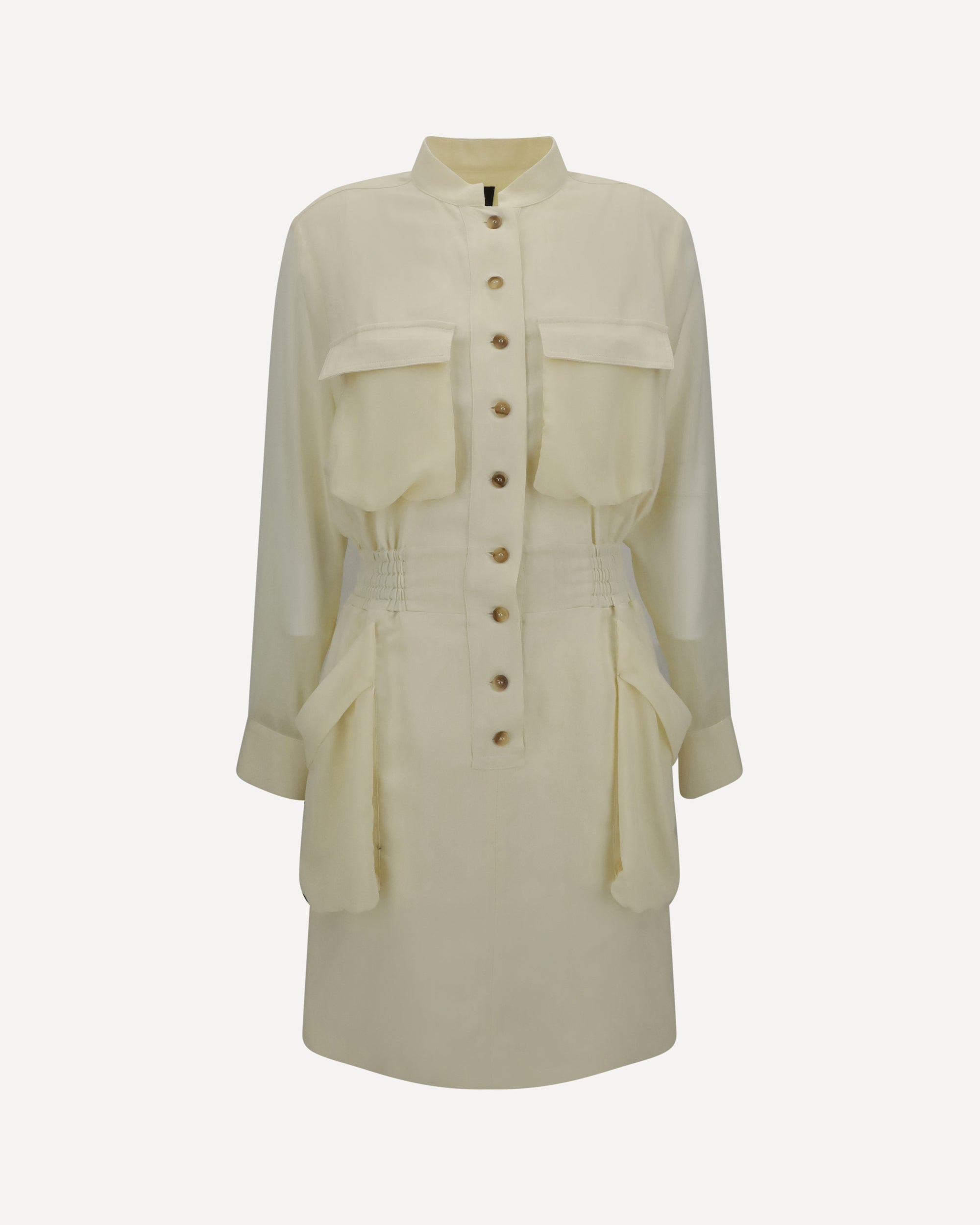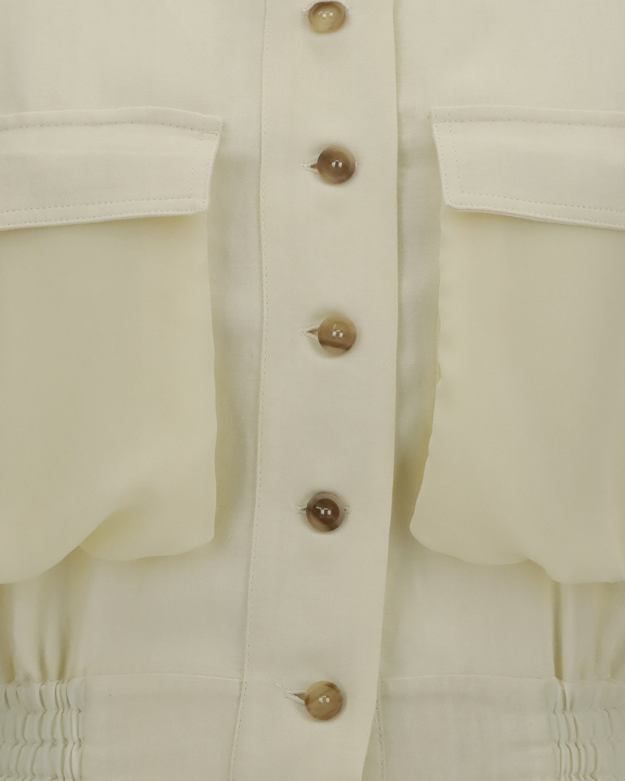 Pinko's linen chemisier Dress is a garment with a casual and sophisticated spirit, designed for casual yet detail-oriented elegance. The design features a partial front button closure and a standing collar that lends structure to the garment. Long sleeves in semi-transparent georgette add lightness and femininity, complemented by button cuffs for a classic touch. Functional and versatile, the dress is enriched with numerous pockets: flap appliqués on the chest, on the hips and on the back with welt pockets. The waist is defined by an elastic band with adjustable drawstring at the back, allowing you to naturally modulate the fit.