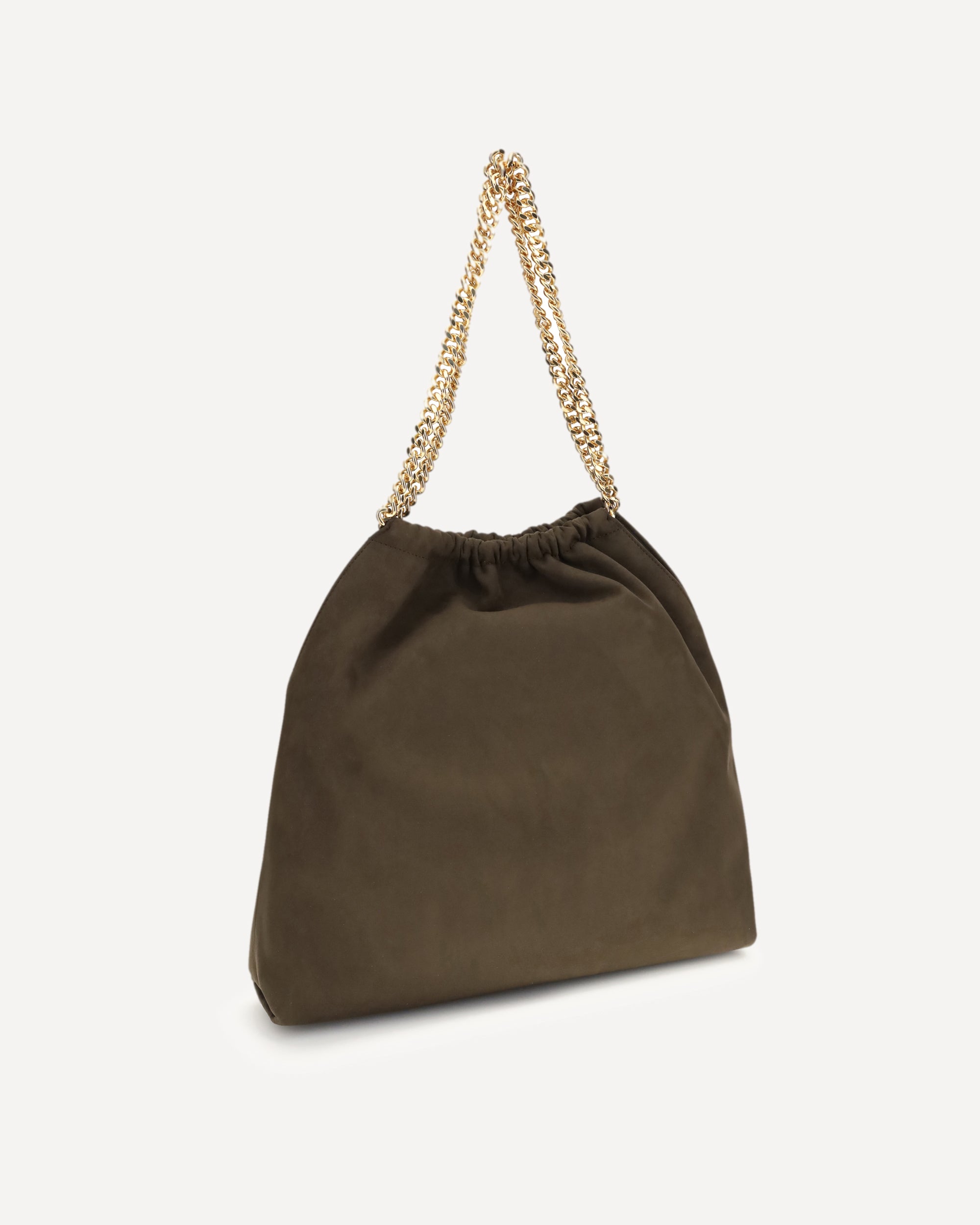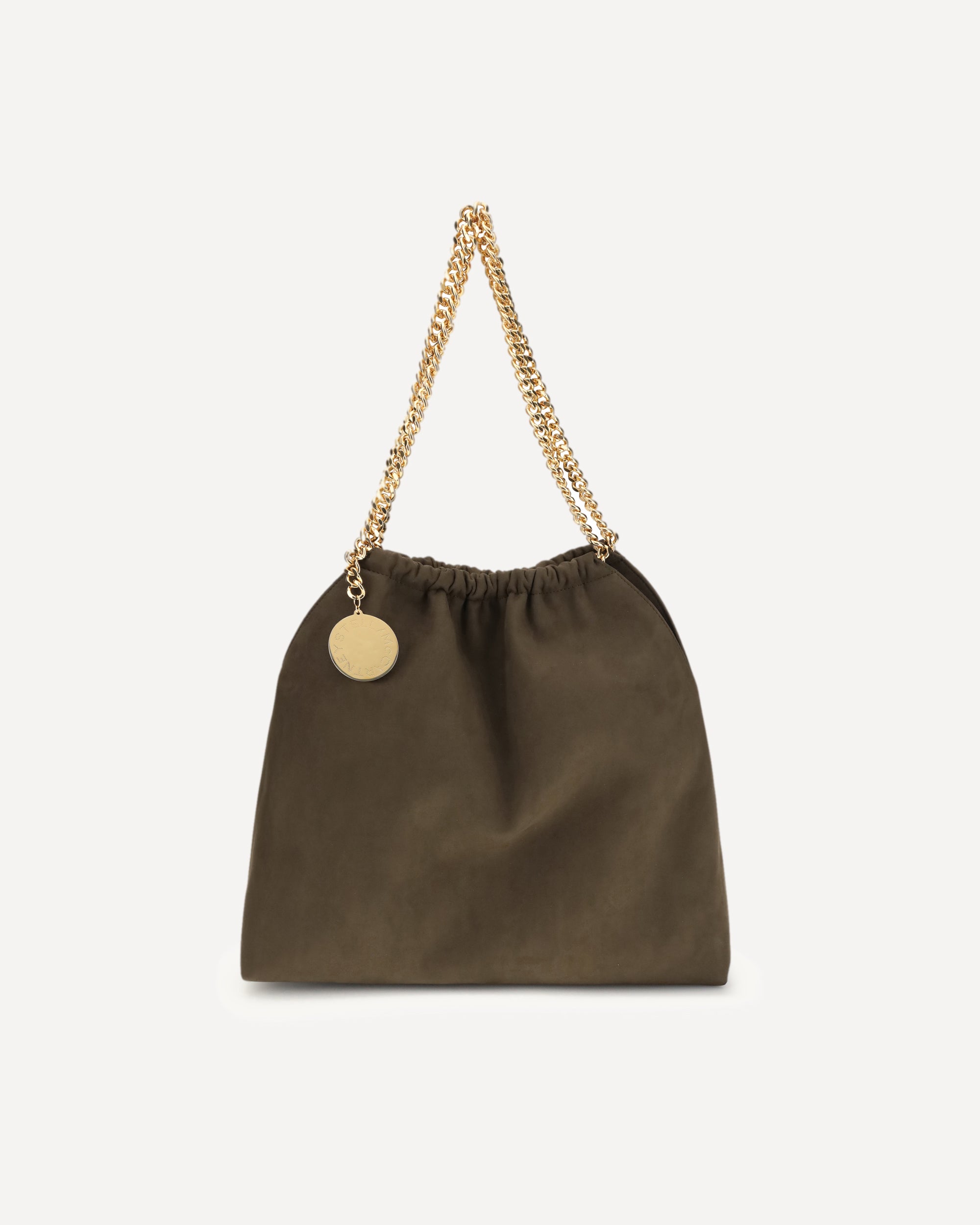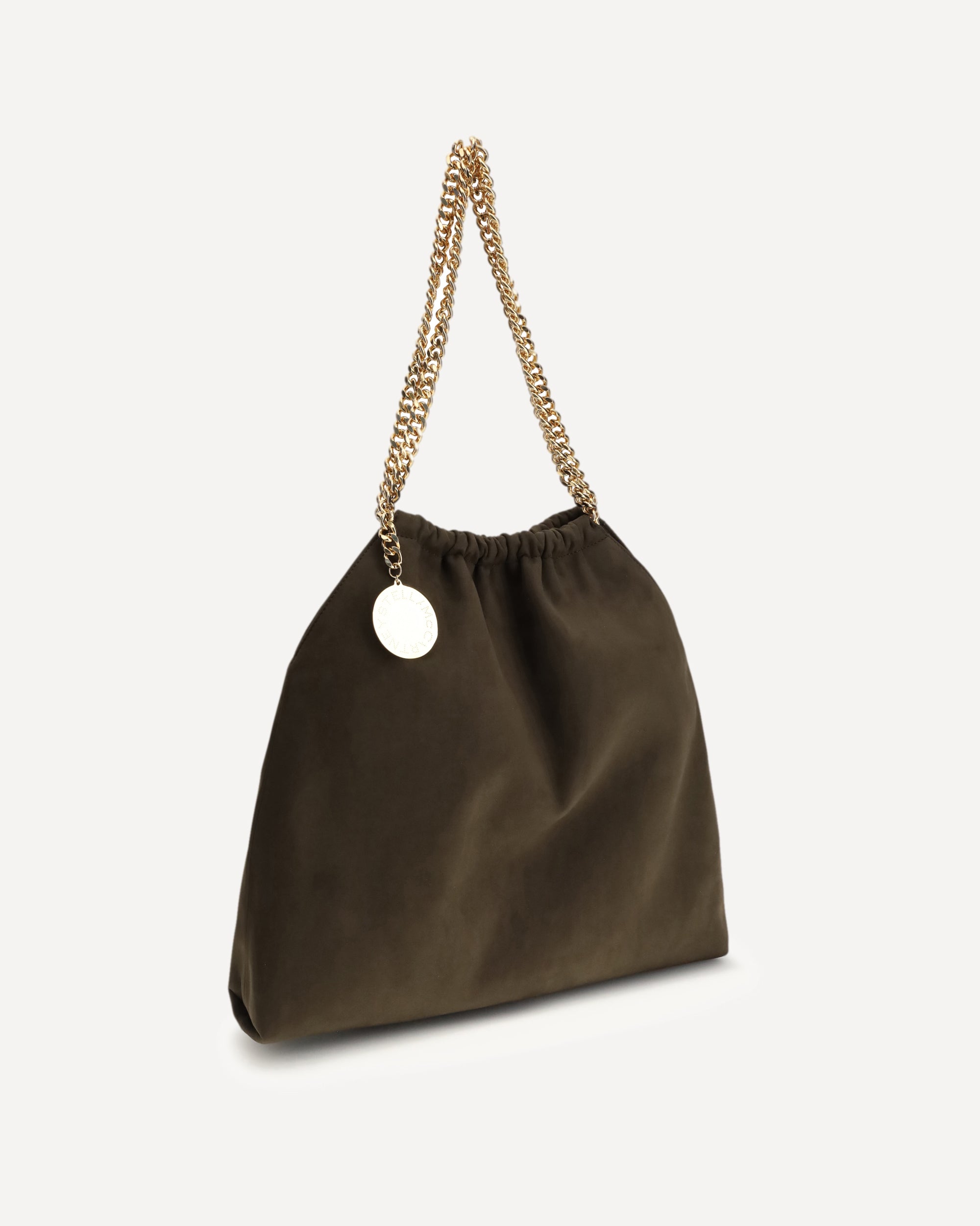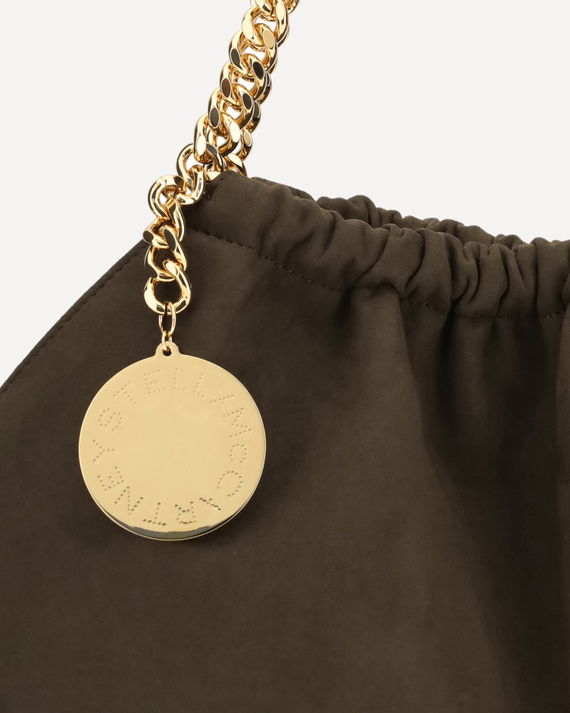 The Falabella mini Tote Bag by Stella McCartney is a cruelty-free style icon, renowned for its distinctive chain detailing. Featuring silver-tone chain handles and a shoulder strap, it defines an elegant and luminous silhouette. The magnetic flap closure ensures practicality and security, while the interior, lined with the brand's logo, offers an open pocket ideal for storing essentials. The design is completed by a round silver pendant with an engraved logo, a symbol of Stella McCartney's refined and conscious aesthetic.