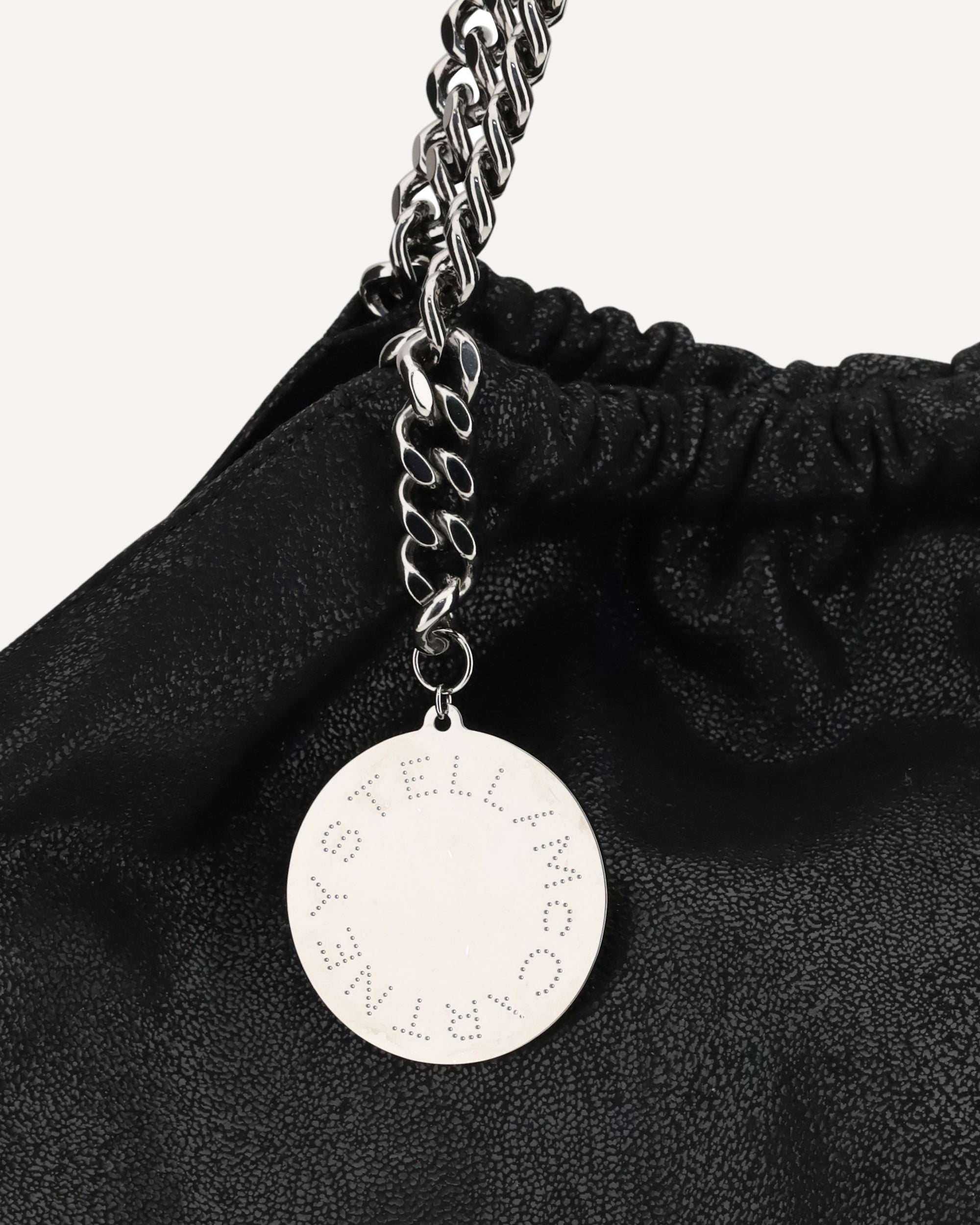 The Falabella medium Drawstring Shoulder Bag by Stella McCartney combines iconic design and sustainability in a distinctive accessory. Made of matte vegan Shaggy Deer fabric with semi-gloss grain, it is complemented by the emblematic diamond-effect chain in gold-colored recycled brass and aluminum. It features two top handles, a main compartment and an interior zippered pocket, while the top drawstring closure and engraved logo medallion charm add a touch of refined and recognizable style.