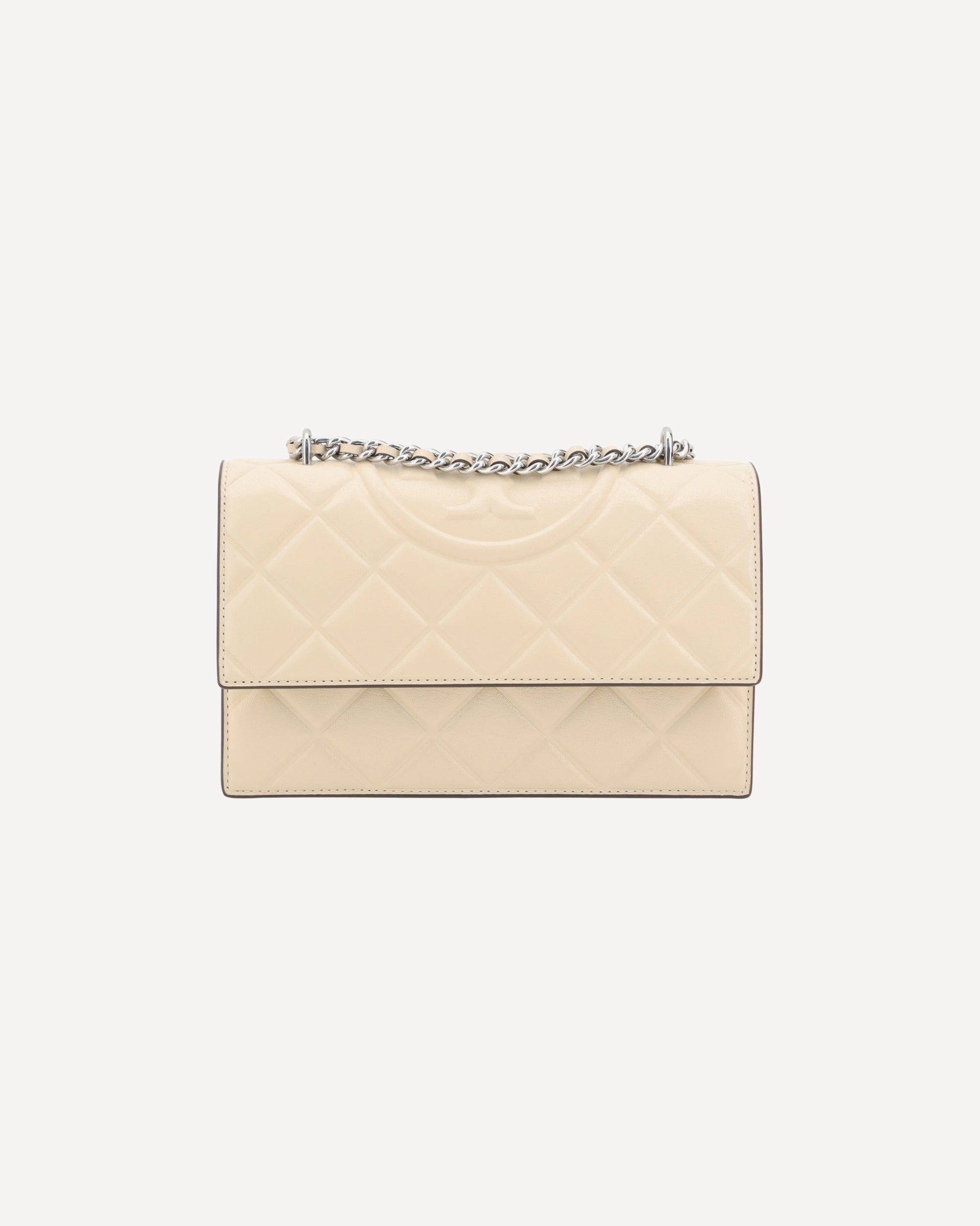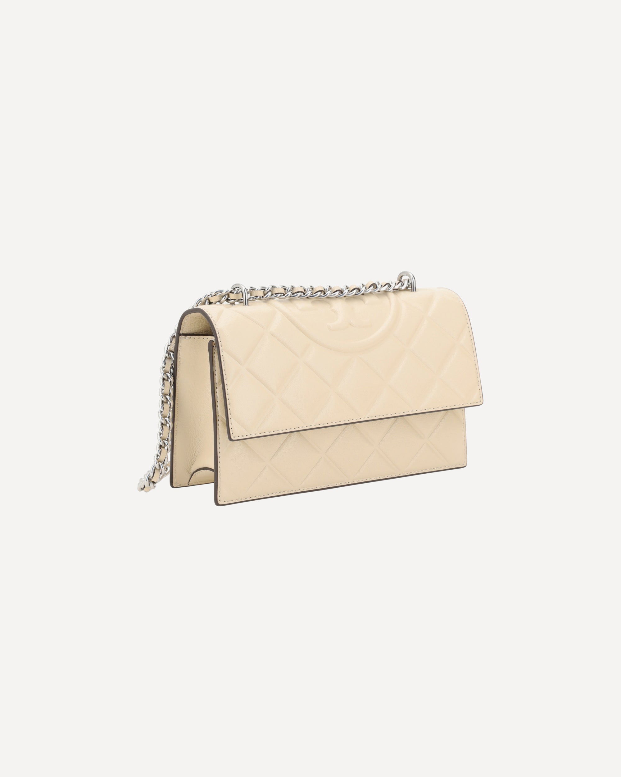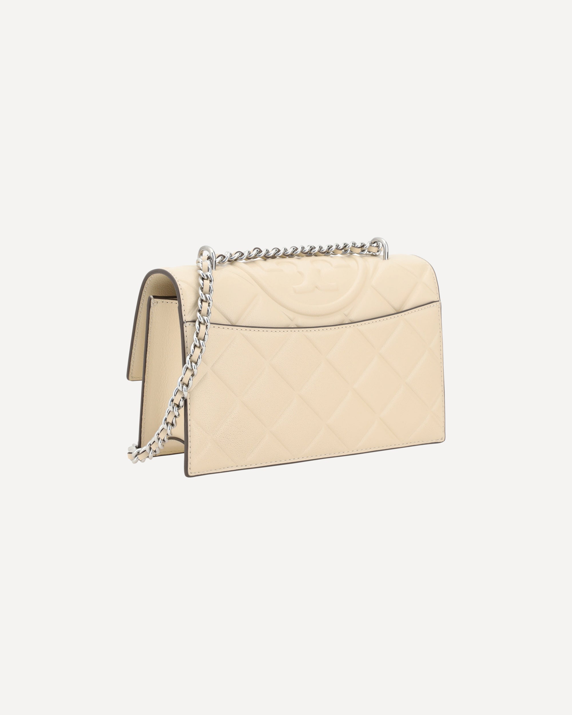 Tory Burch's Fleming mini leather Shoulder Bag is a stylish and versatile accessory. It features a flap with a magnetic closure on the front, providing practicality and security. The chain strap, embellished with a leather detail, adds a touch of sophistication to the design. On the back of the bag, there is a welt pocket, useful for storing small and easily accessible items. Inside, the bag has a single compartment with a welt pocket and a zippered pocket to better organize personal items.