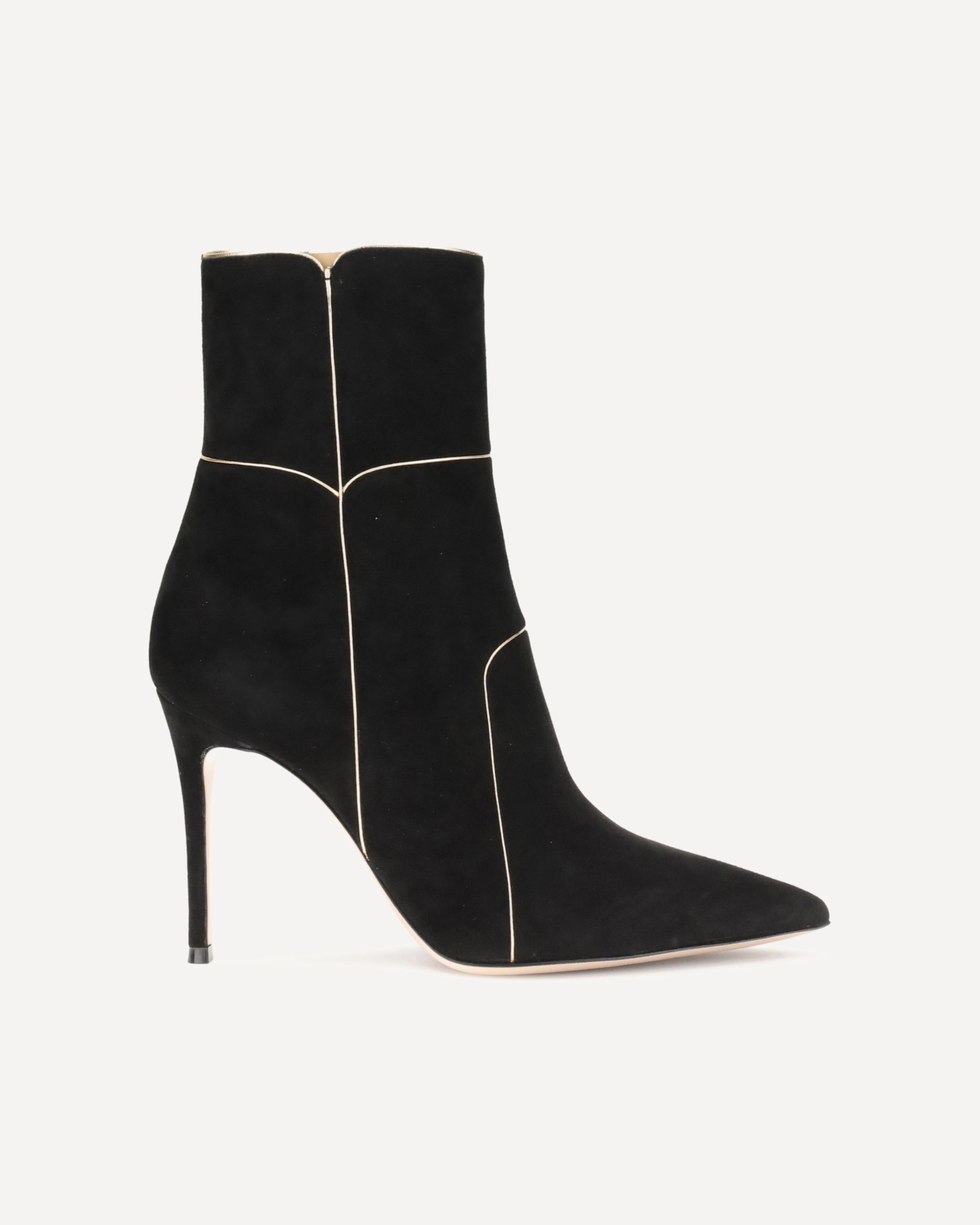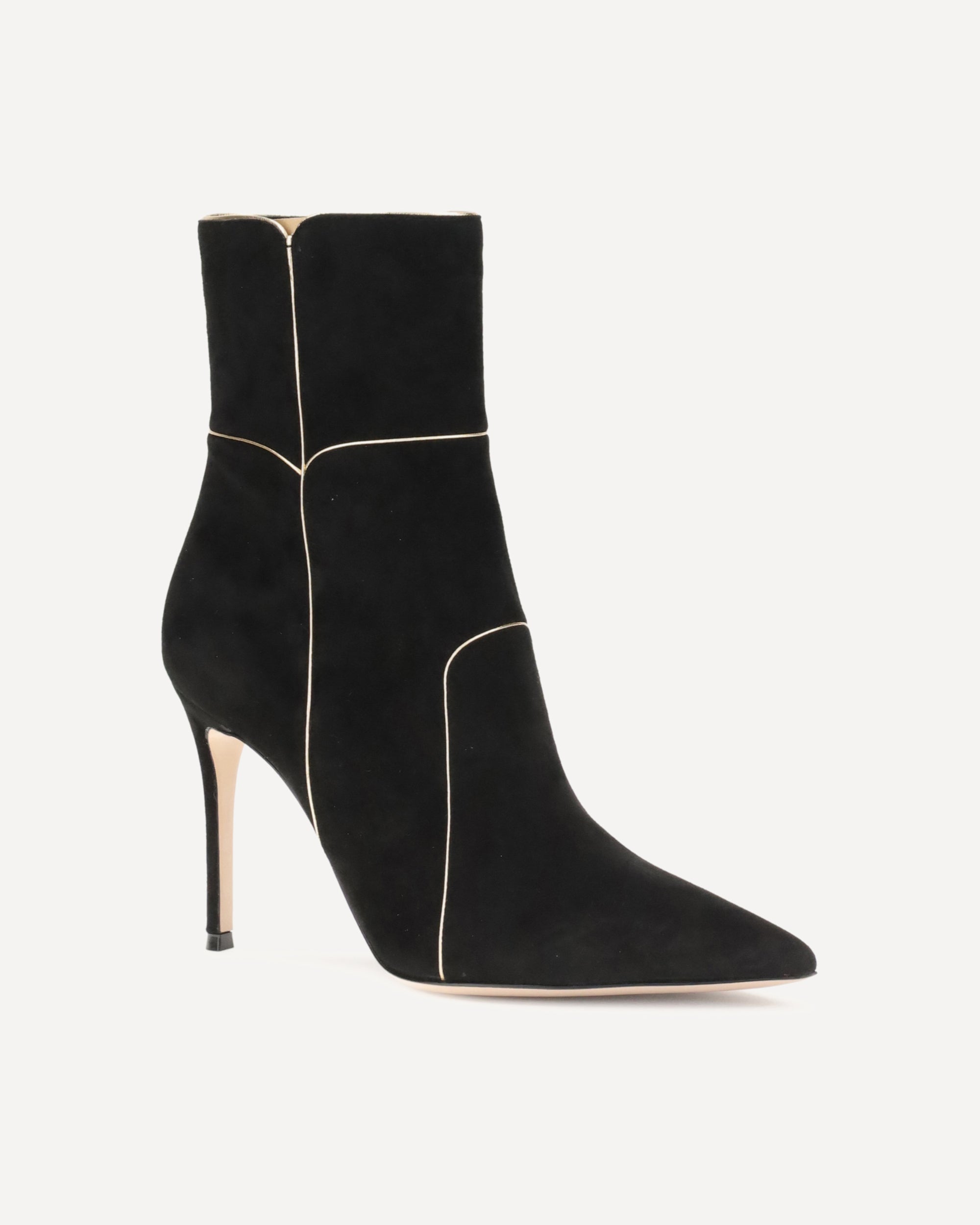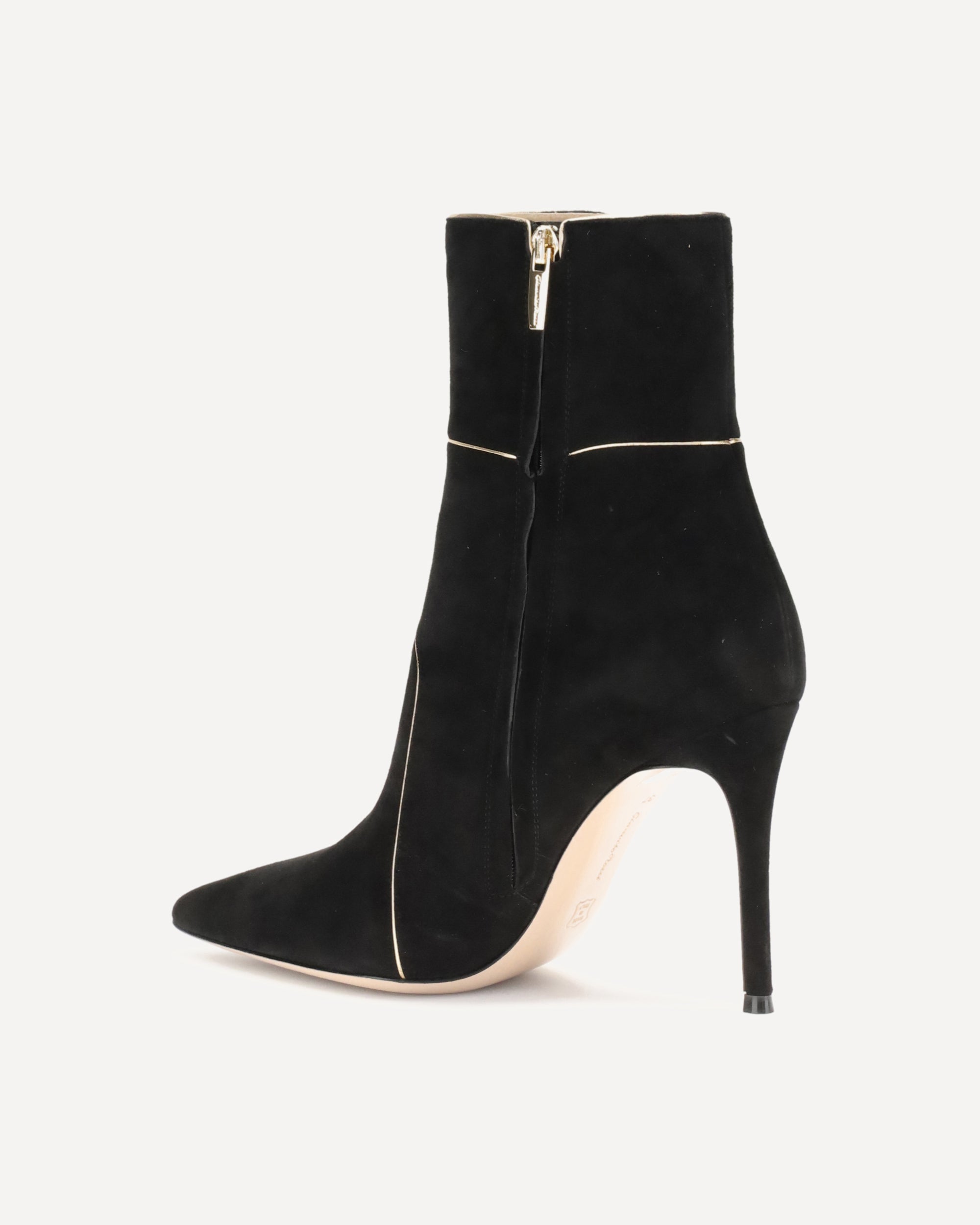 Gianvito Rossi's Suede Ankle Boots combine elegance and character in a refined design. With an above-ankle height and a tapered silhouette, they are enhanced by a stiletto heel and a figure-slimming almond toe. Metallic leather details add a bright, contemporary touch, perfect for completing sophisticated daytime and evening looks.