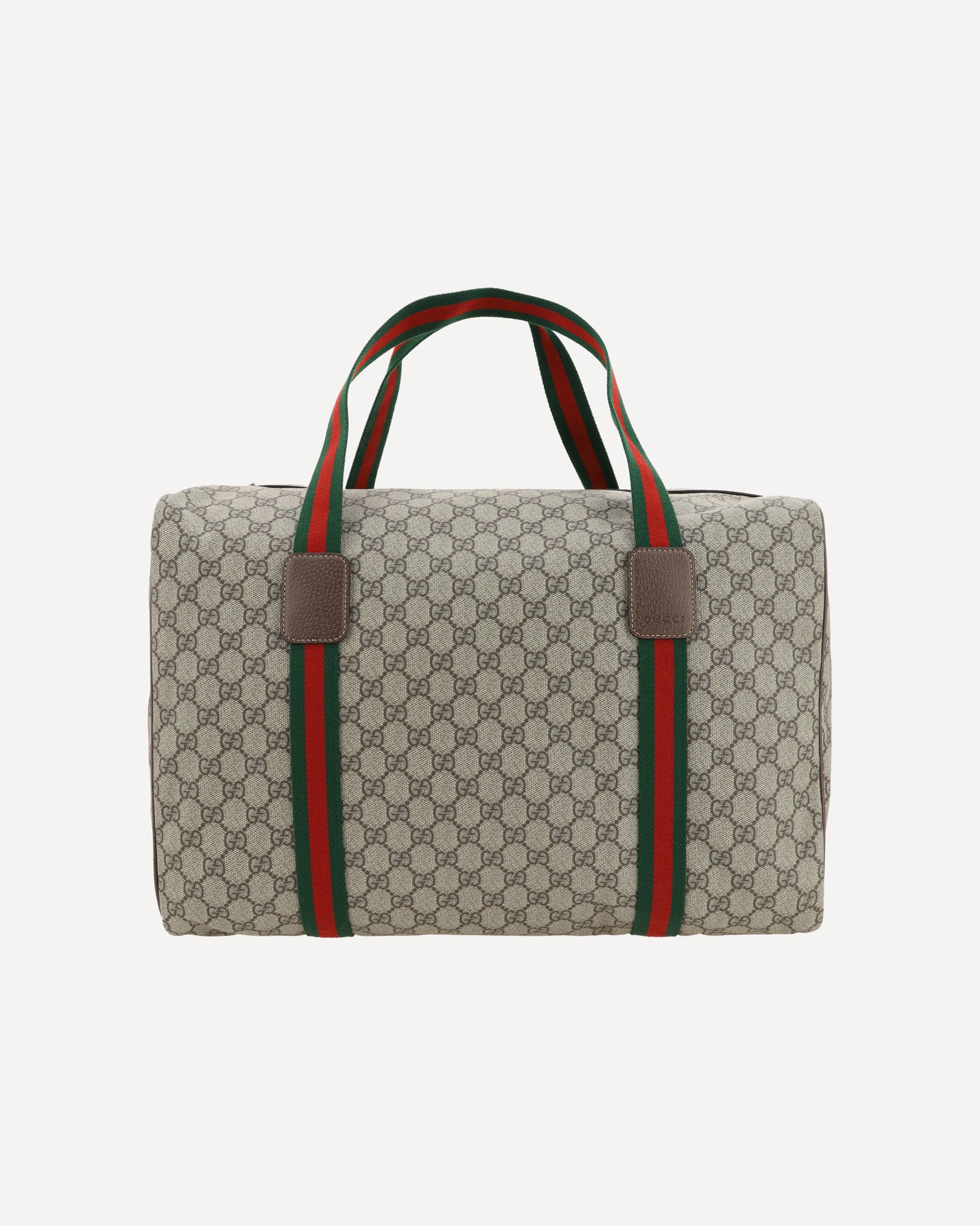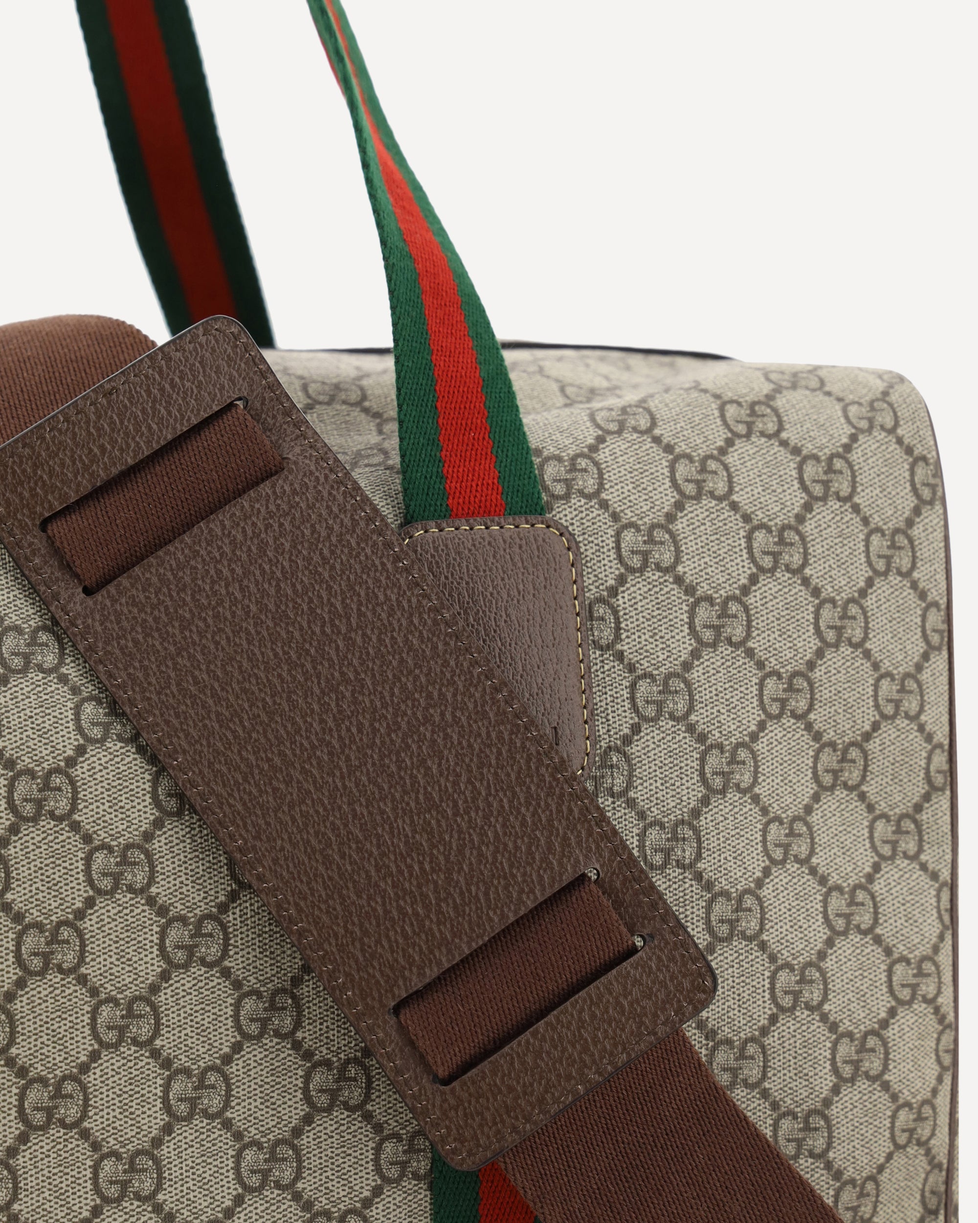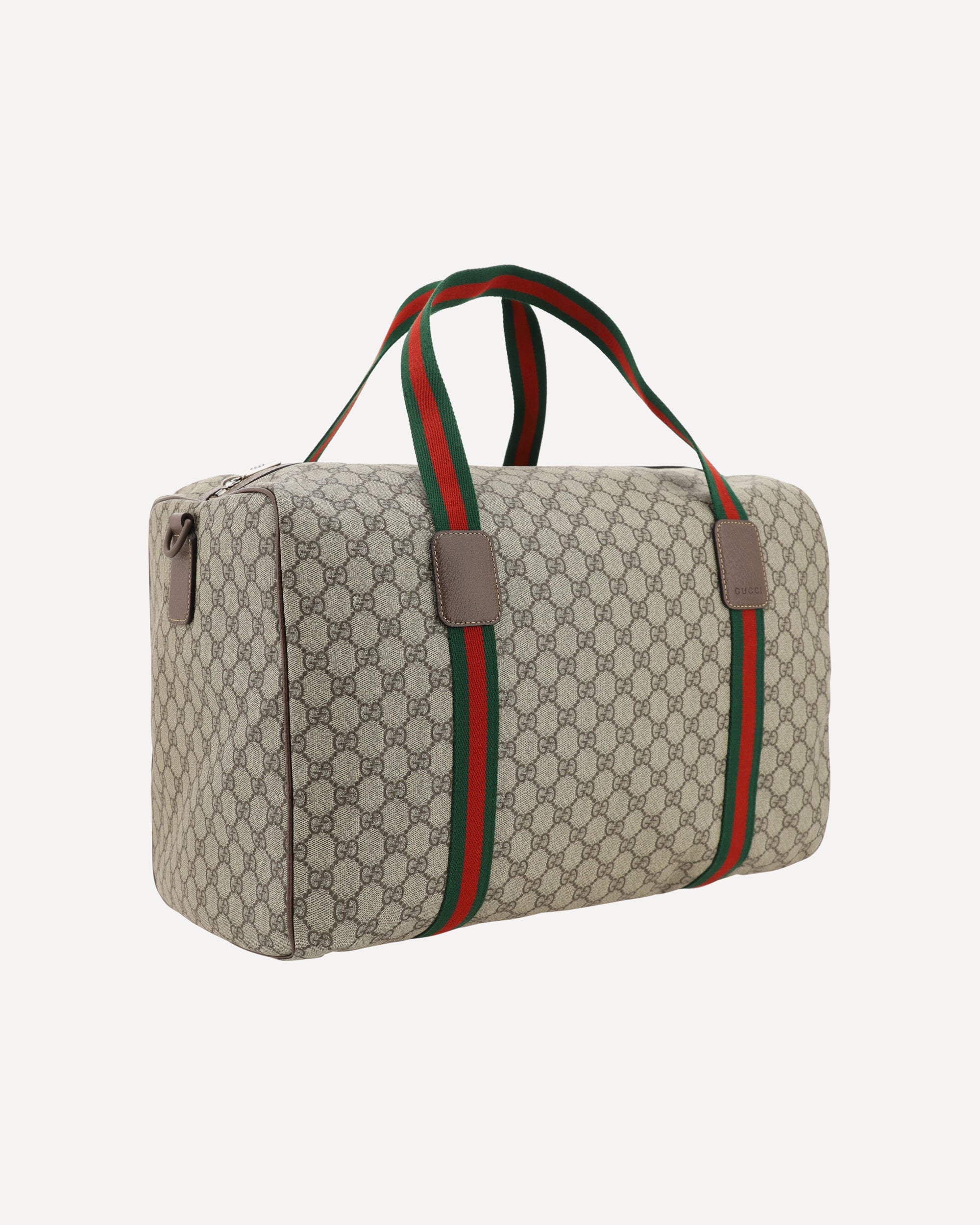 The Cotton GG Travel Bag by Gucci, leather trim, two top handles with iconic two-tone Web pattern extended on front and back, top zipper closure, iconic all-over printed GG Supreme graphic, adjustable and removable webing shoulder strap.