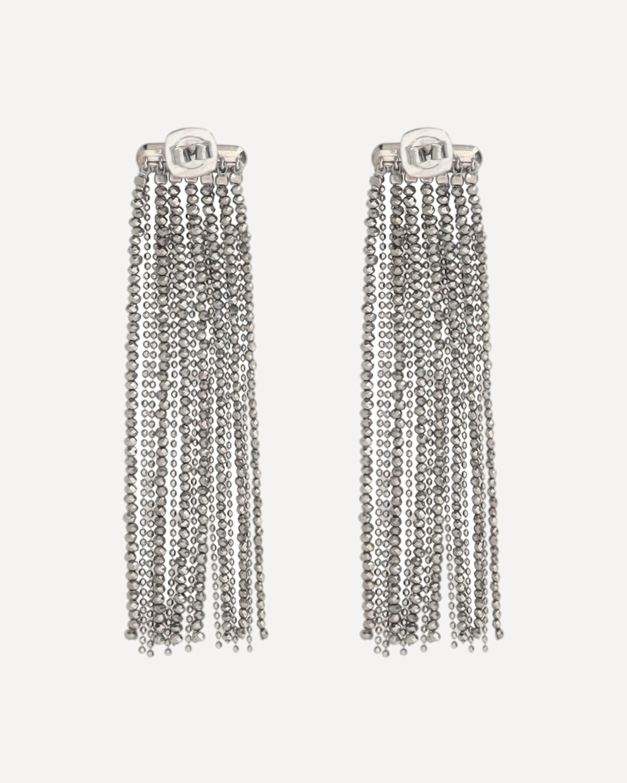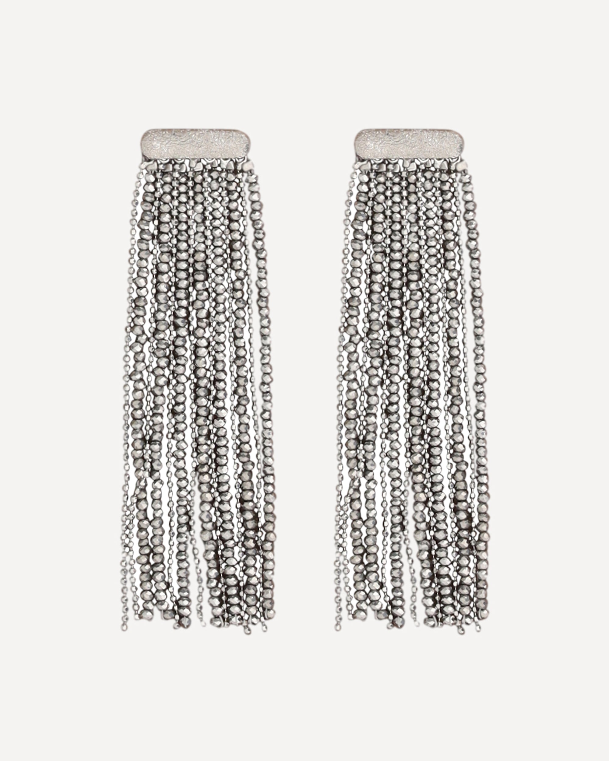 Glass and silver Earrings by Brunello Cucinelli, rows of small faceted-cut beads create a sinuous cascade that spreads radiant reflections with every movement to express a very refined feminine taste. The accessory is completed with a butterfly clasp.